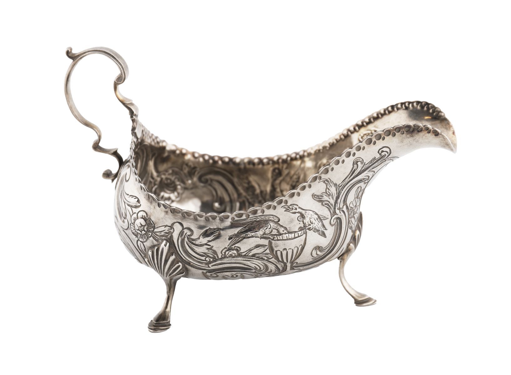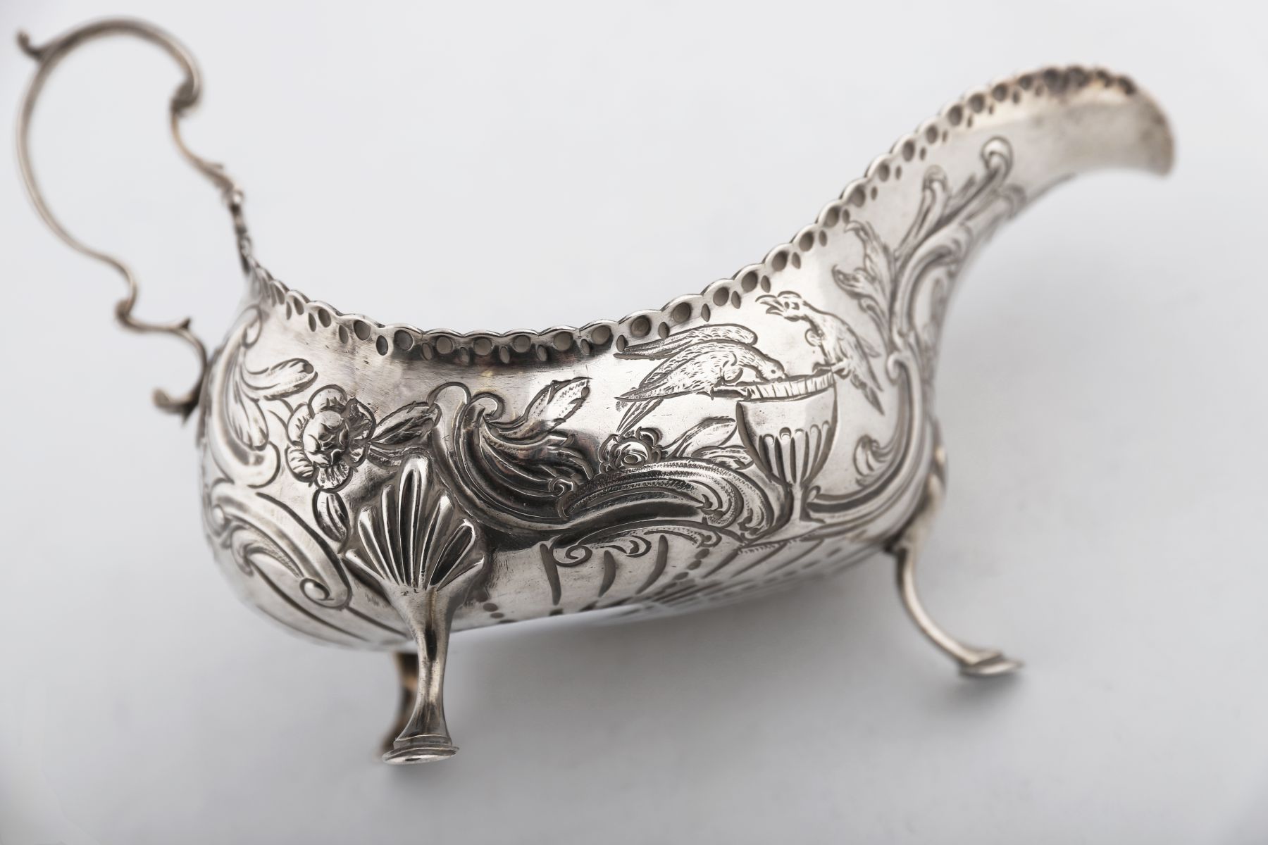 Maker: Daniel McCarthy, Cork, c.1775. Oval form with chased scrollwork, repousse decoration depicting exotic birds drinking from a cup, raised on slippered feet.