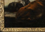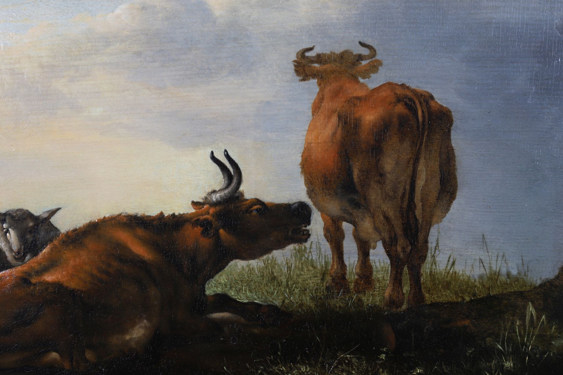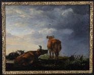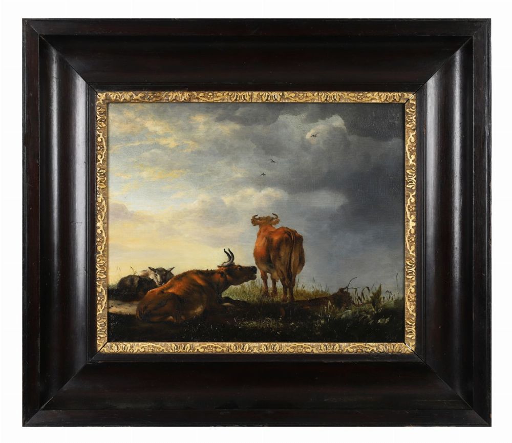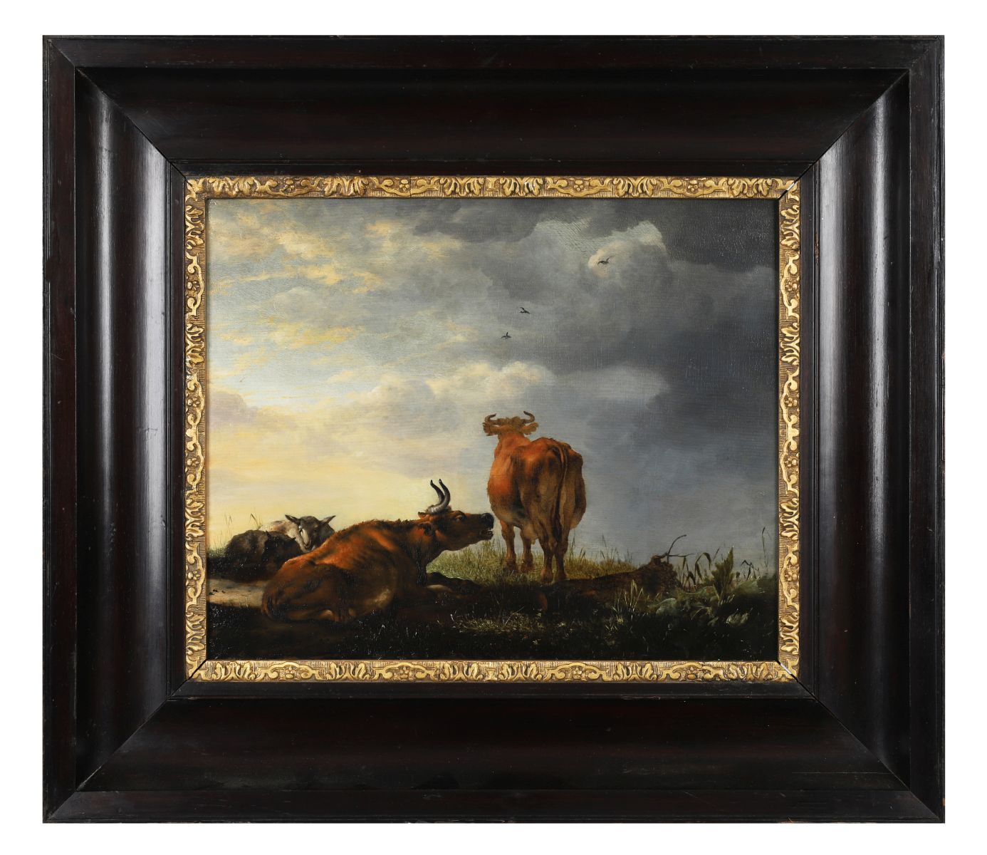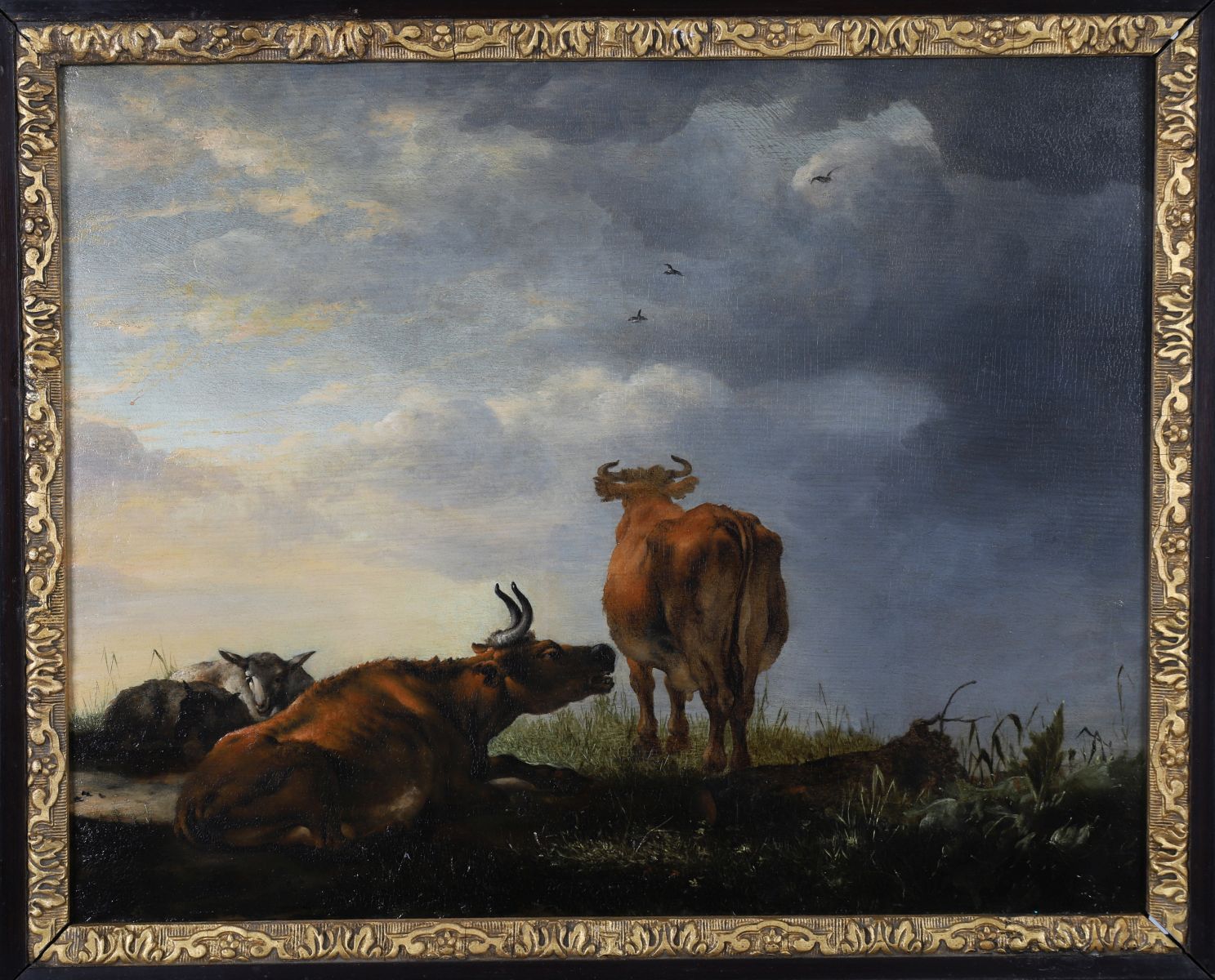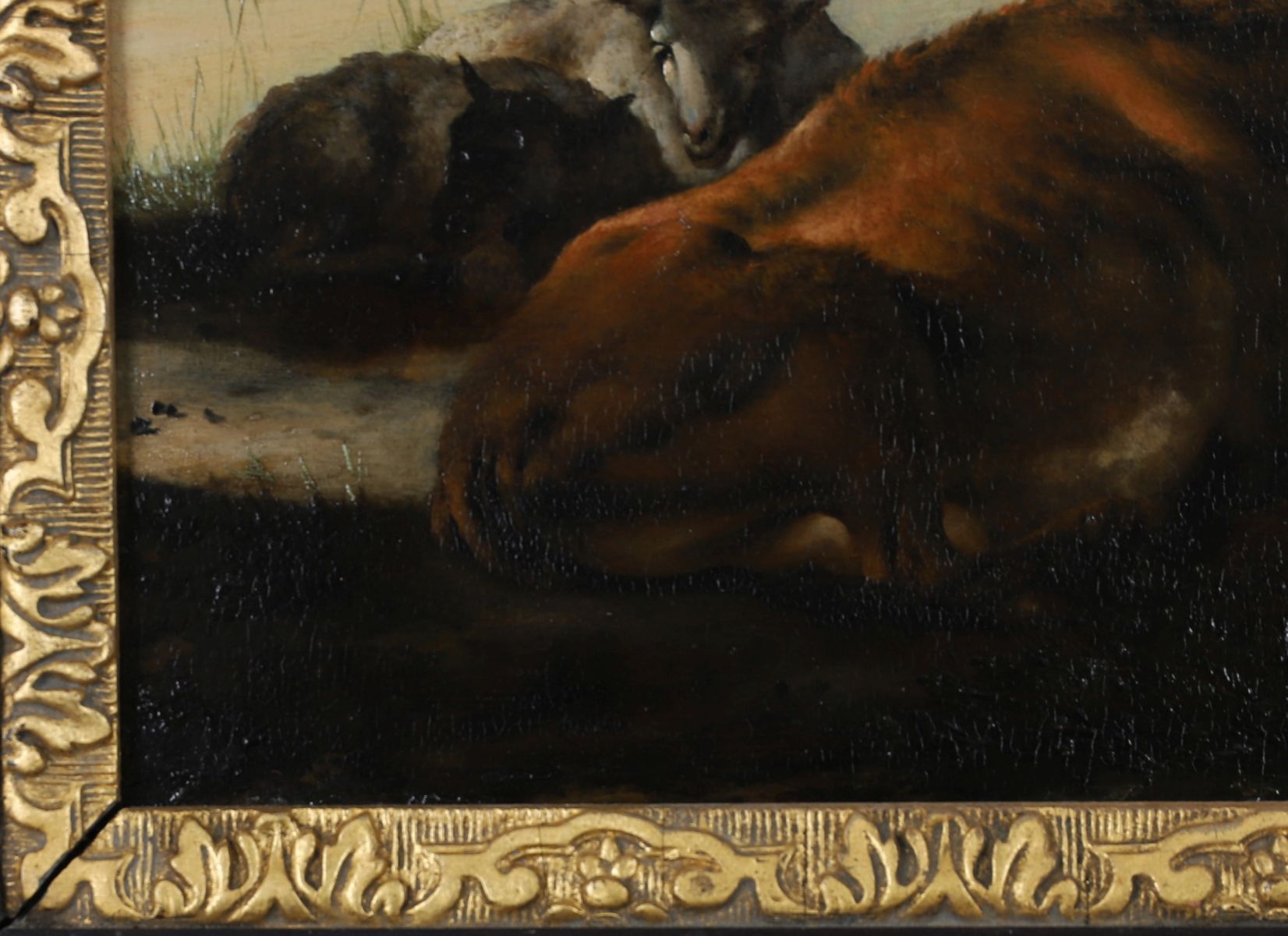 A pastoral composition featuring cattle and sheep resting on open ground under a partly cloudy sky. Oil on panel, signed below the leg of the foreground animal. Framed in a dark moulded frame with gilt inner slip.