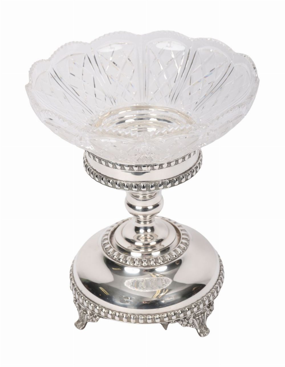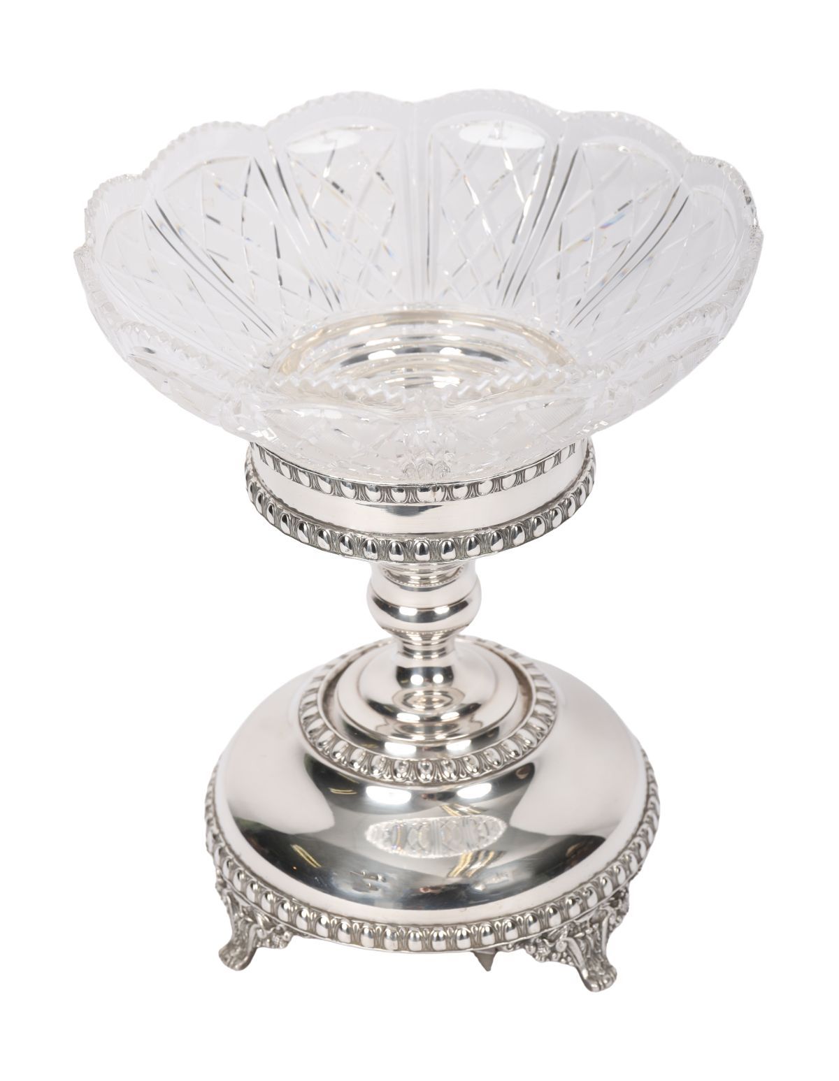 A fine crystal and silverplate centrepiece, the cut glass bowl raised on an ornate stem and circular base with gadrooned and beaded decoration. Raised on four scroll feet.