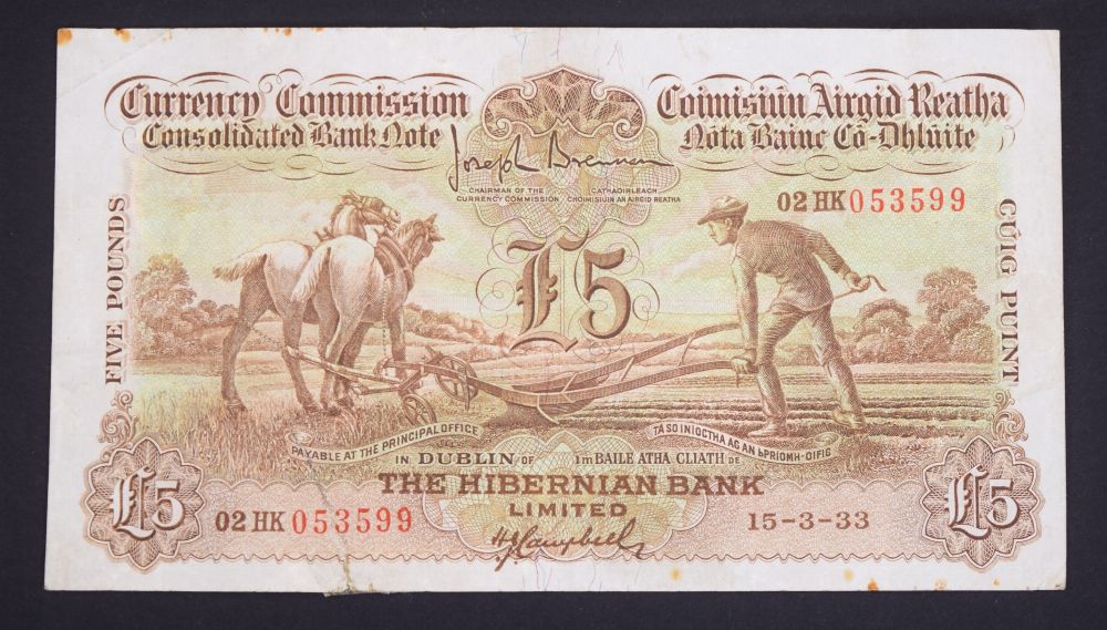 Irish Ploughman issue, printed under the Currency Commission Consolidated Bank series, issued through The Hibernian Bank. The “Ploughman†notes were first issued in 1929 and remained in circulation until 1953, featuring Lough Erne and a farmer ploughing with horses on the reverse. This example is a five pound denomination dated 15 March 1933, serial 02 HK 053599.