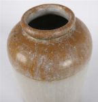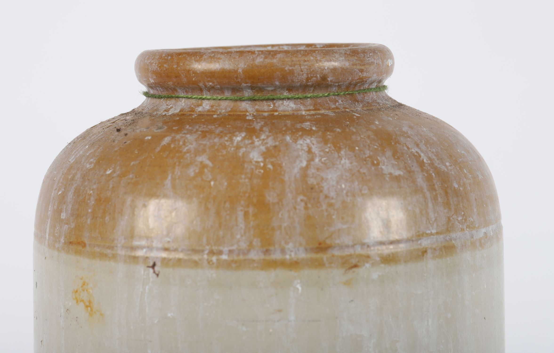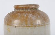 with two-tone glaze, the upper section in warm ochre and the body in a pale cream glaze. The jar has a short collar rim and shows natural surface wear and patination from age and use.