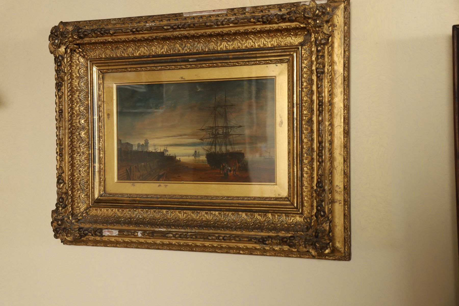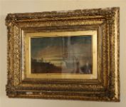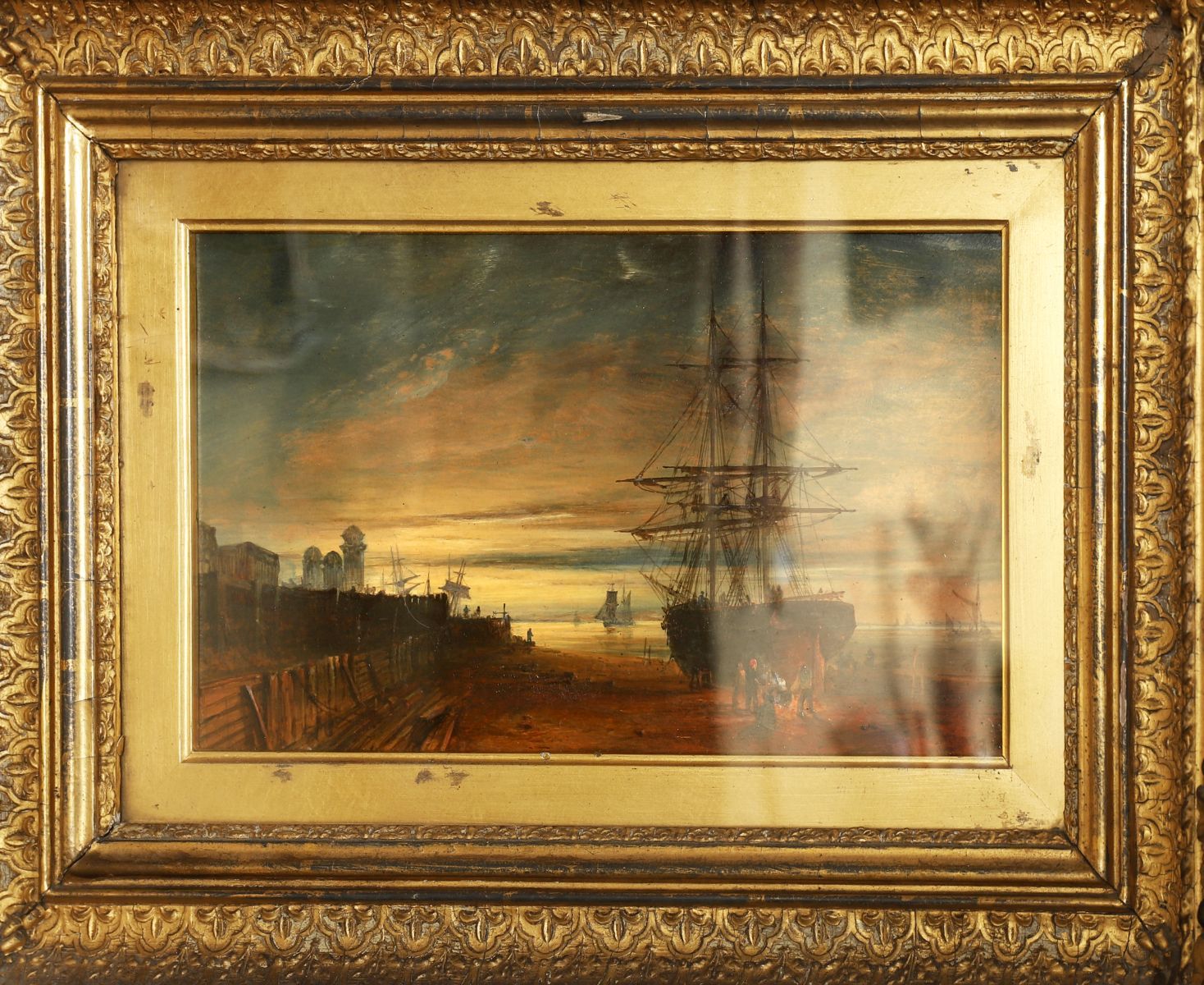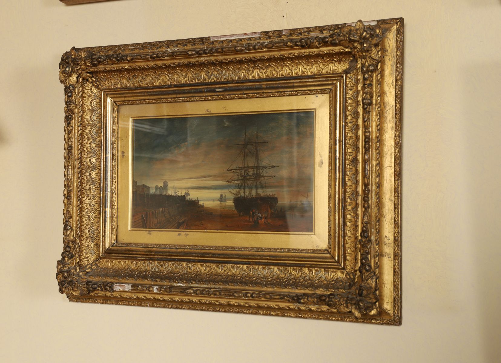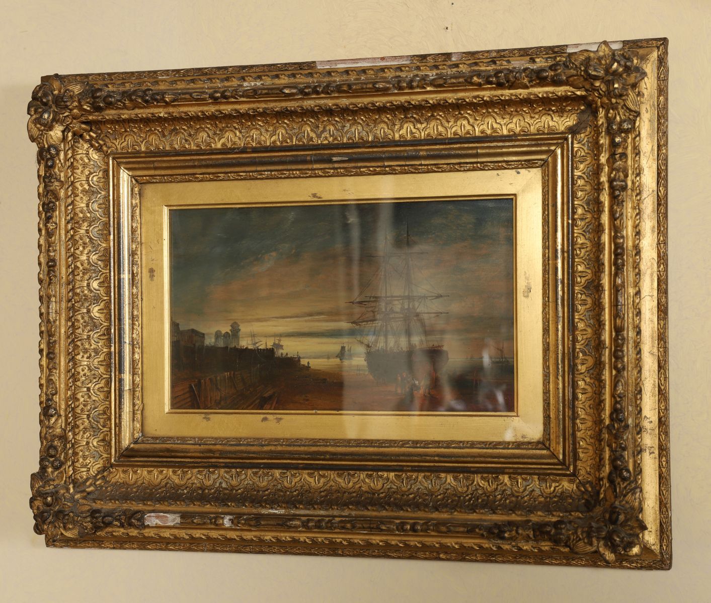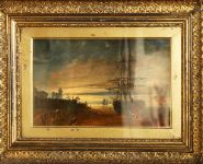 Oil on panel, depicting a moonlit view of Wapping Harbour with shipping and dockside buildings under a nocturnal sky. Signed D. Hardy and dated 1847. Presented in a gilt moulded frame. Circa 1847.