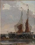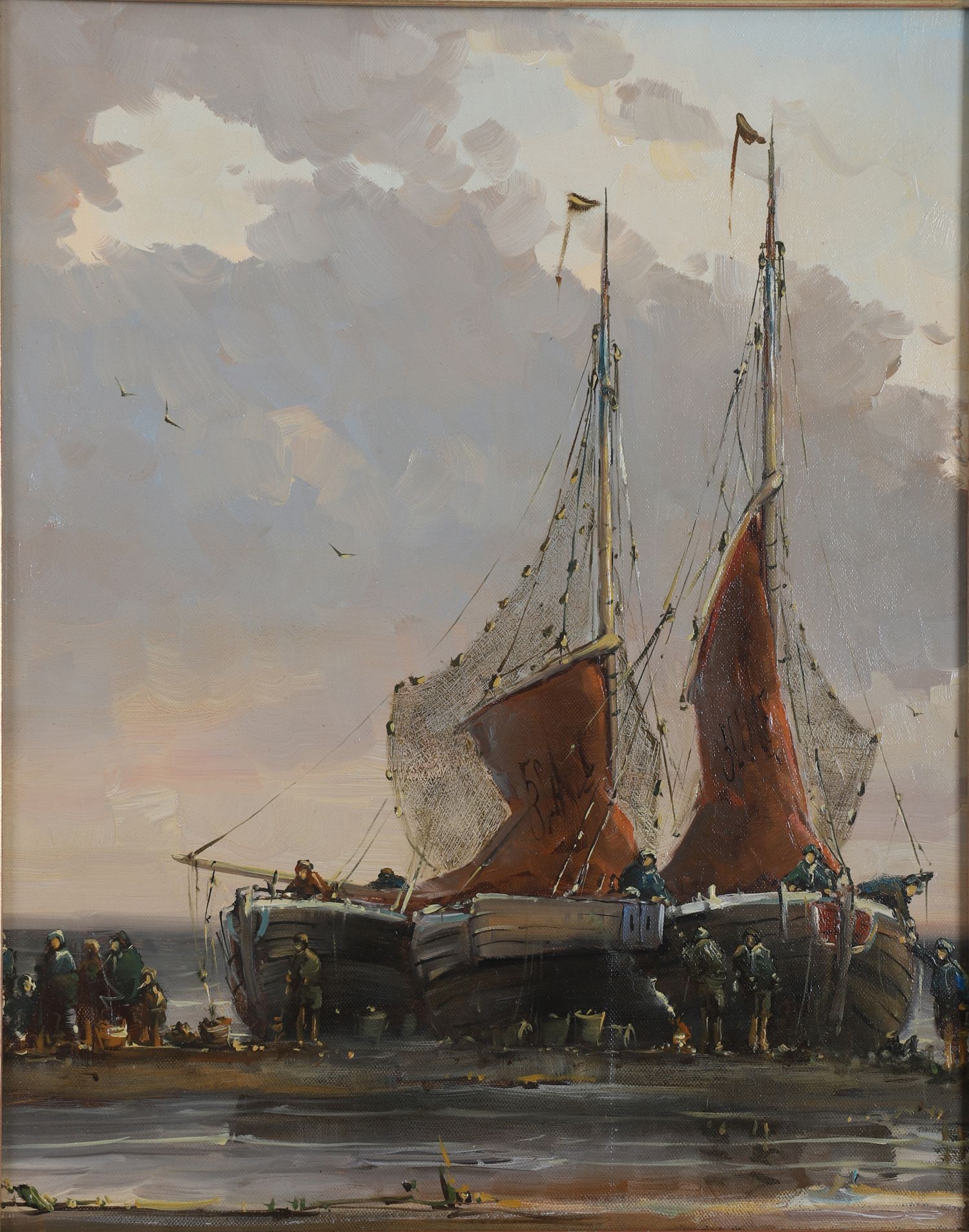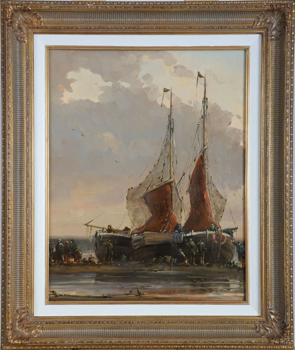 Oil painting depicting two large fishing boats with red sails drawn up on the shore, with figures working in the foreground. Framed in gilt and white moulded frame. Oil on board.