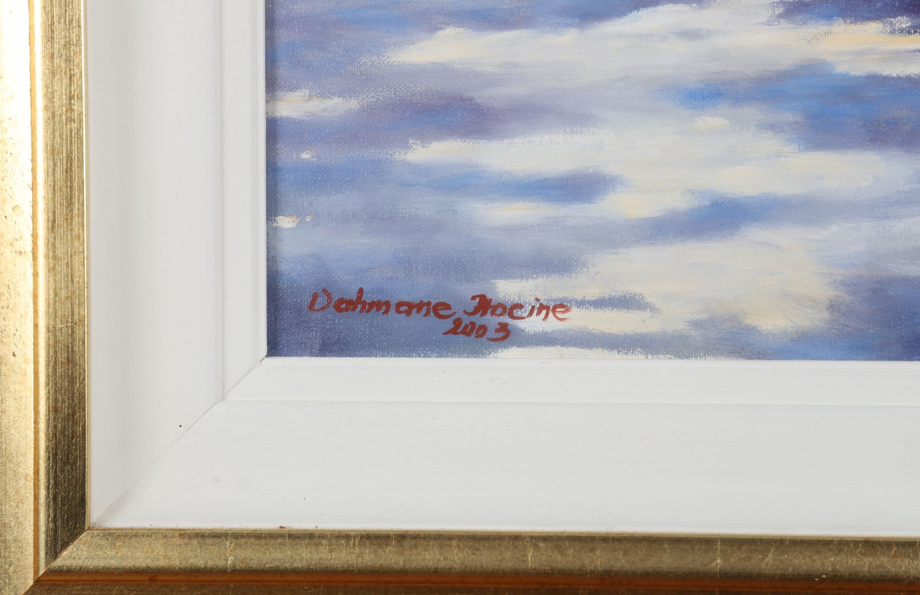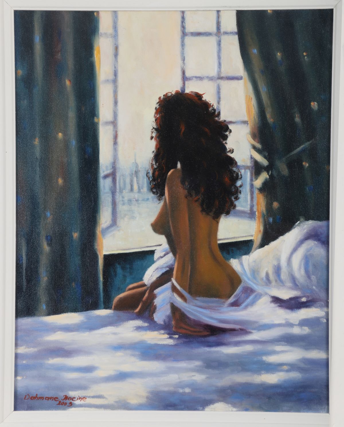 Dahmane Hocine, Femme à la Fenêtre, 2003, oil on canvas, depicting a seated woman gazing through a window. Signed and dated lower left, framed.