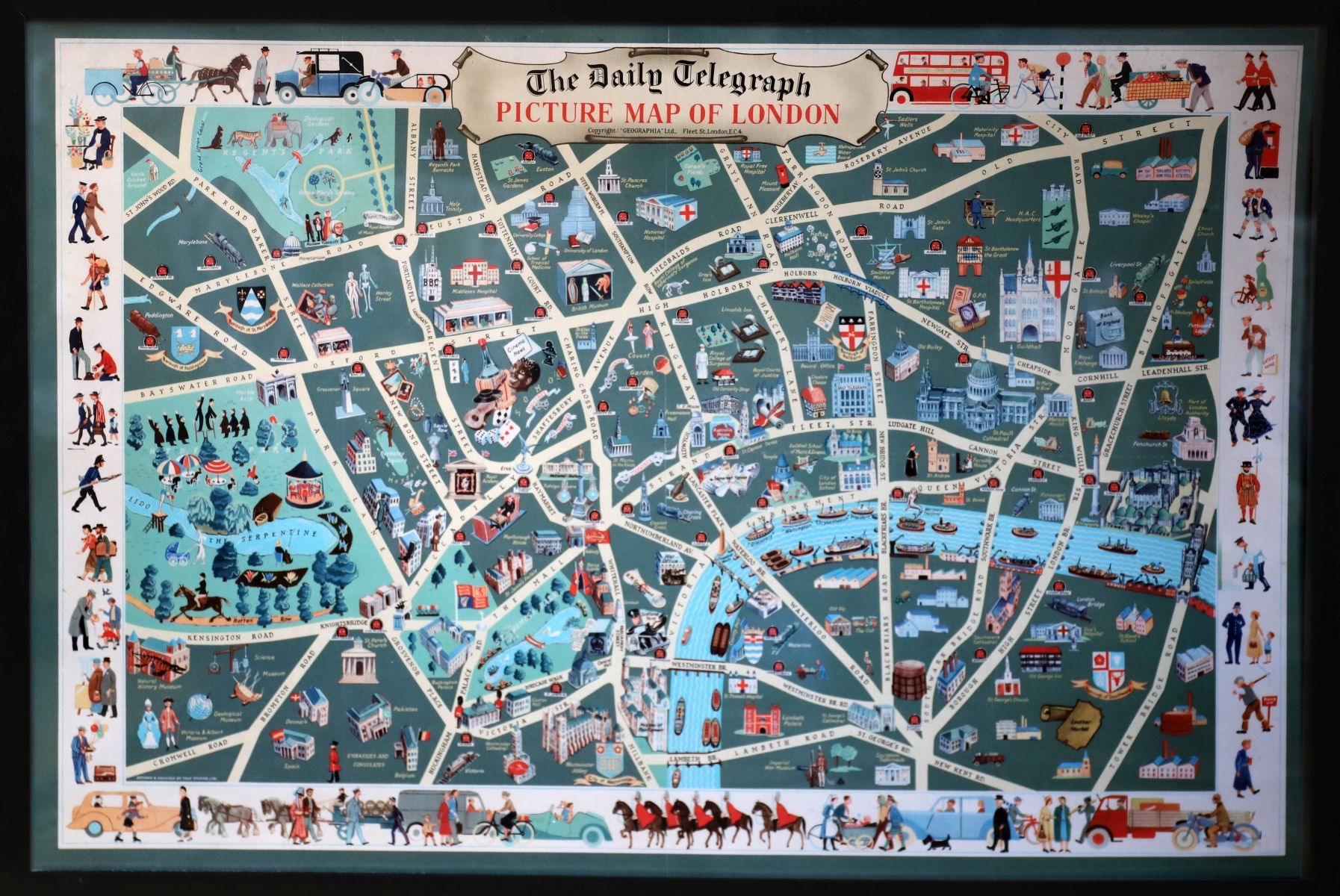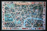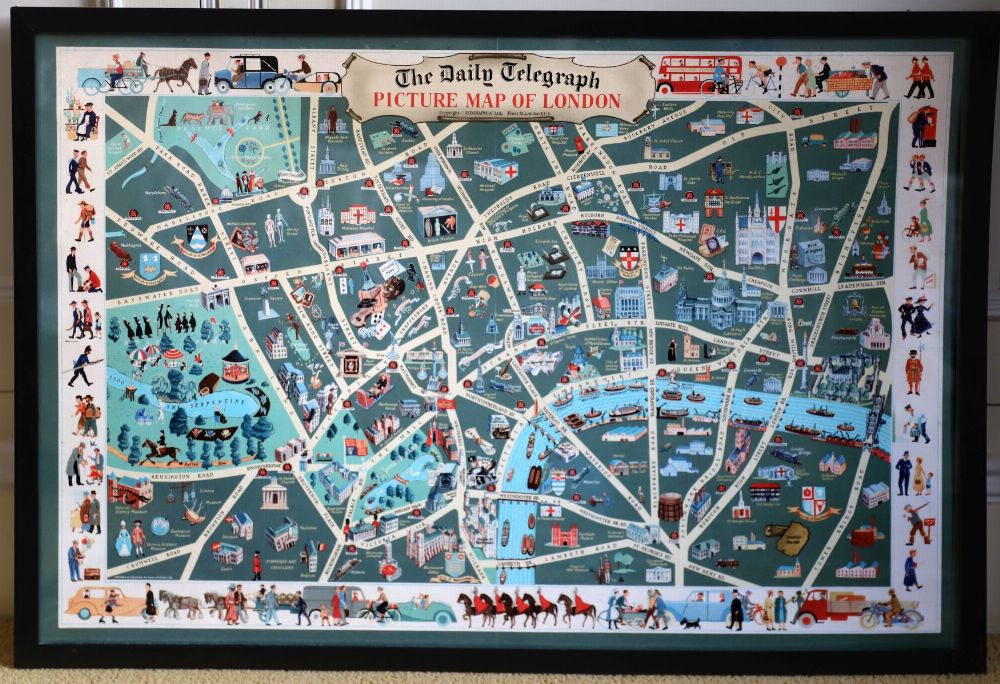 “The Daily Telegraph Picture Map of London,†a printed pictorial map depicting London landmarks and streets, framed and glazed.