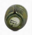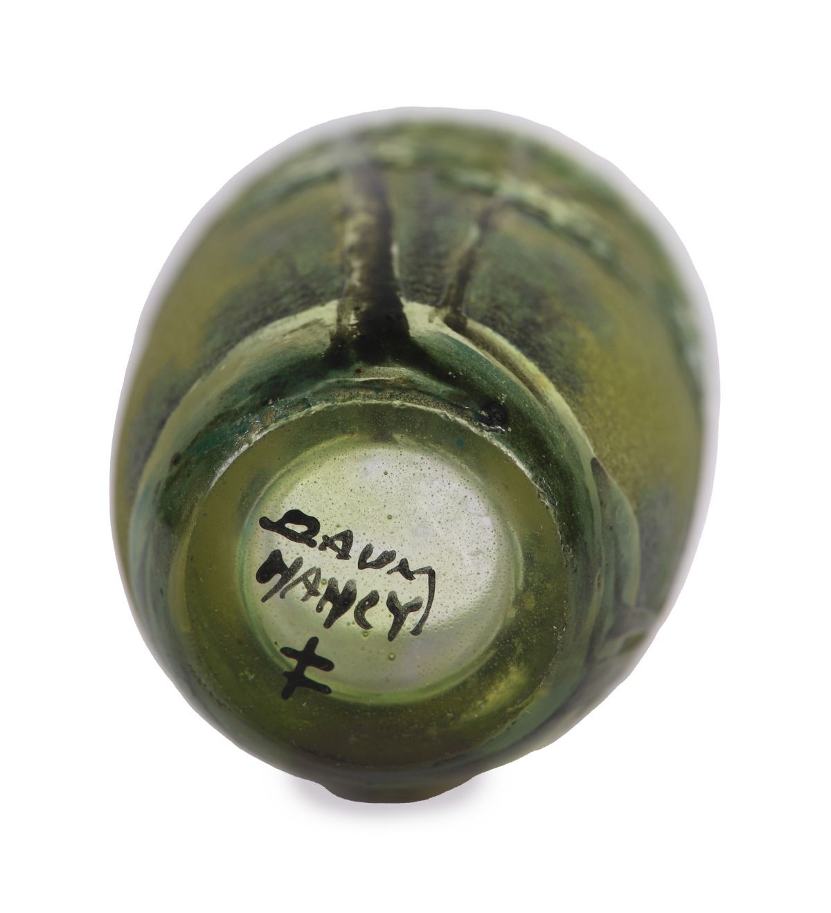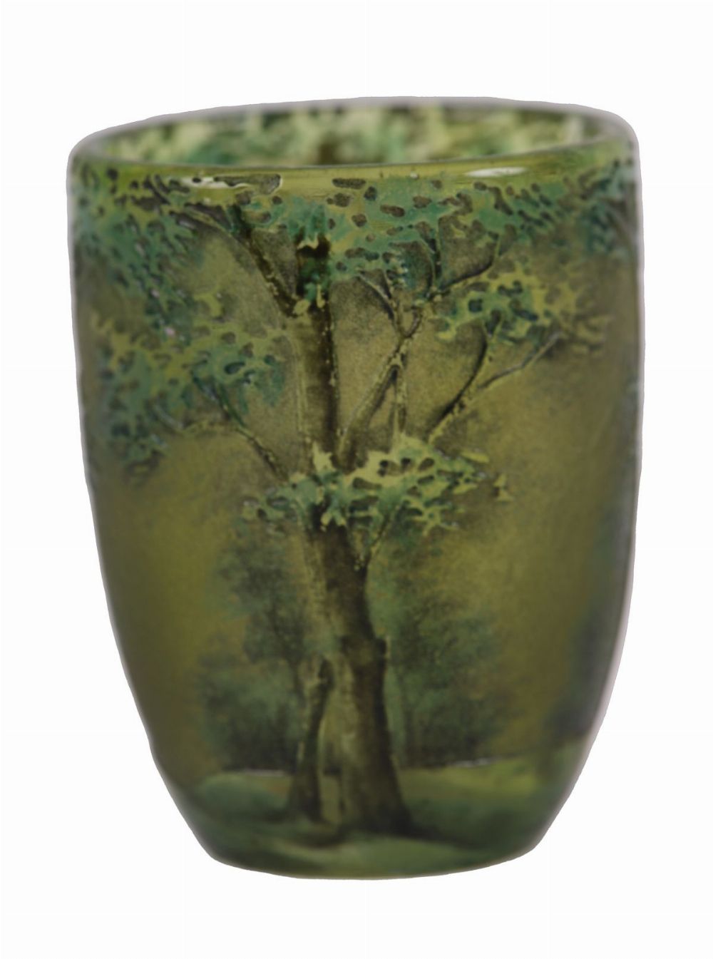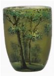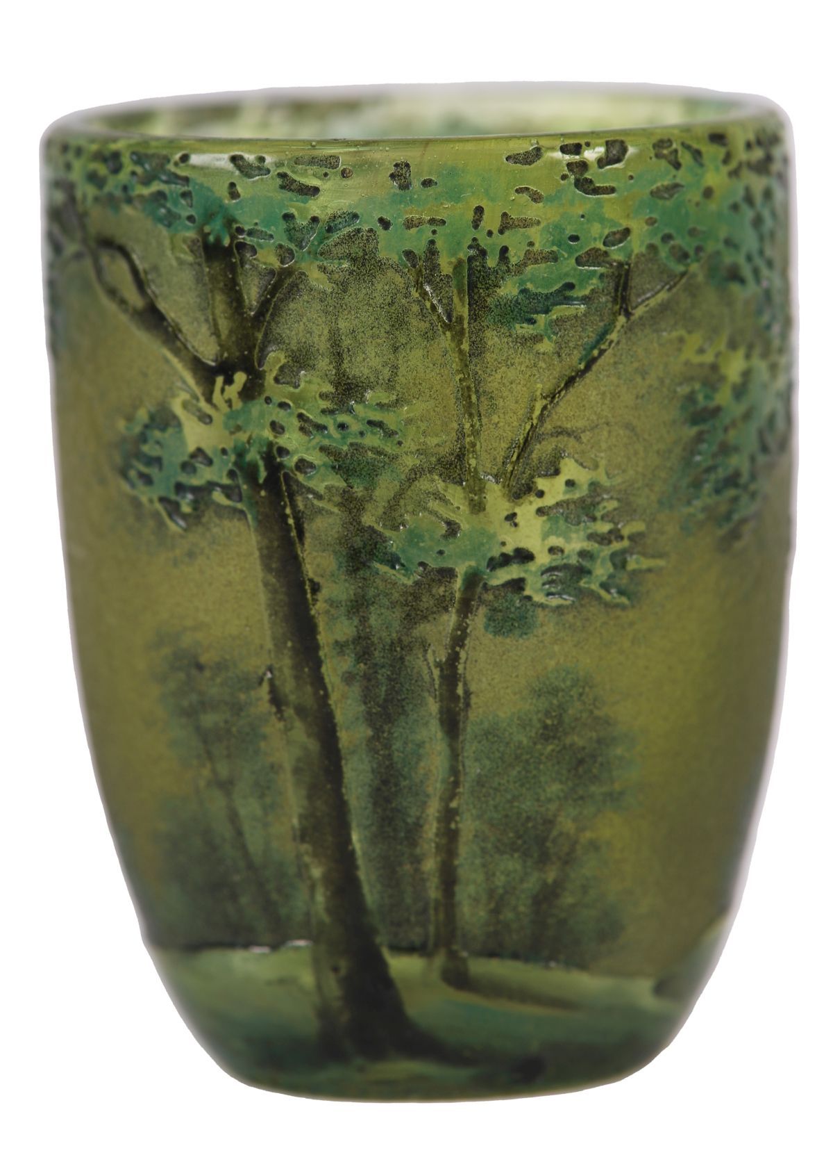 A small Daum cameo glass vase, acid-etched with a wooded landscape motif in tones of green and ochre.