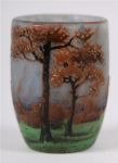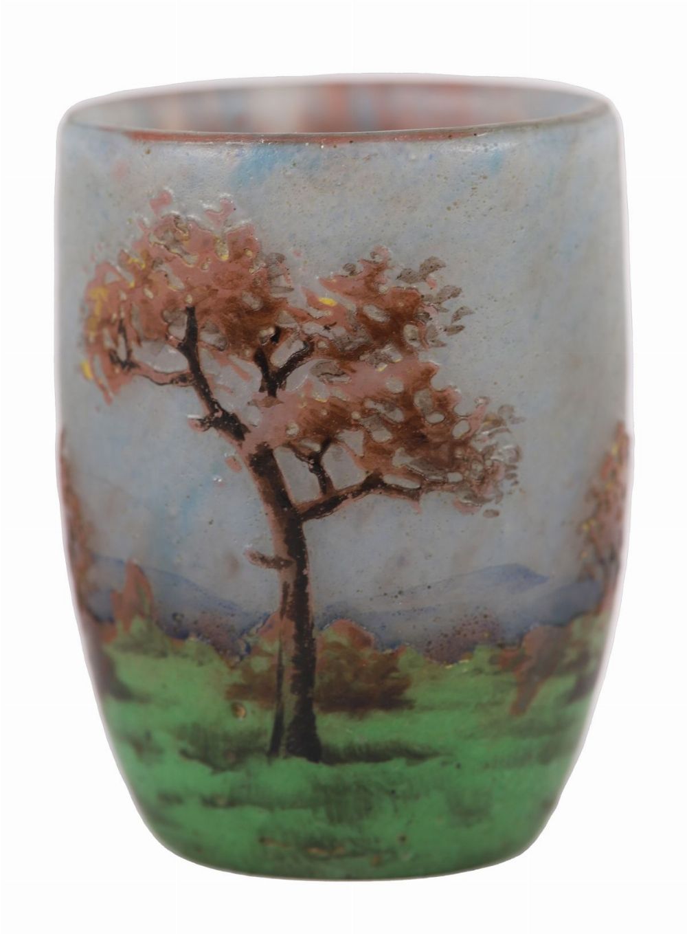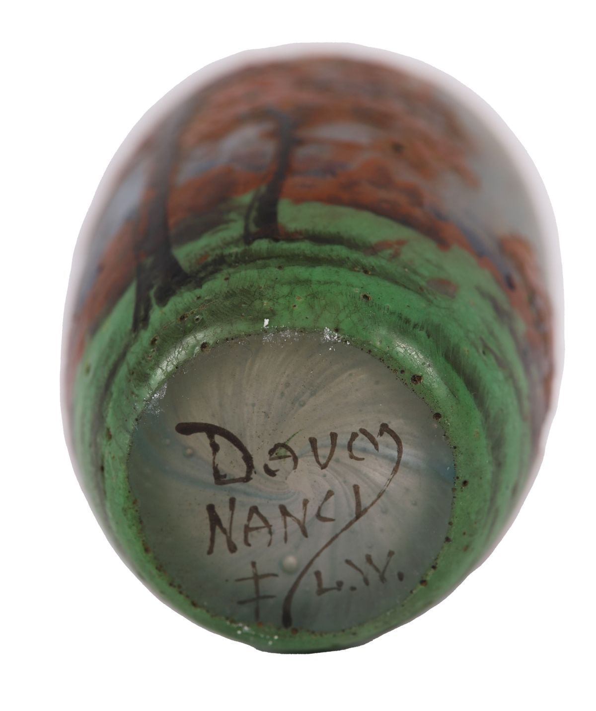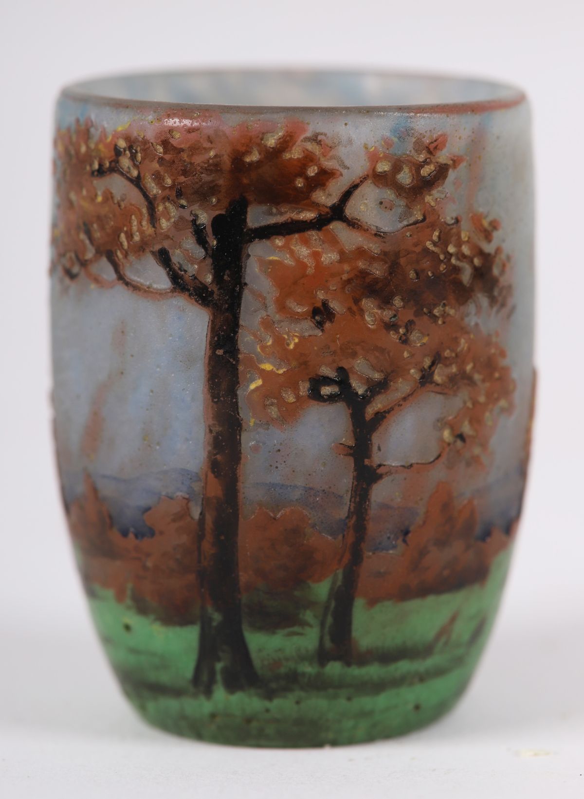 A Daum cameo glass vase with an autumnal landscape scene, acid-etched through a layered blue, amber, and green ground.