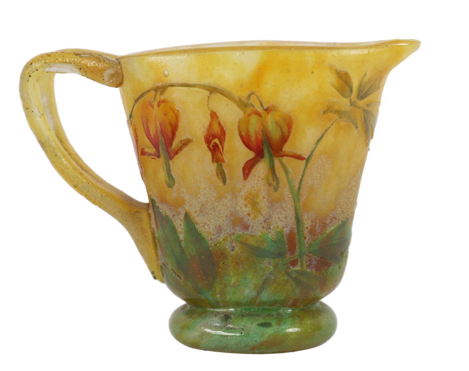 Of baluster form with applied handle, the glass acid-etched and enamelled with flowering plants and foliage on a shaded ground.