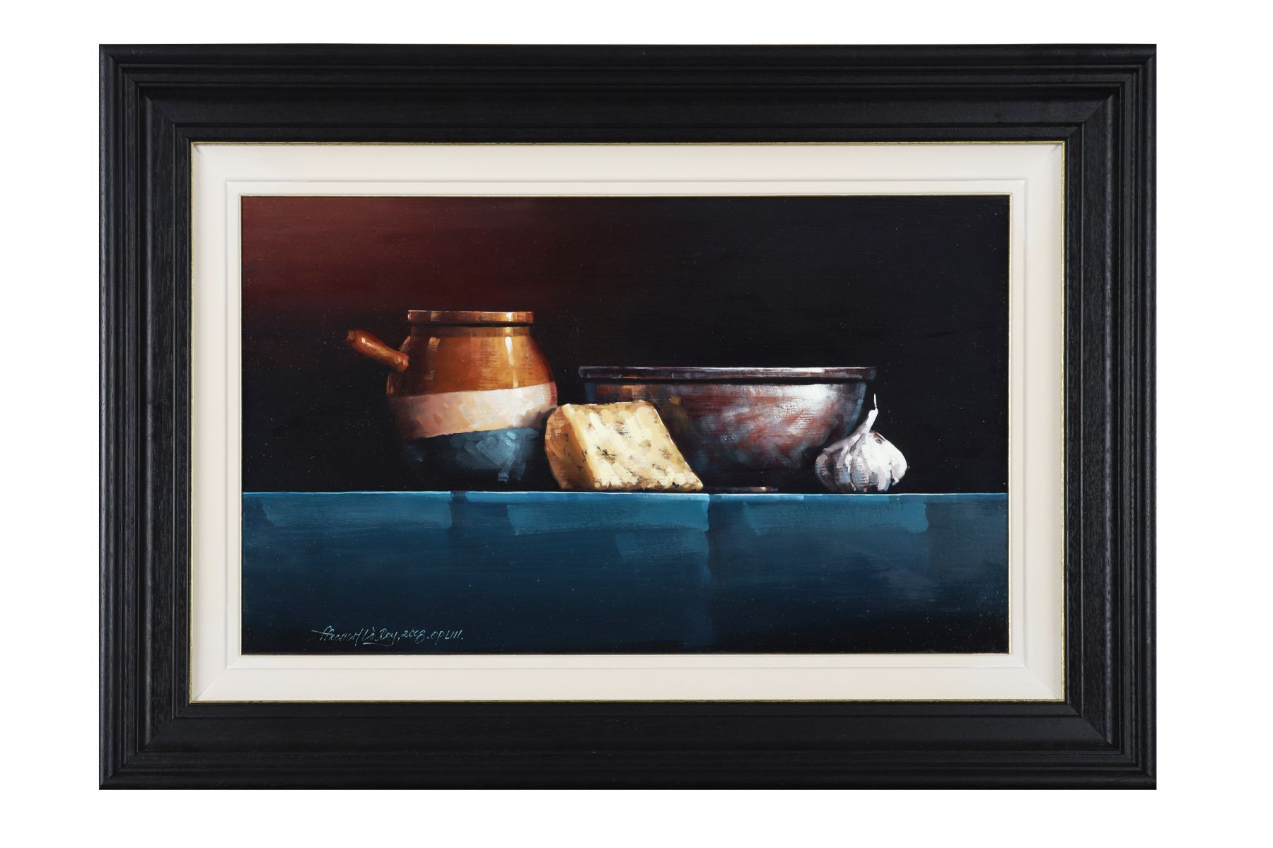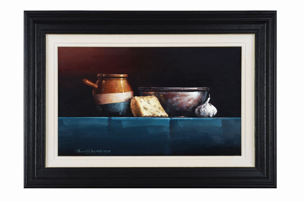 A finely detailed oil on board by David French Le Roy depicting a still life arrangement of a glazed pot, cheese, ceramic bowl, and garlic on a blue surface against a dark background. The artist’s meticulous rendering and delicate play of light evoke the calm precision of classical realism. Signed lower left and dated 2008. Presented in a black and cream moulded frame.