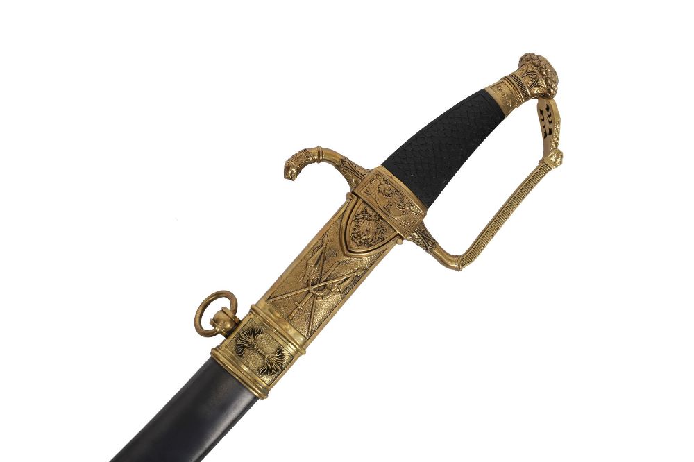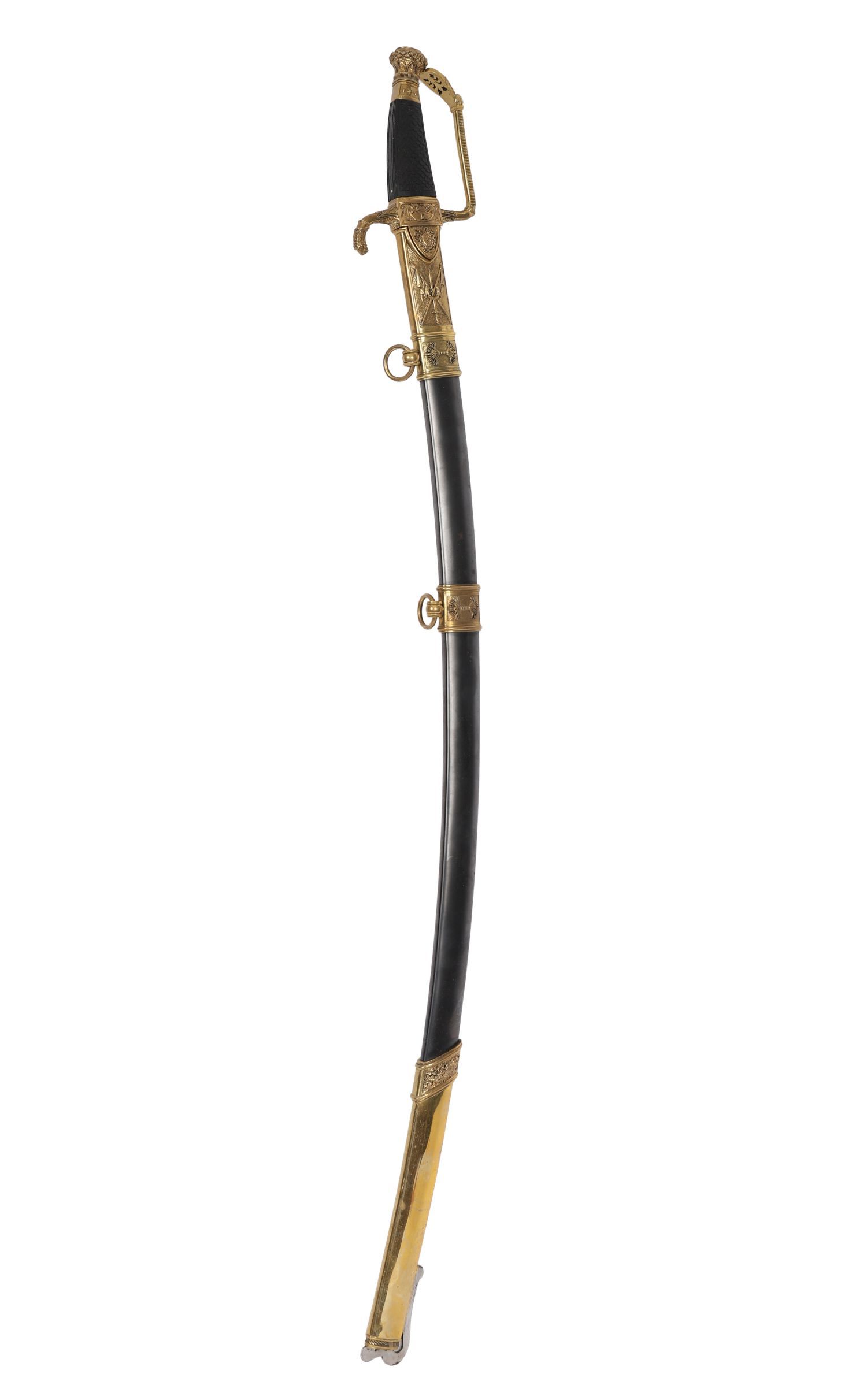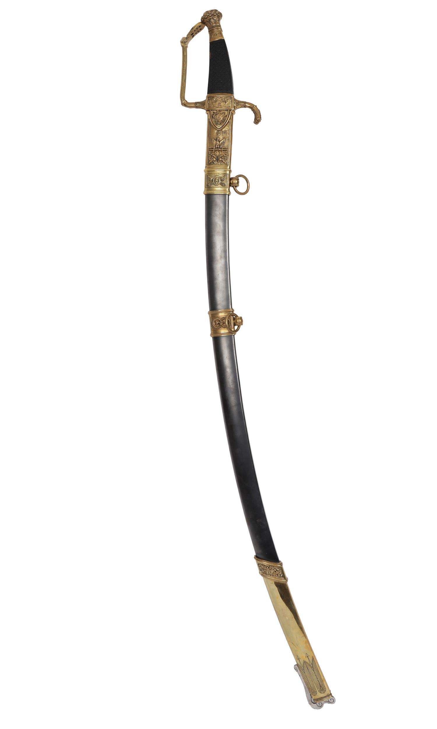 A highly ornate presentation sword, the straight single-edged blue steel blade decorated with gilt foliate scrolls, martial trophies, and laurel wreath motifs. The gilt brass hilt with knuckle guard, shell guard, and wire-bound black grip, the pommel cast with laurel and acanthus detailing. Complete with black scabbard fitted with gilt mounts cast with crossed swords, laurel sprays, and heraldic emblems, each mount with suspension rings.