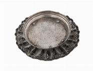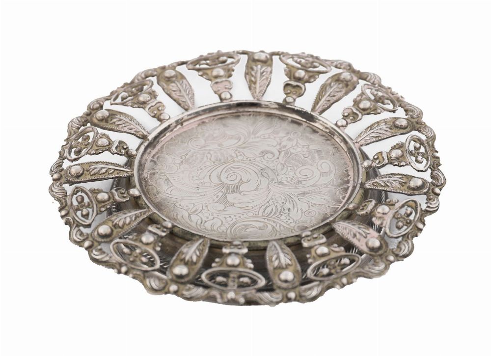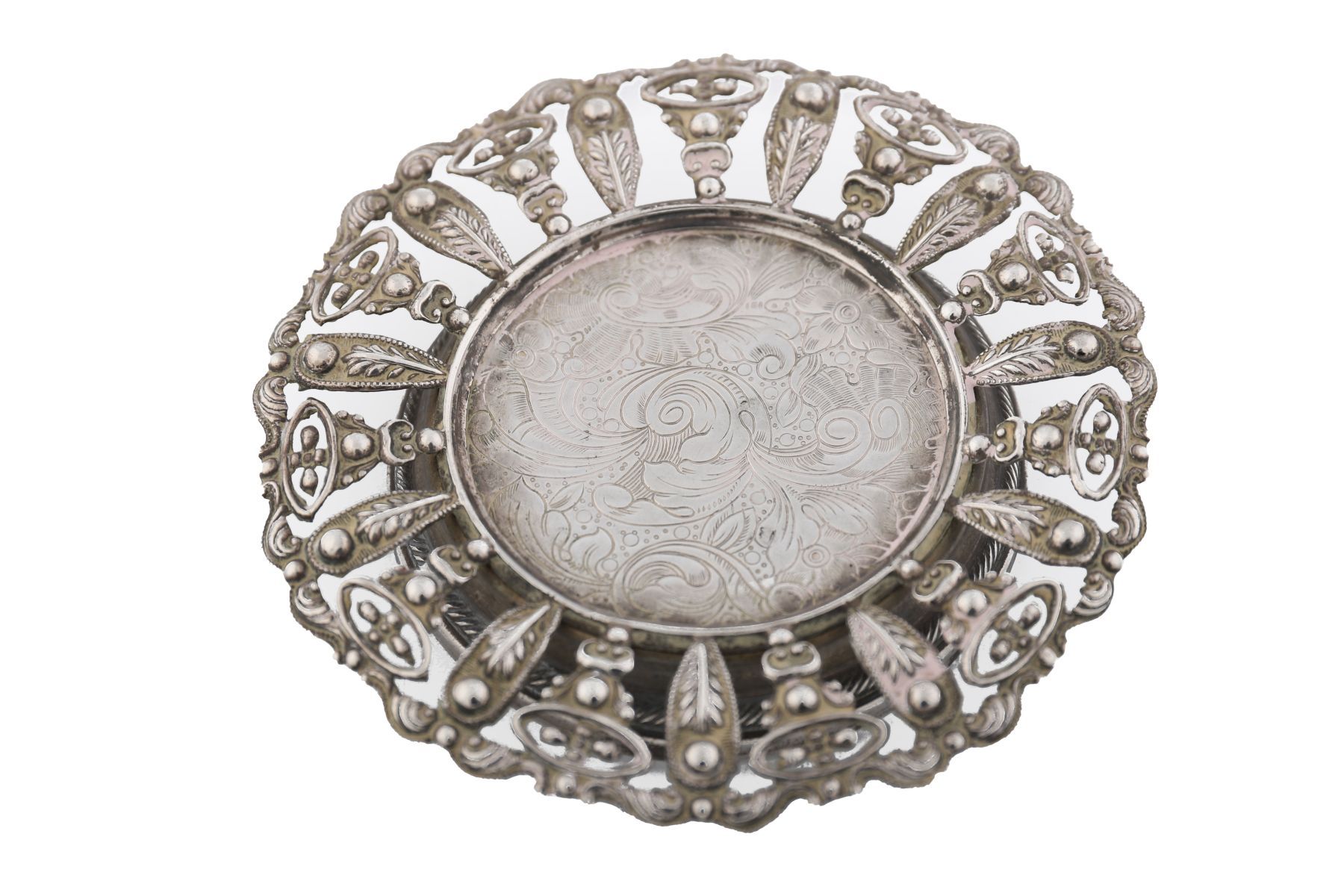 A circular decorative silver bonbon or trinket dish with pierced and chased floral border and scroll engraved centre. 76 grams.