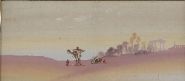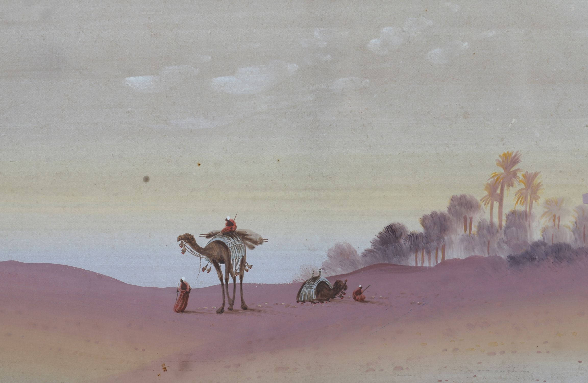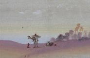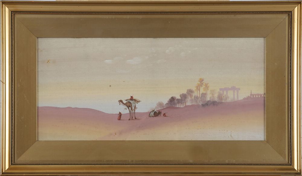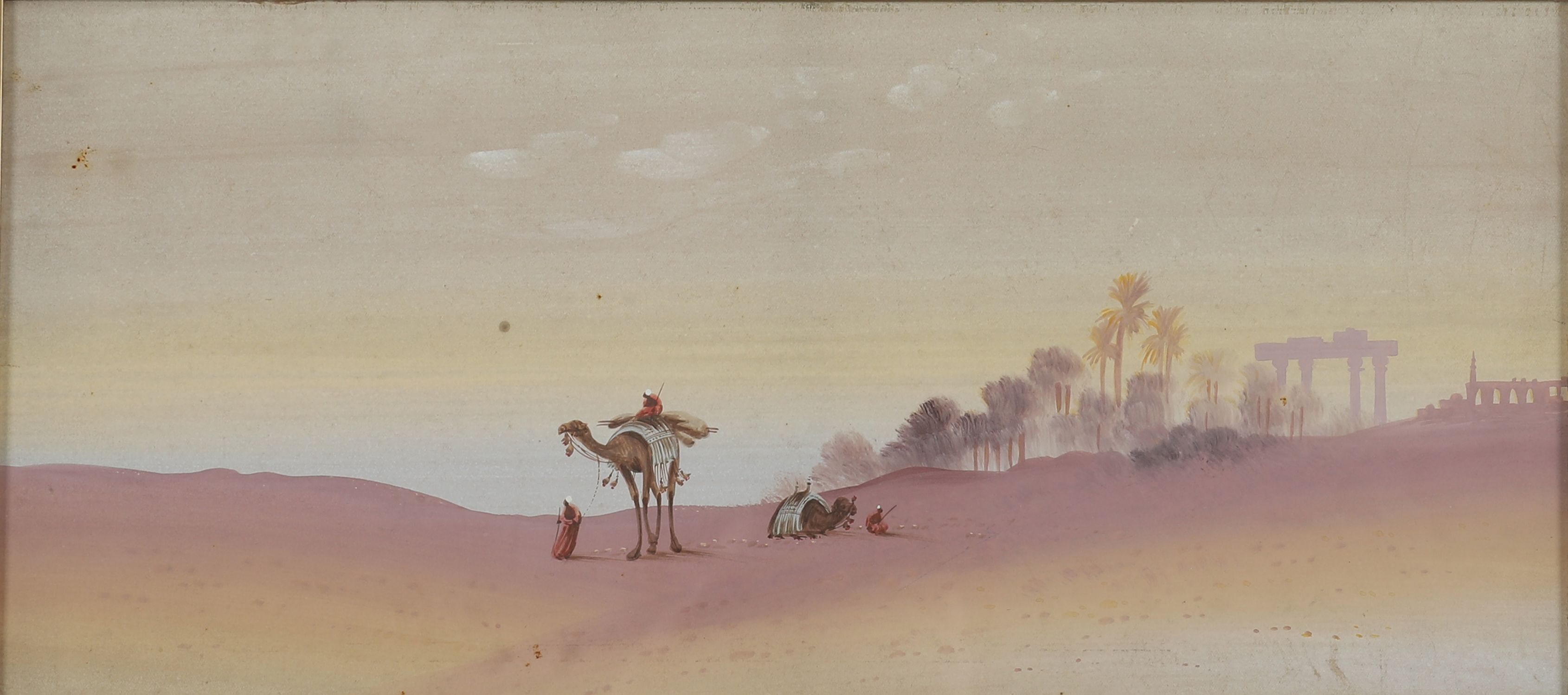 A finely executed watercolour of an oriental desert scene with figures, camels, and palm trees in the distance. Soft pastel tones and distant ruins lend it an atmospheric stillness.