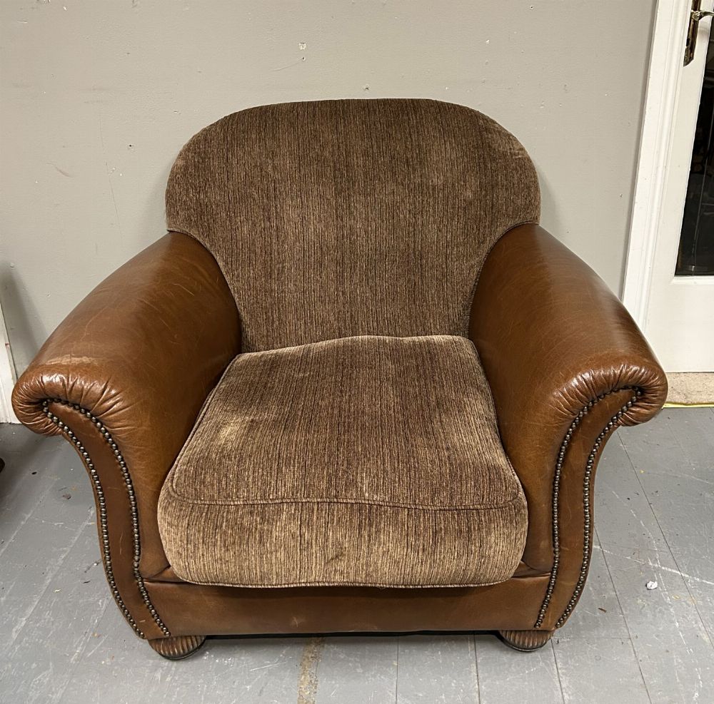 Designer armchair upholstered in brown leather with textured chenille fabric seat and back cushion. Featuring rolled arms, studded borders, and plush loose cushions.