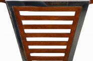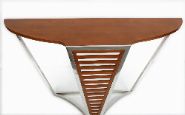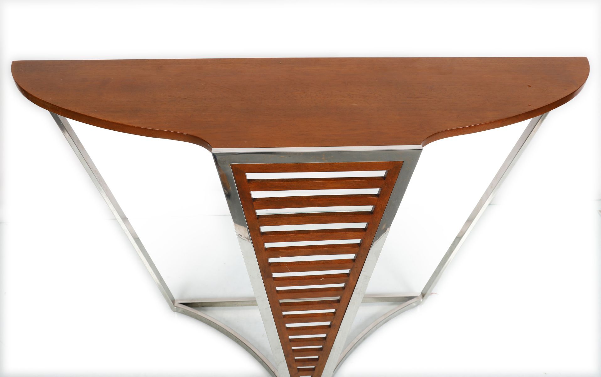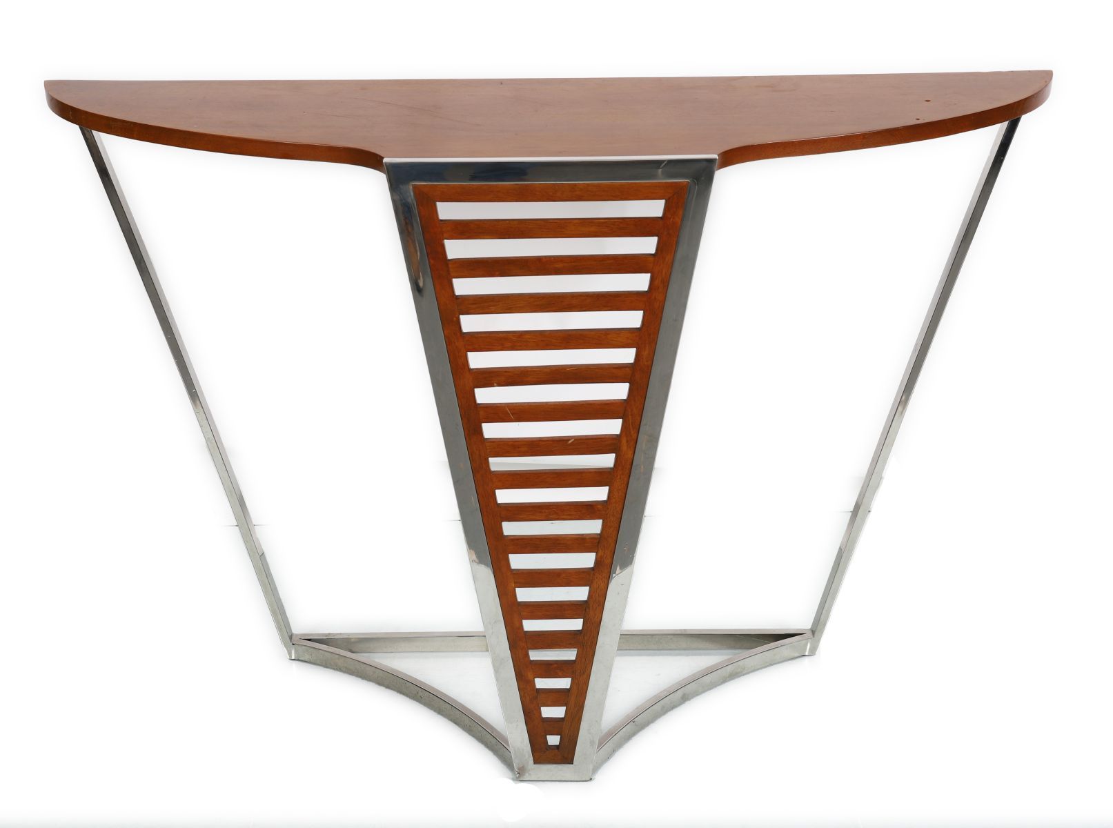 A designer Art Deco design console table, the shaped cherrywood top supported by a geometric chrome frame.