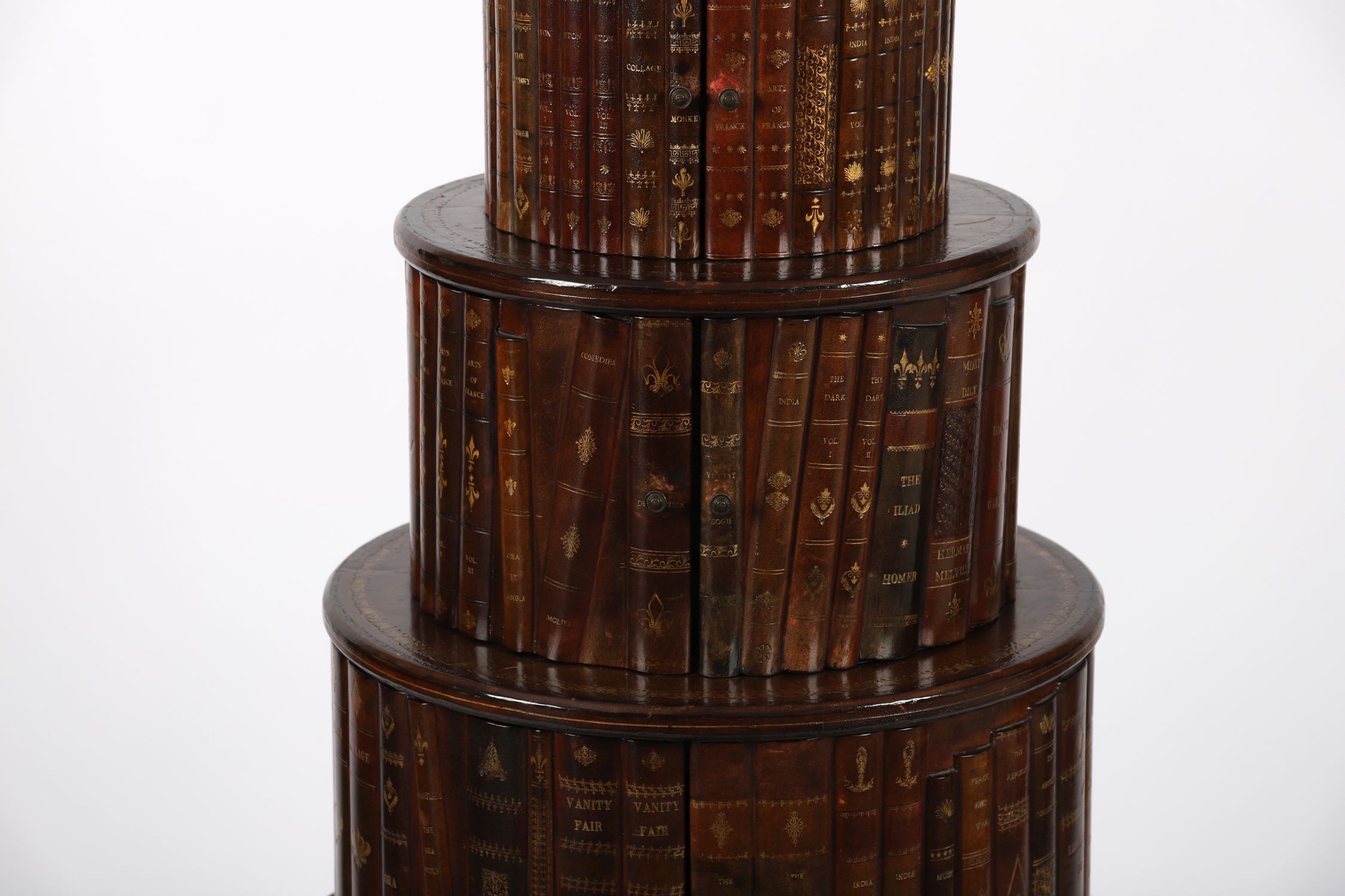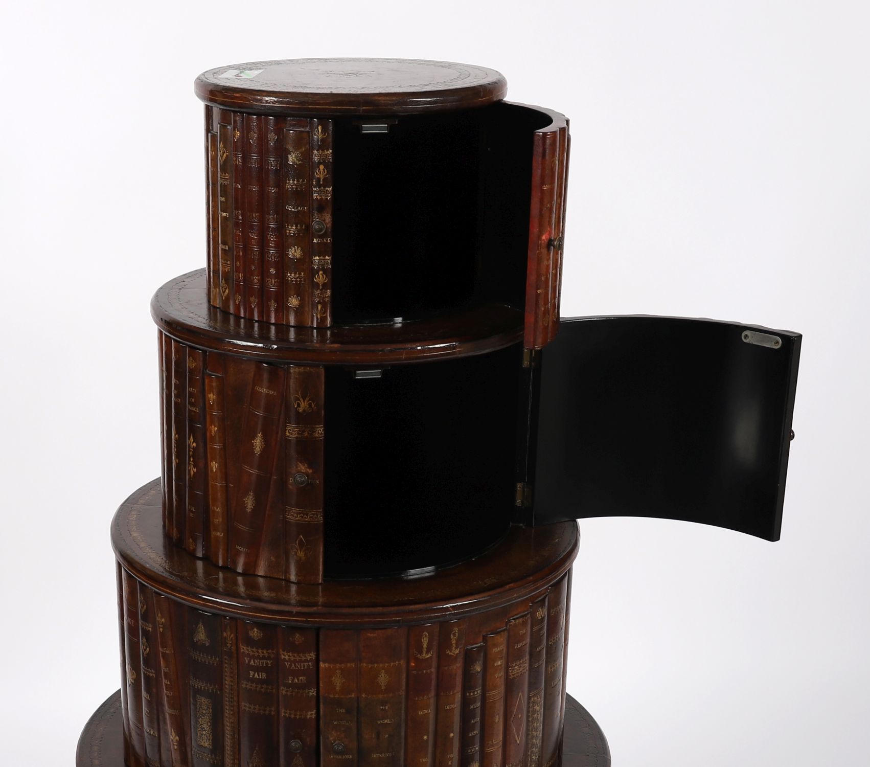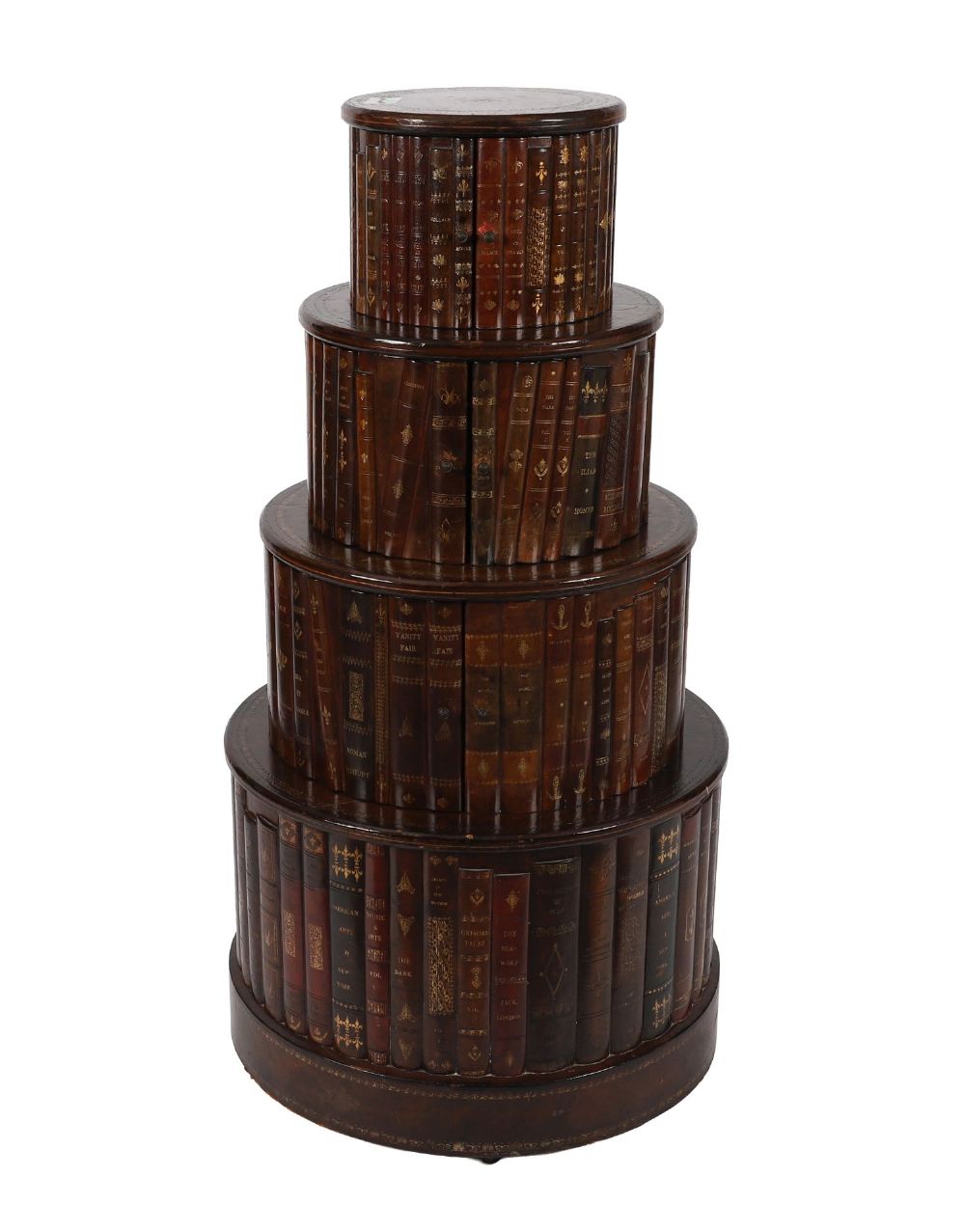 A striking designer revolving cabinet of four stacked cylindrical tiers, each wrapped in simulated leather book spines with gilt tooling. The top tier opens as a concealed storage compartment. Functional and theatrical.