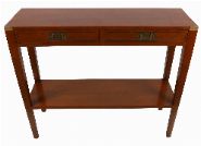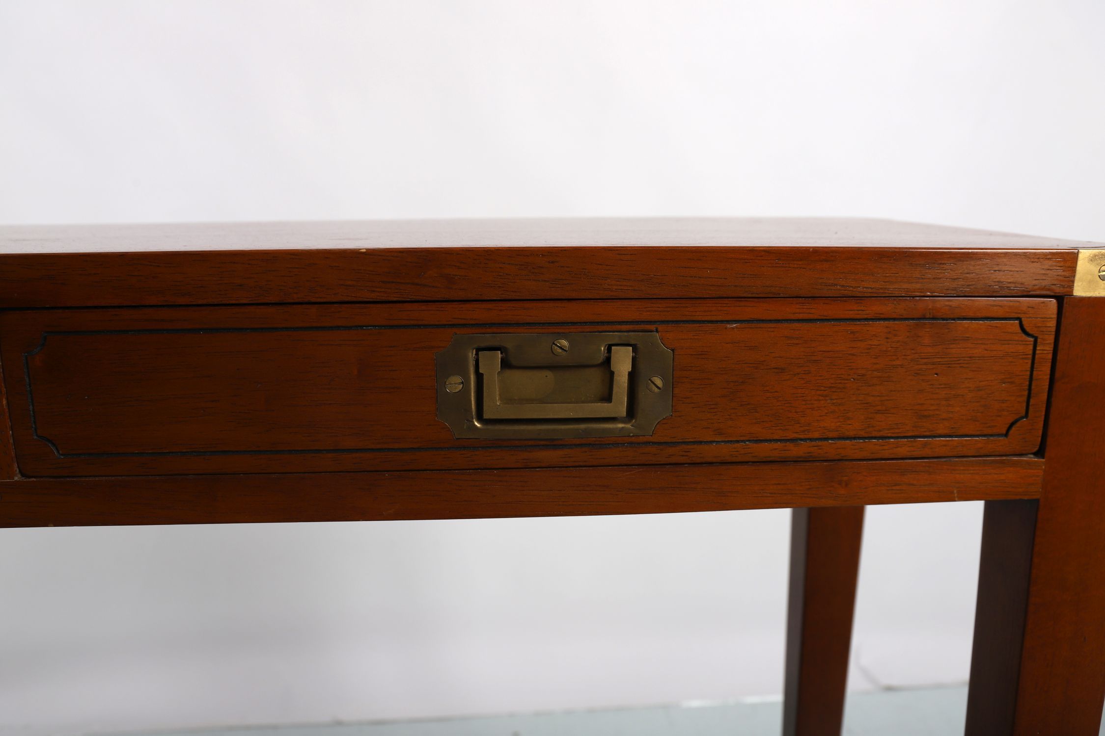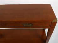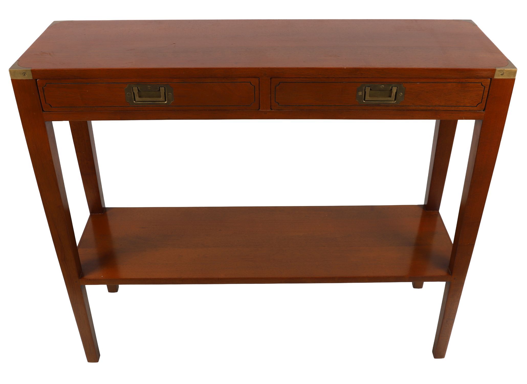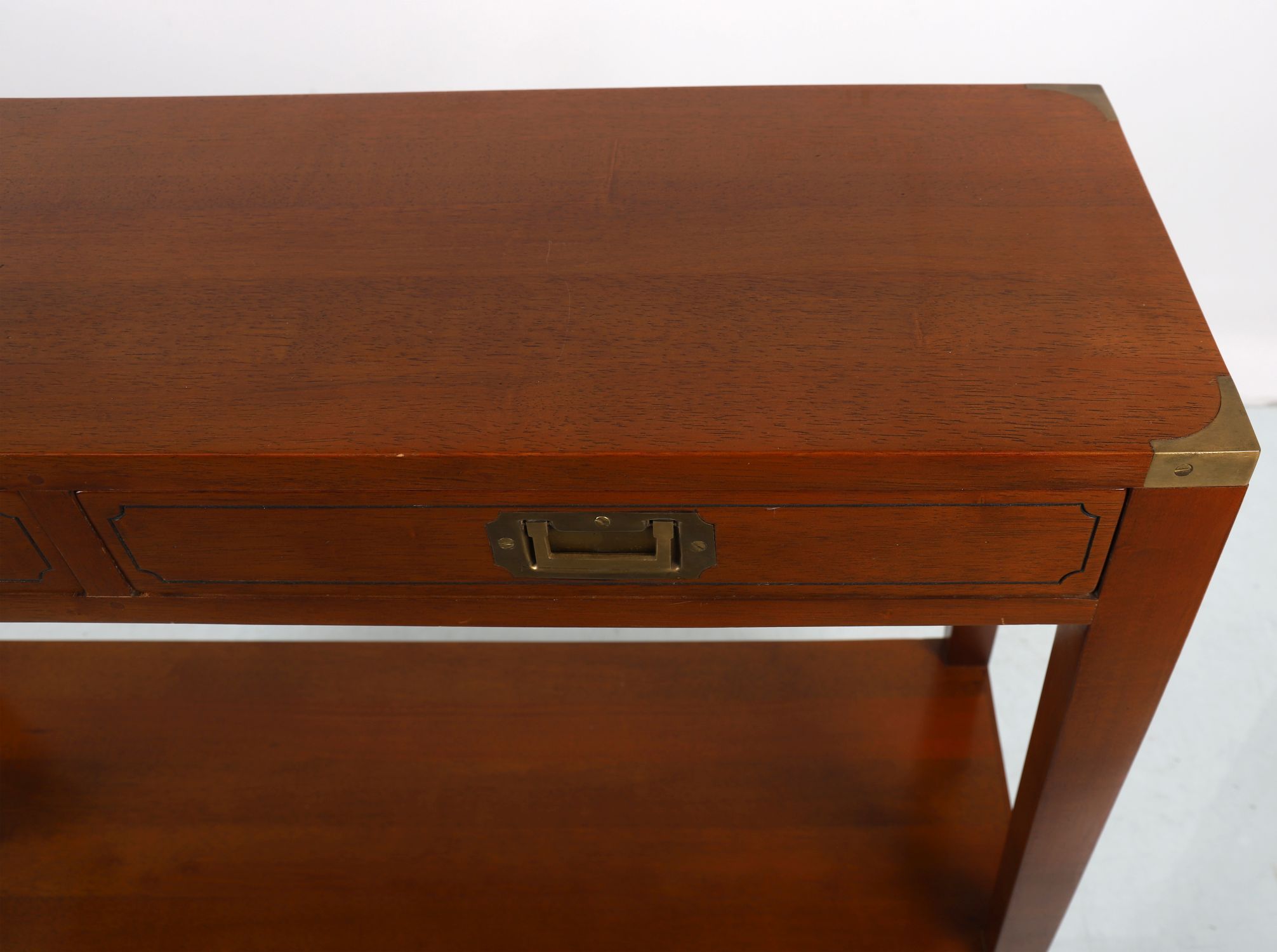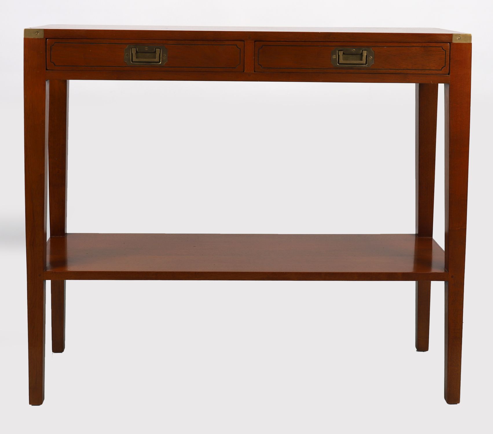 A rectangular fruitwood side table with brass-bound edges and recessed campaign-style handles, fitted with drawers.