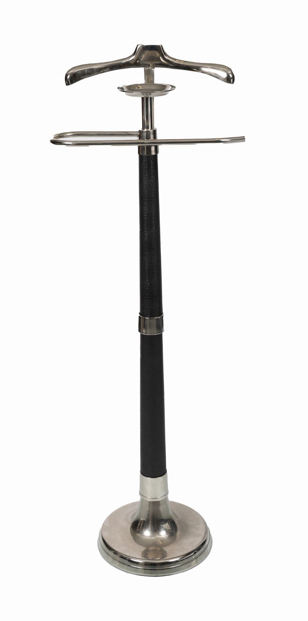 with vide poche dish and trouser rail, raised on a leather stem and circular base.