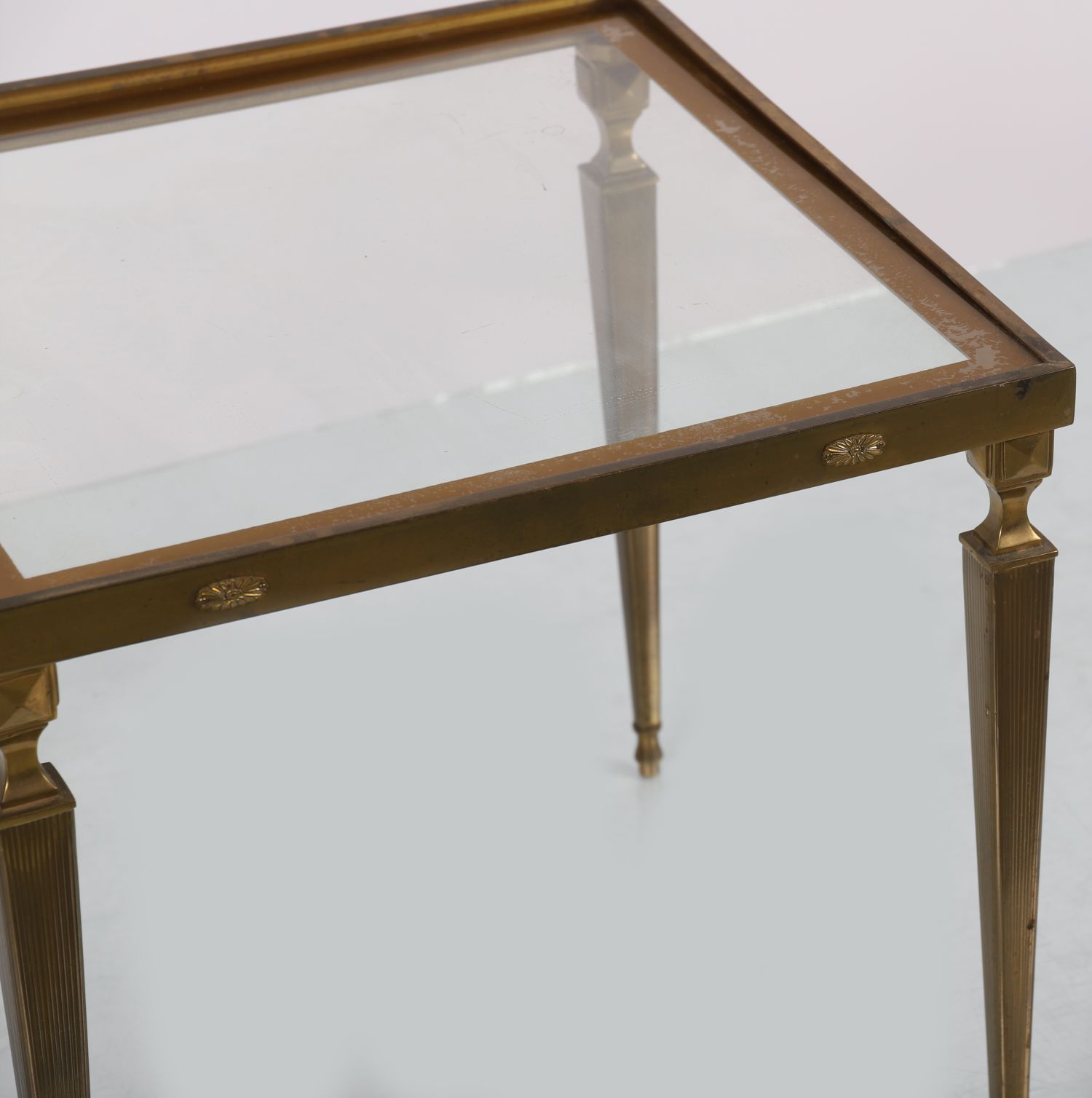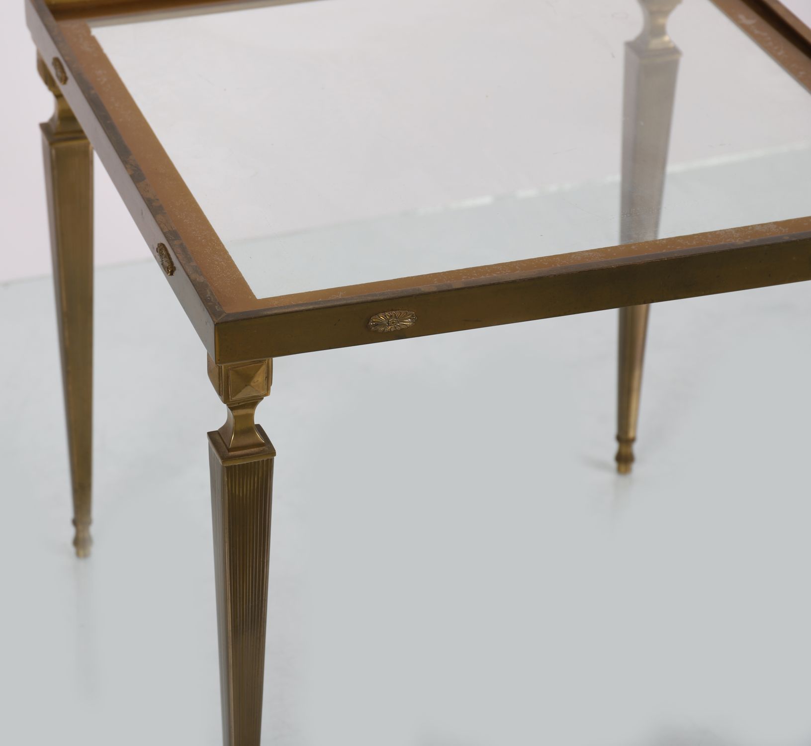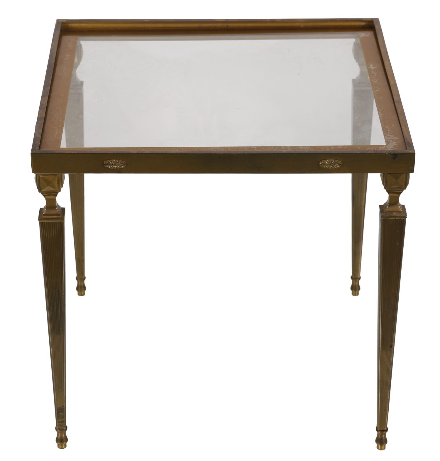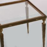 A square brass-framed coffee table with inset glass top, the slender tapering legs with fluted detail and rosette mounts.