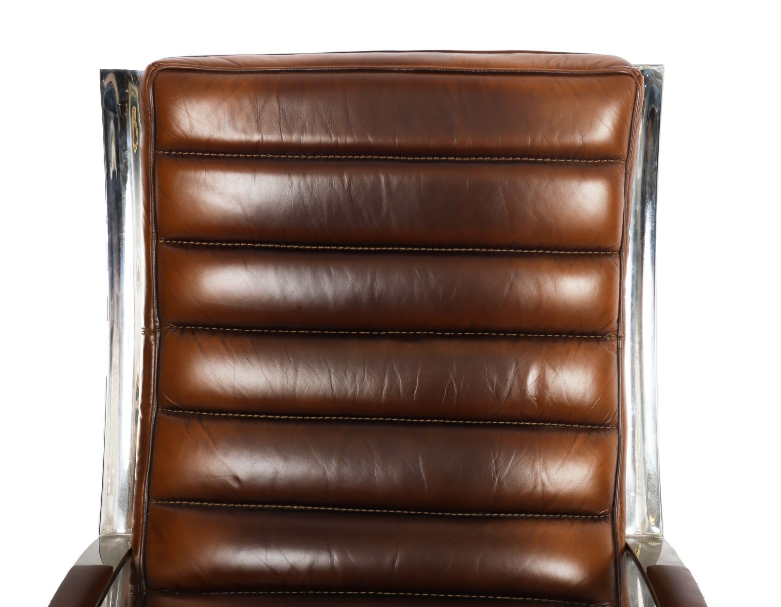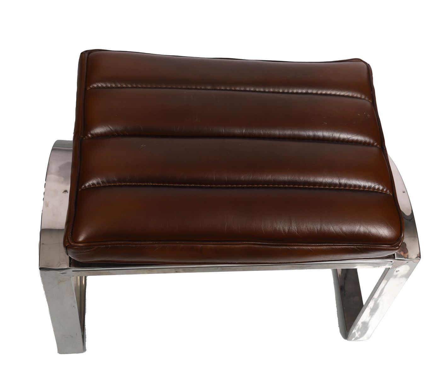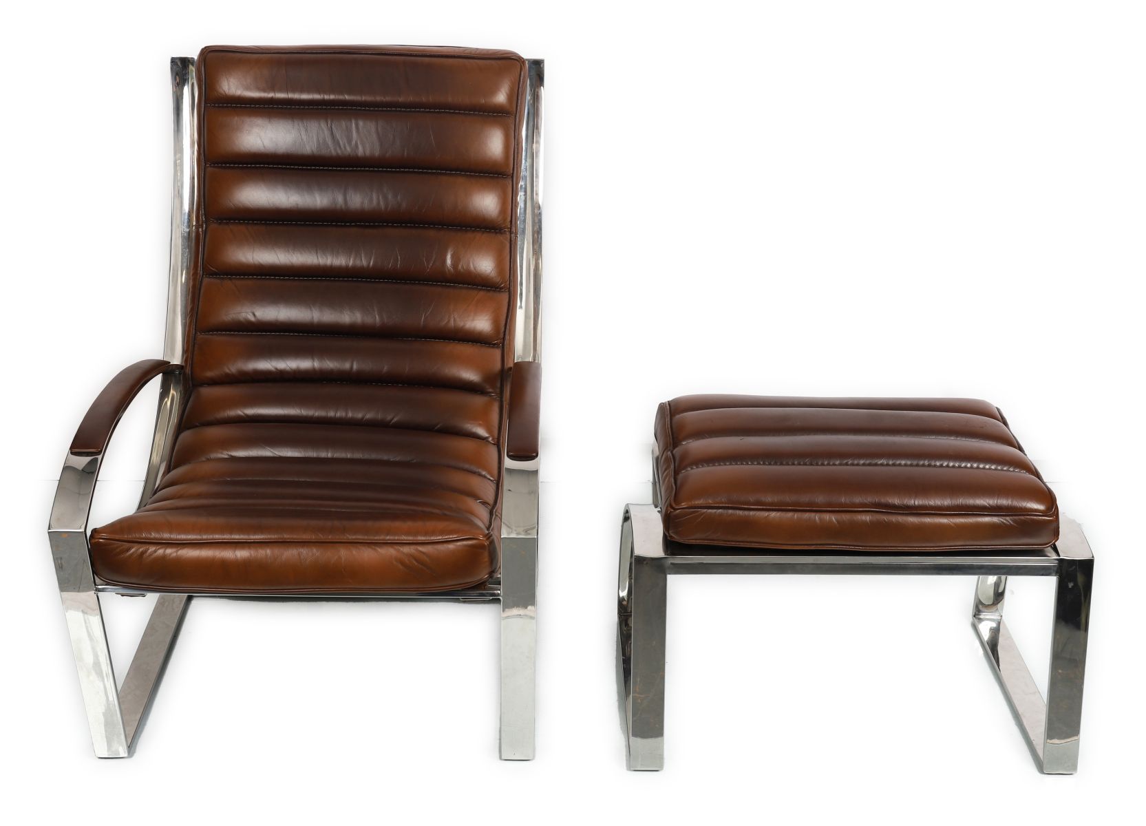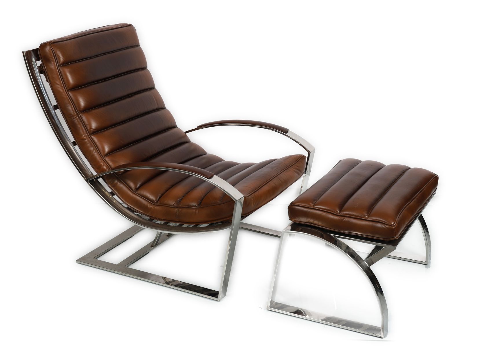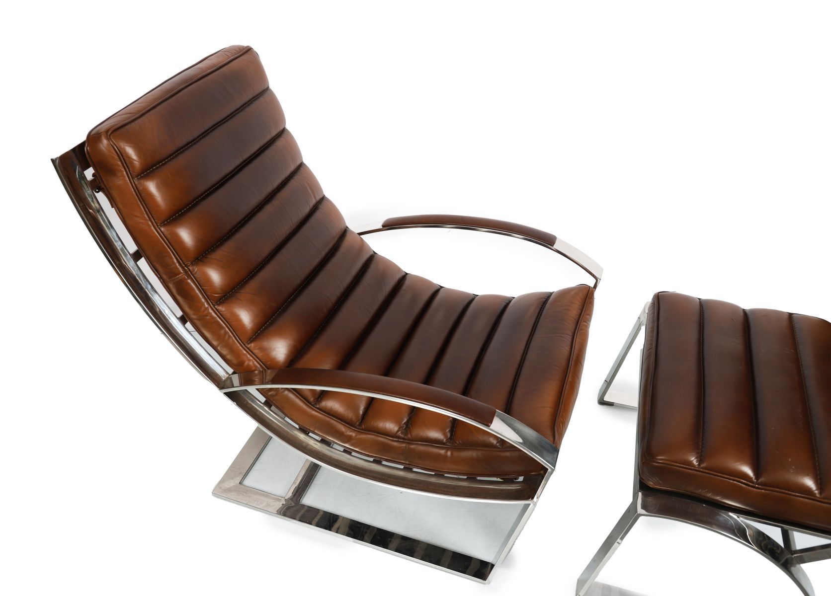 A designer leather and chrome reclining lounge chair with matching pouf, each with ribbed leather upholstery and chrome supports.