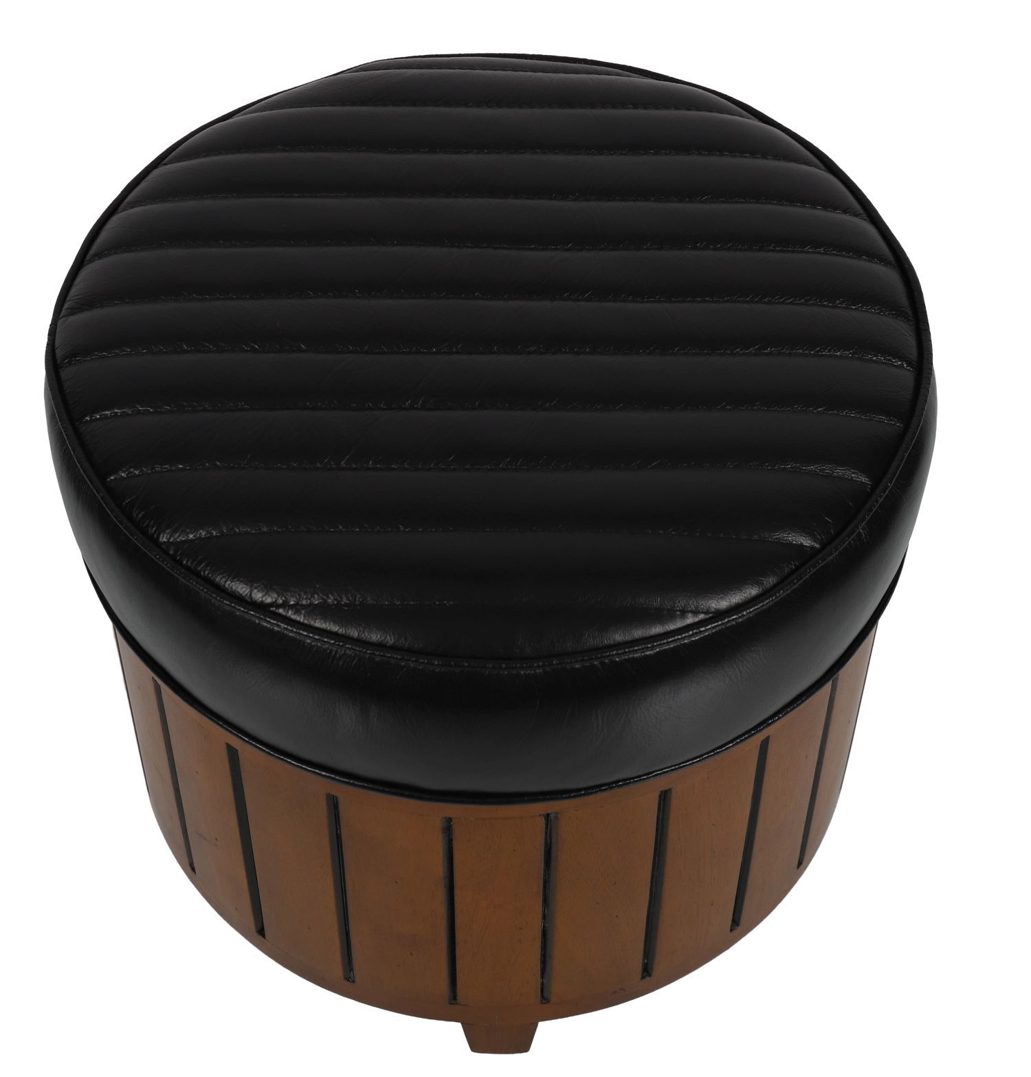 A contemporary circular stool with ribbed black leather seat on a slatted cylindrical wood base.