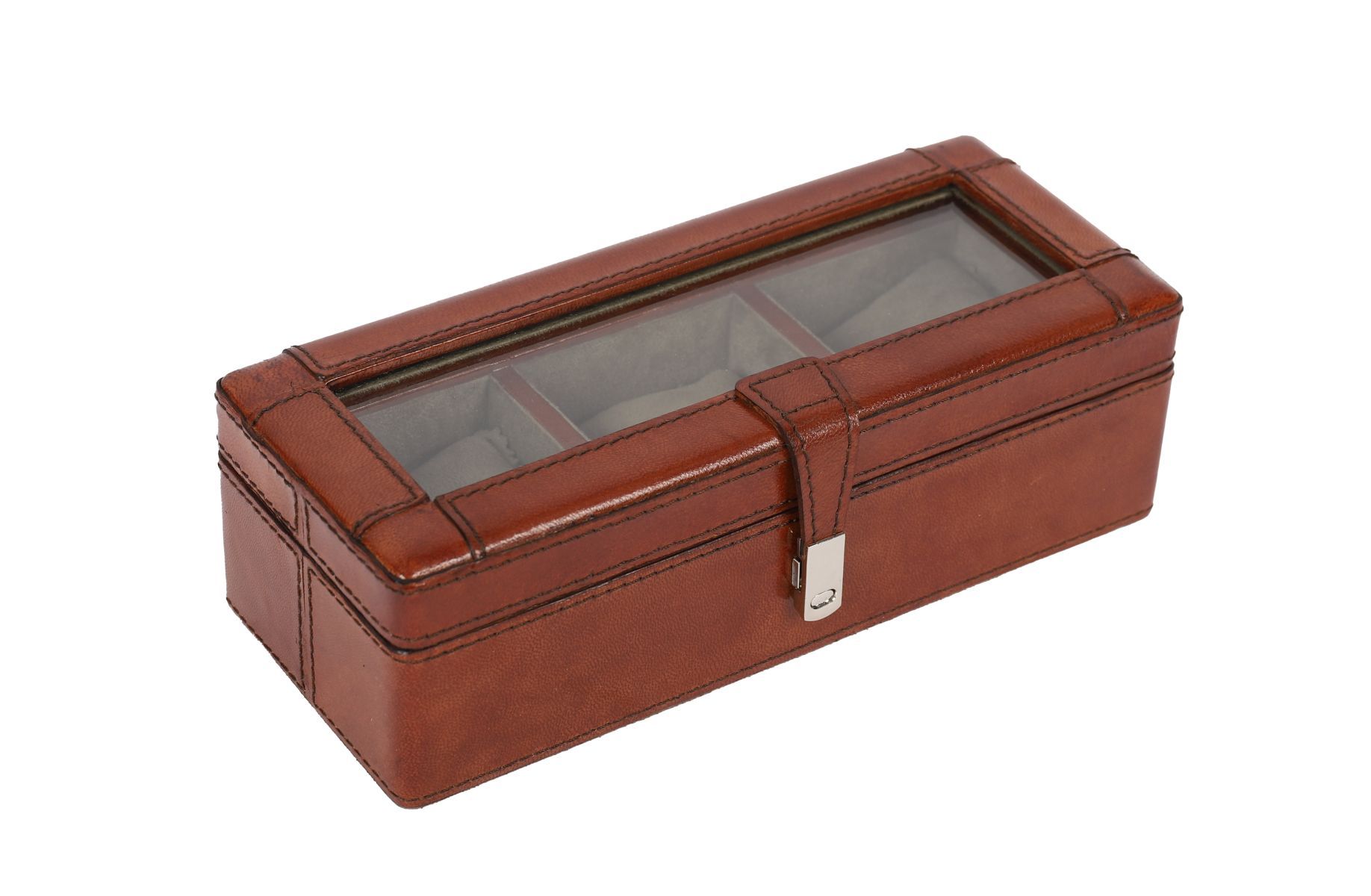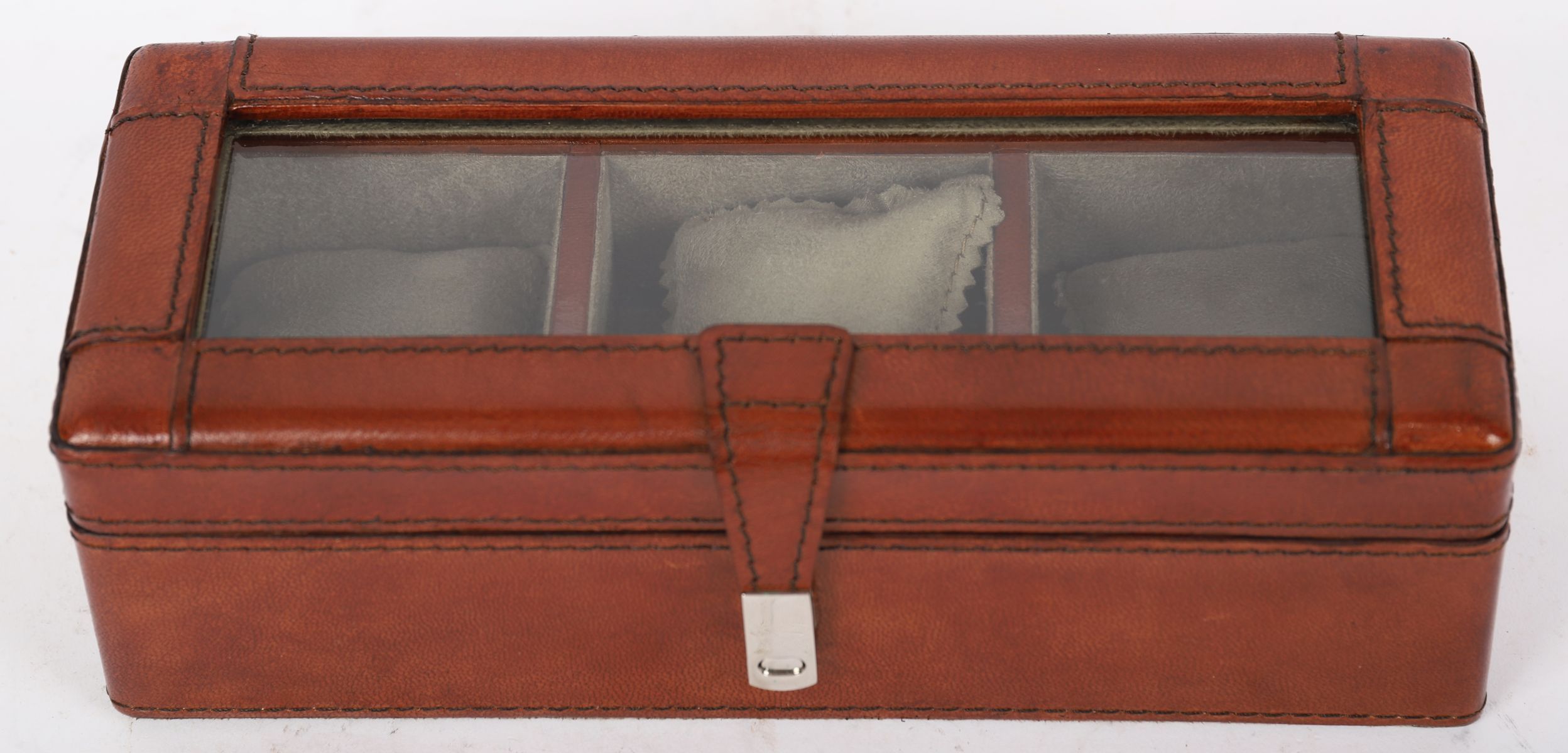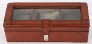 Modern tan leather-bound jewellery or watch case with glazed lid and fitted interior compartments. Contemporary.