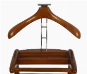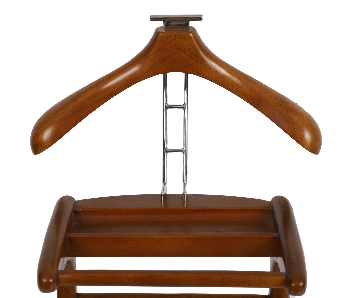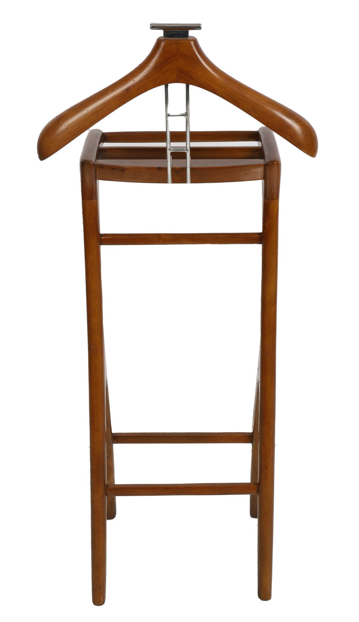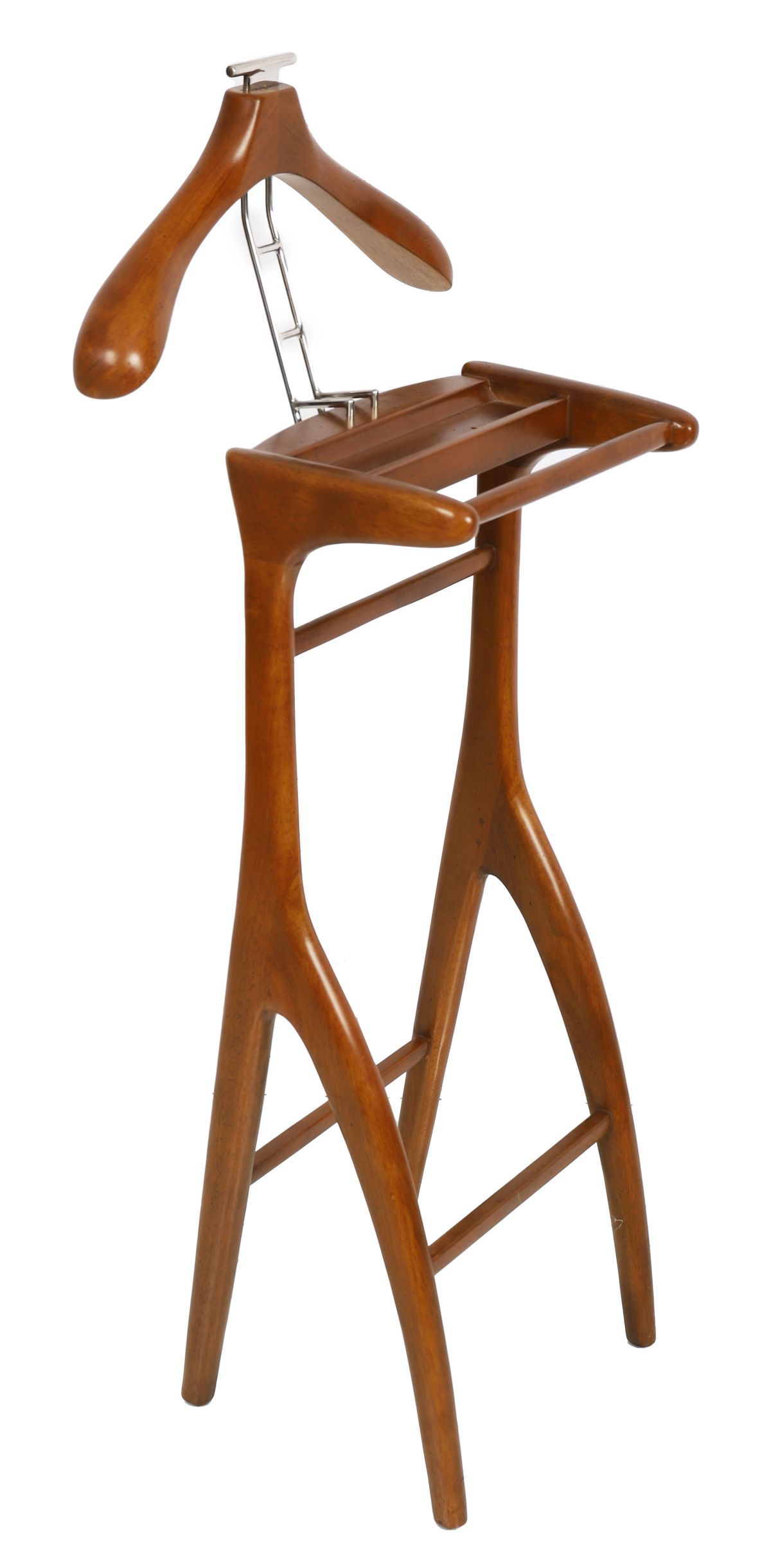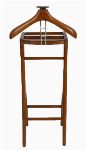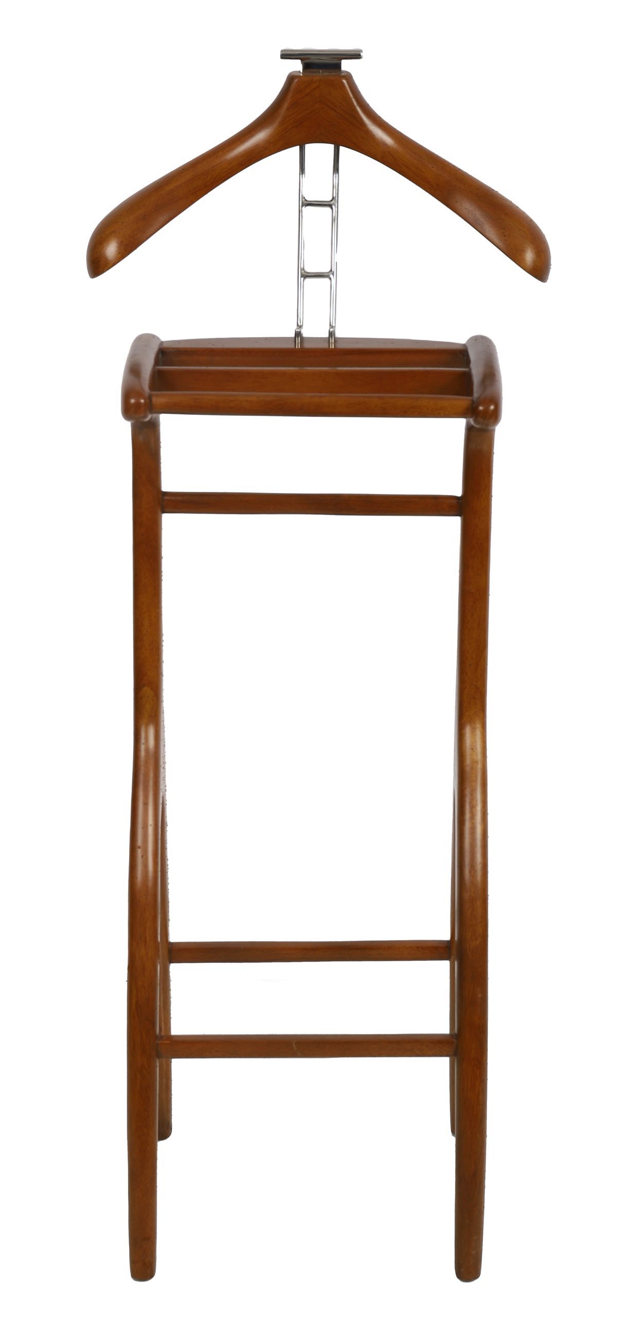 A designer mahogany and chrome gent’s valet stand with shaped hanger and trouser rail.