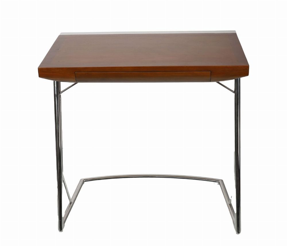 Modern writing table featuring a polished fruitwood top and single drawer supported on angular chrome frame with geometric base.