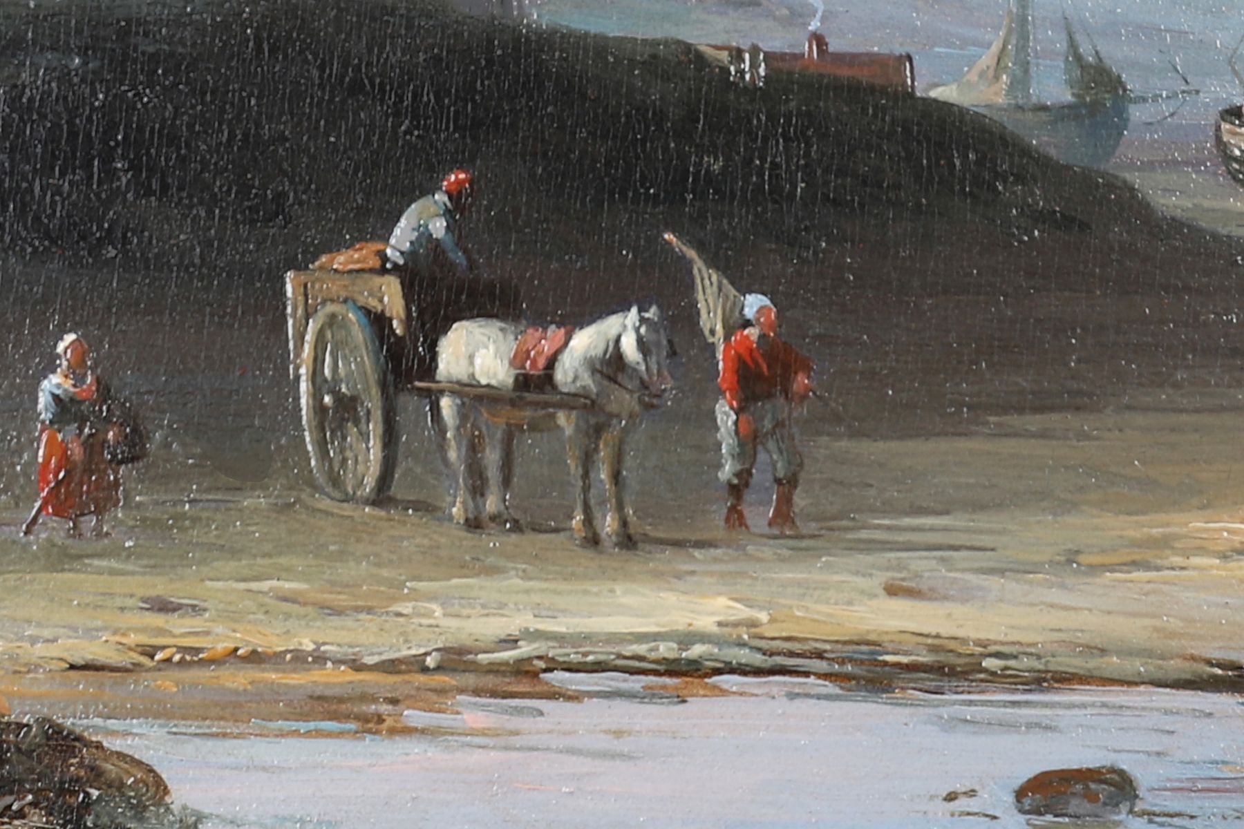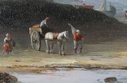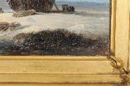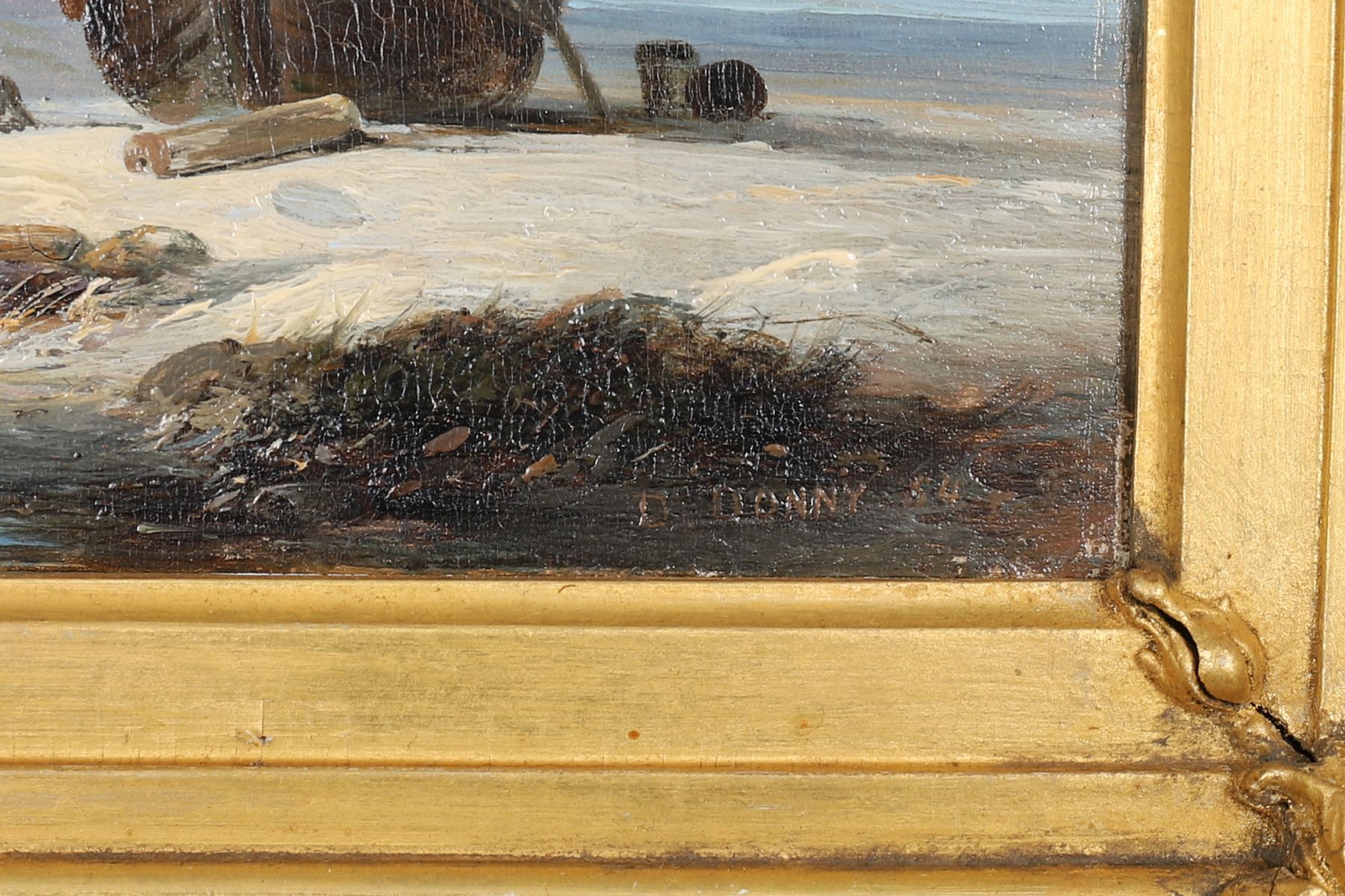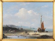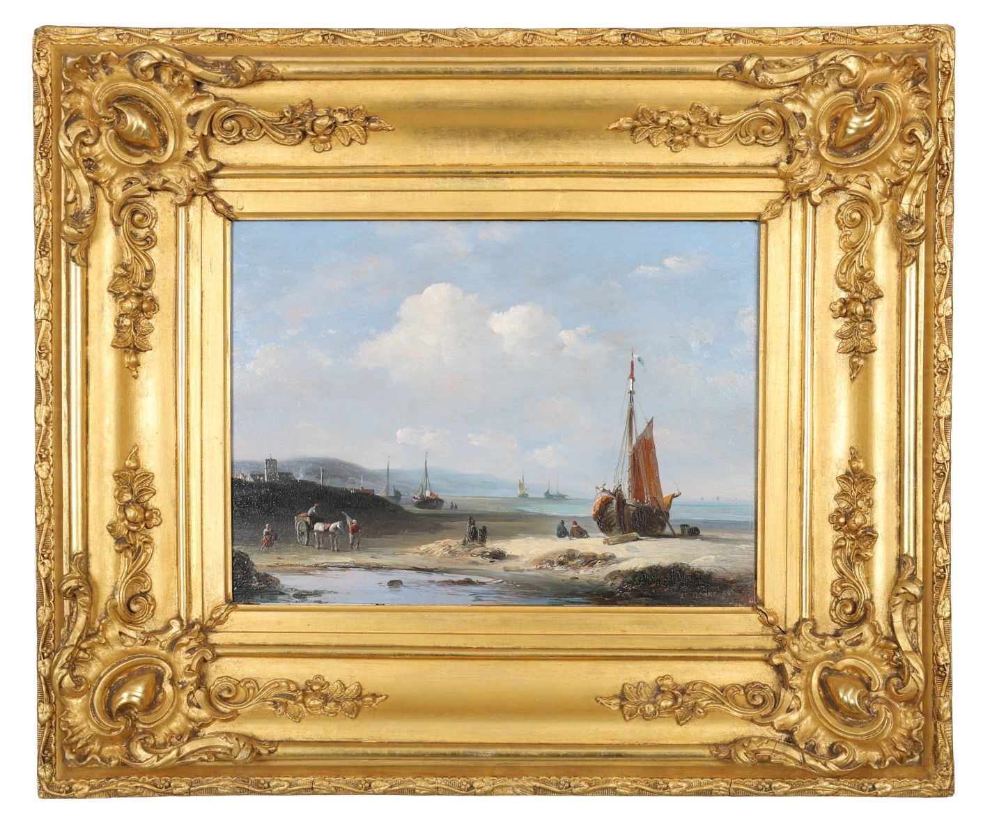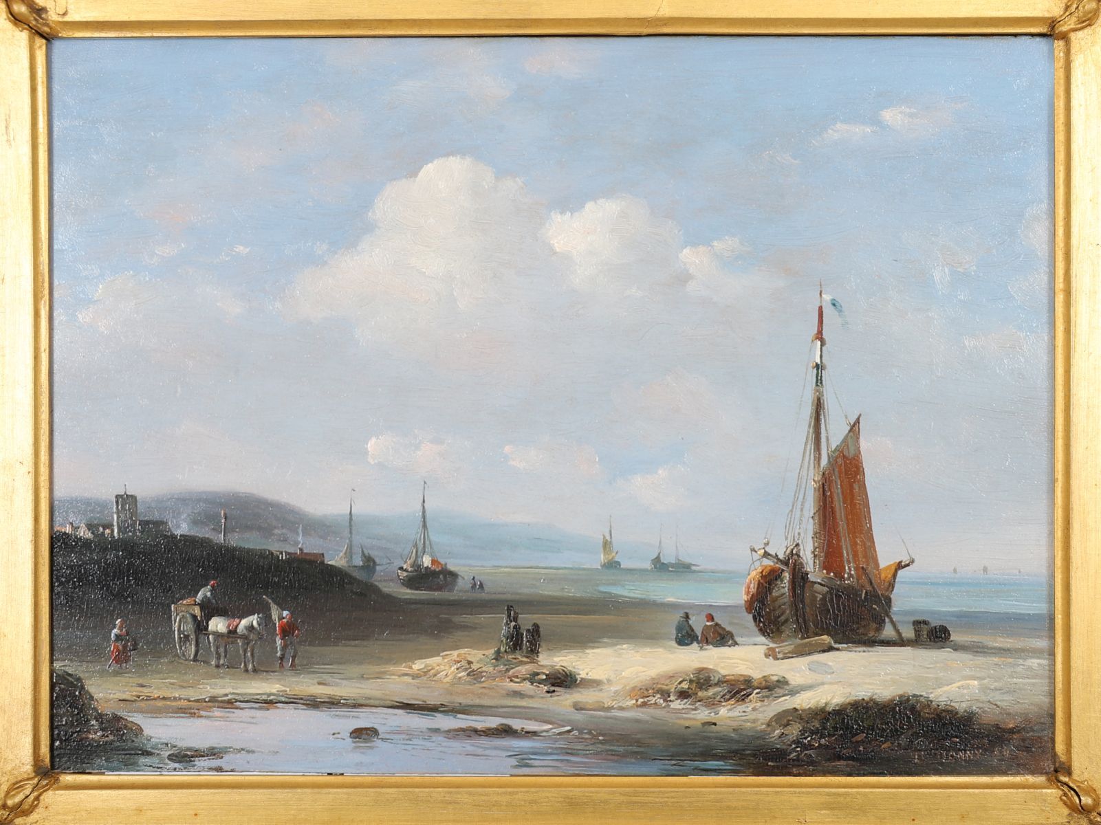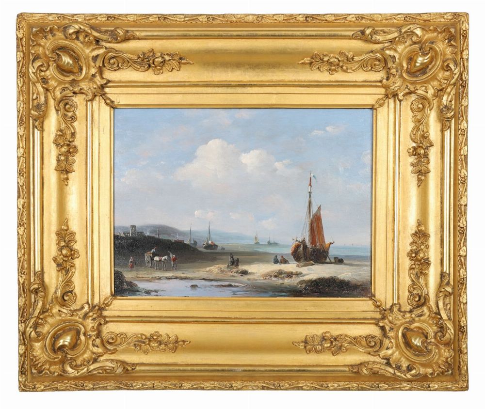 A calm coastal view with fishing boats and figures on the shore, distant sails and calm seas beneath a soft blue sky. Oil on panel, signed lower right. Presented in a gilt frame with rococo corners.