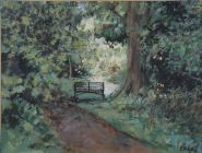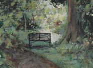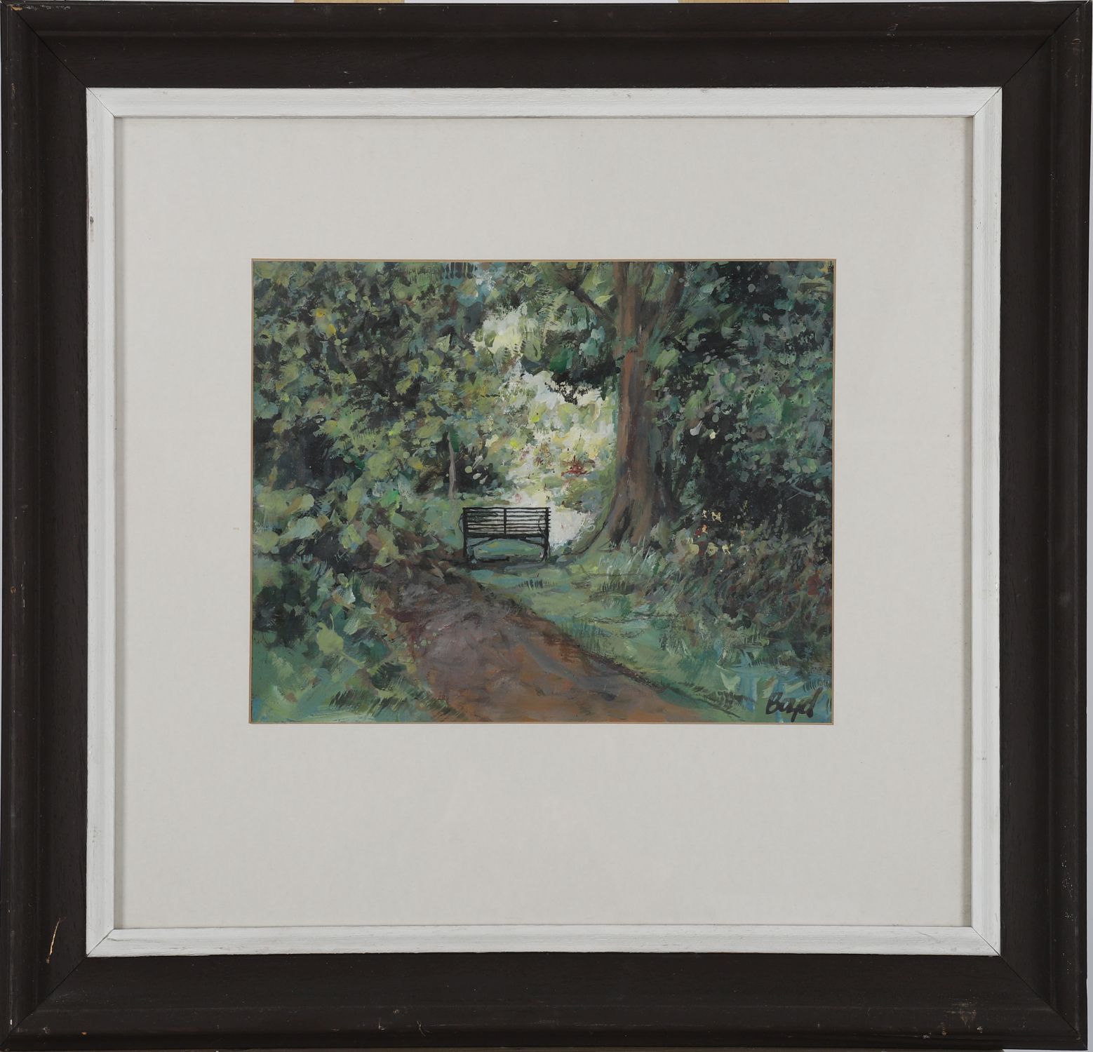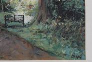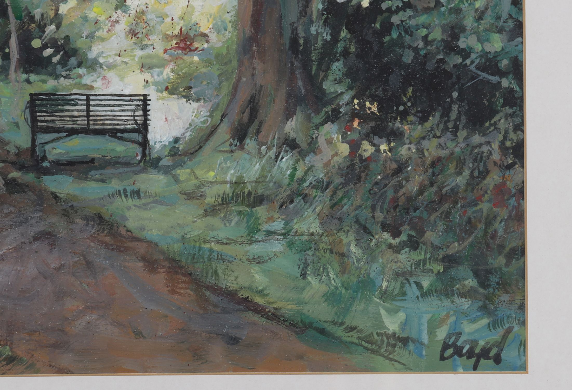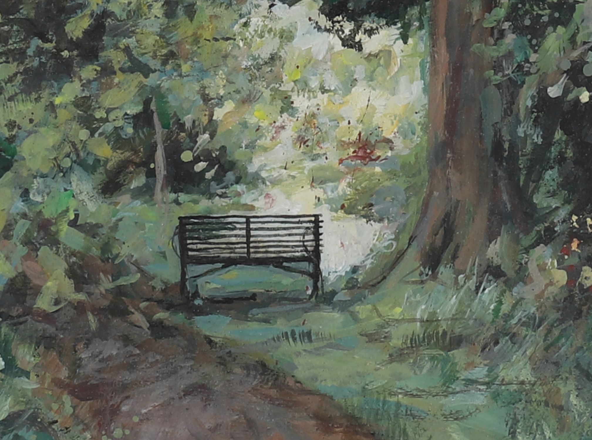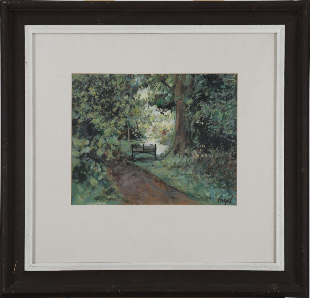 A delicate and atmospheric acrylic by Diarmuid Boyd, titled A Quiet Prospect, Mount Usher, depicting a sun-dappled woodland path leading to a rustic gate beneath mature trees. The artist captures the tranquillity and filtered light of the garden setting with loose, expressive brushwork. Signed lower right.