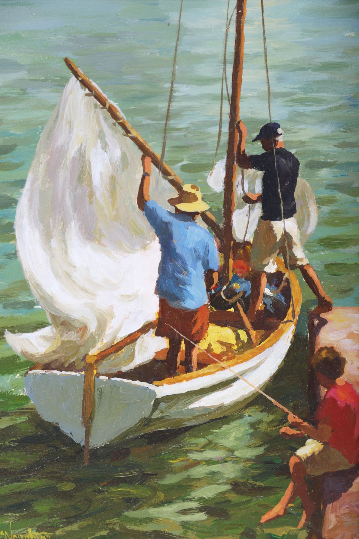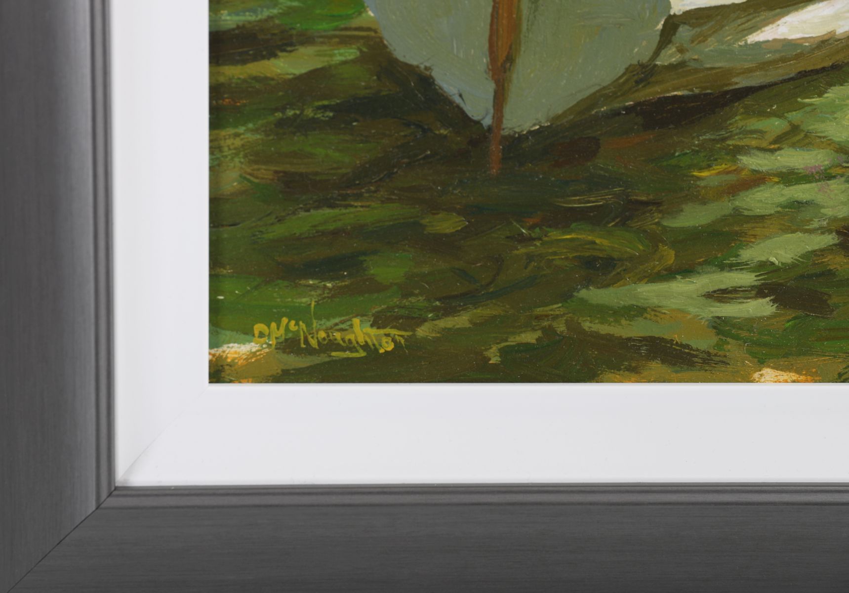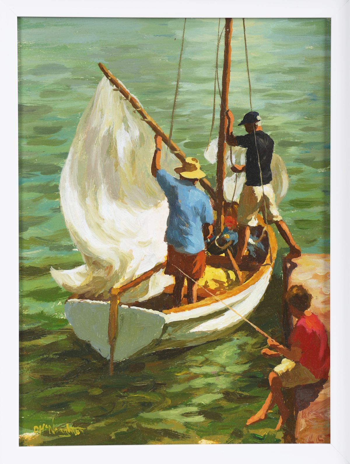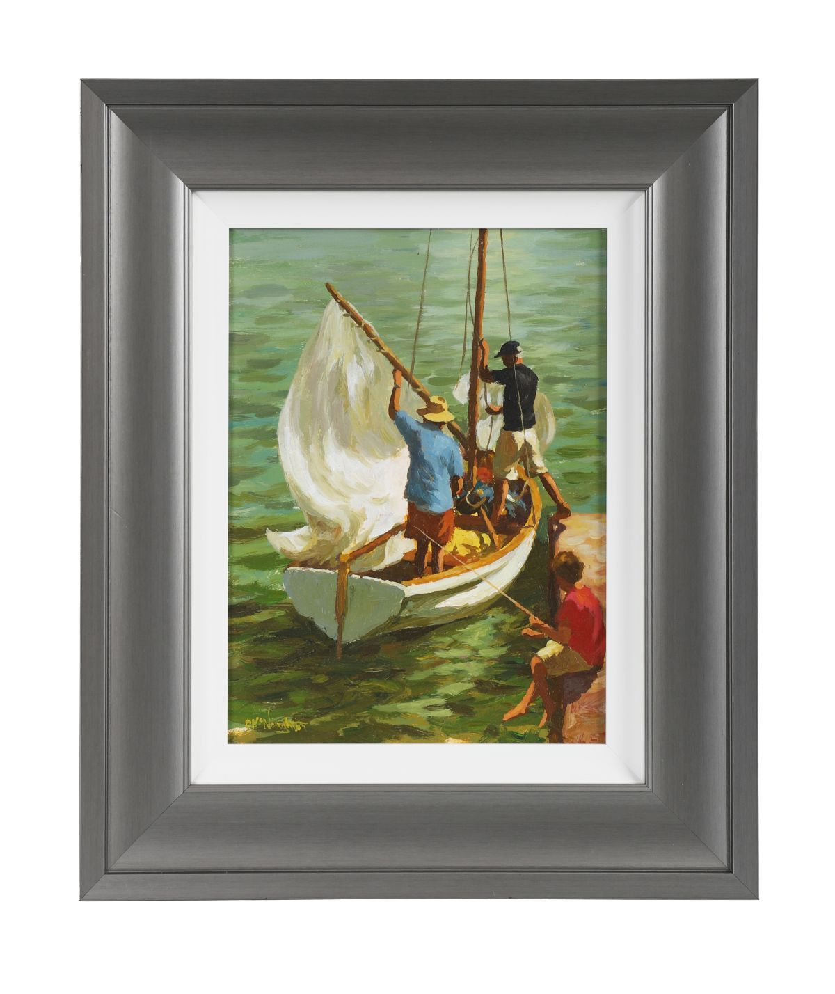 A lively coastal composition depicting three fishermen preparing to raise a sail on a moored boat. Strong directional light highlights the fabric of the sail and the reflective green surface of the water. Painted with McNaughton’s confident brushwork and naturalistic colour sense. Signed lower left and framed in a silver moulded frame with white slip.