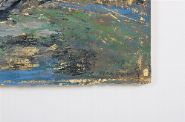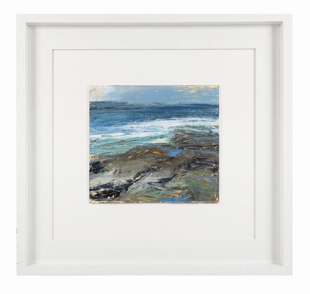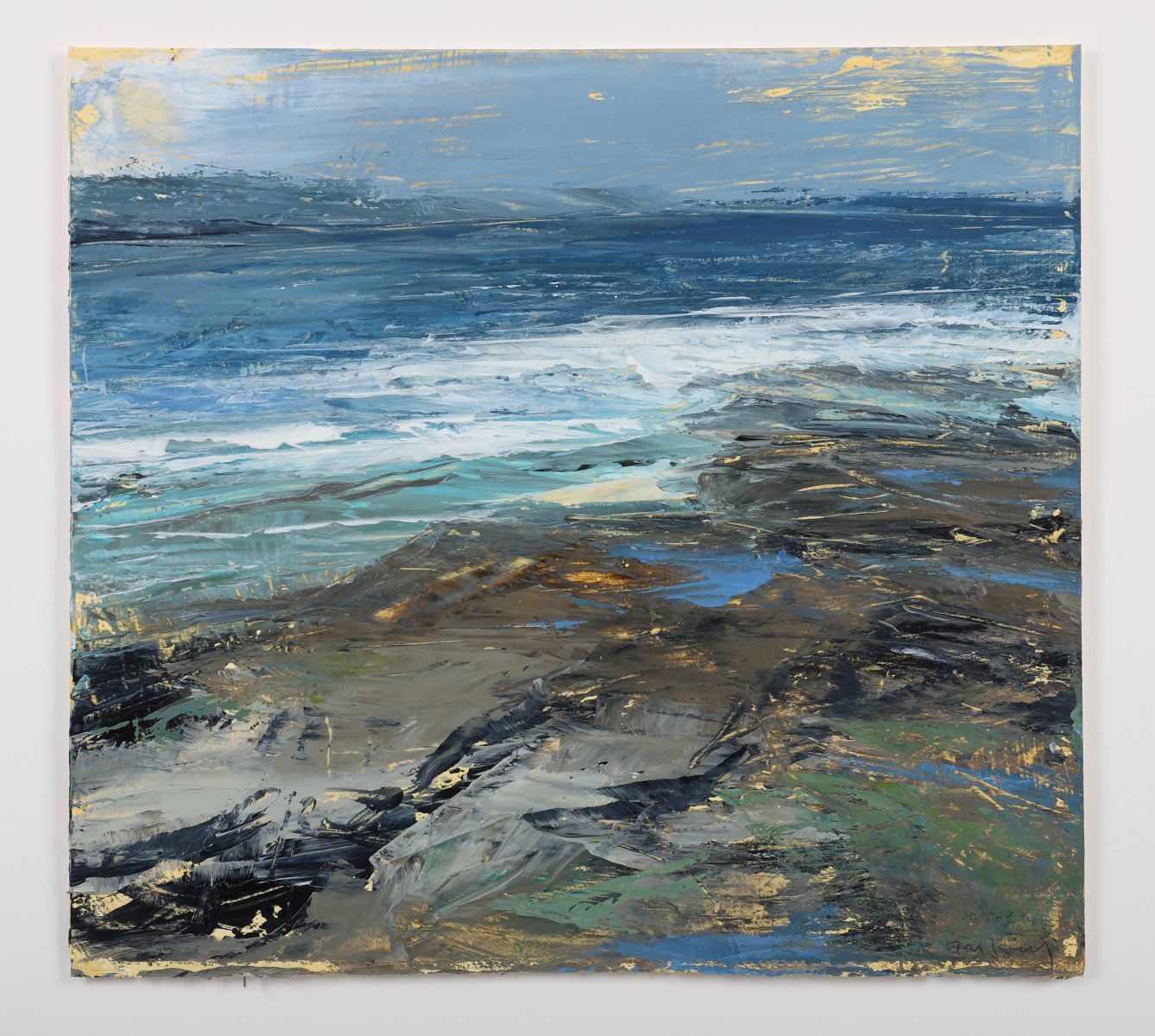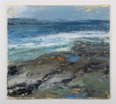 A powerful oil on canvas board coastal landscape by Donald Teskey, painted with bold impasto and gestural brushwork characteristic of the artist’s Atlantic series. The composition captures the restless energy of waves crashing against a rocky shoreline beneath a shifting sky, rendered in layered tones of blue, grey, and ochre. The tactile surface and dynamic perspective evoke both the physicality and atmosphere of Ireland’s western seaboard.