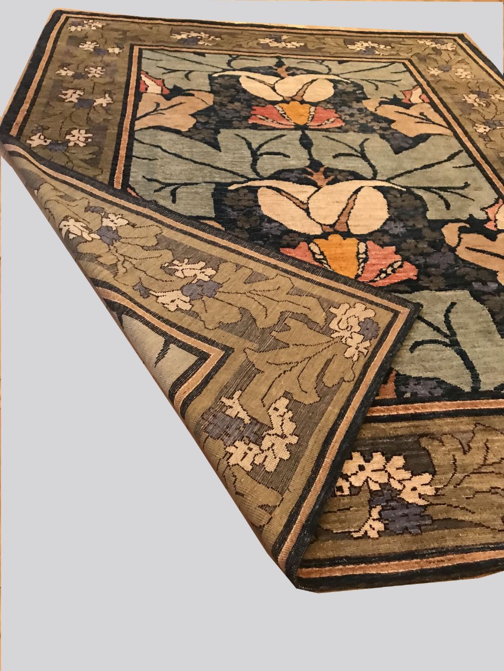The central field features symmetrical blooms and foliate stems in soft celadon, ochre, terracotta, and indigo tones set against a mottled deep green ground. The border echoes the naturalistic design in a complementary palette, framed by delicate guard stripes.