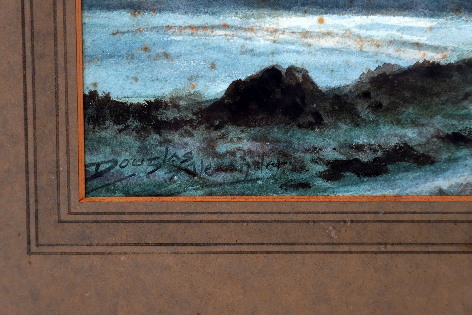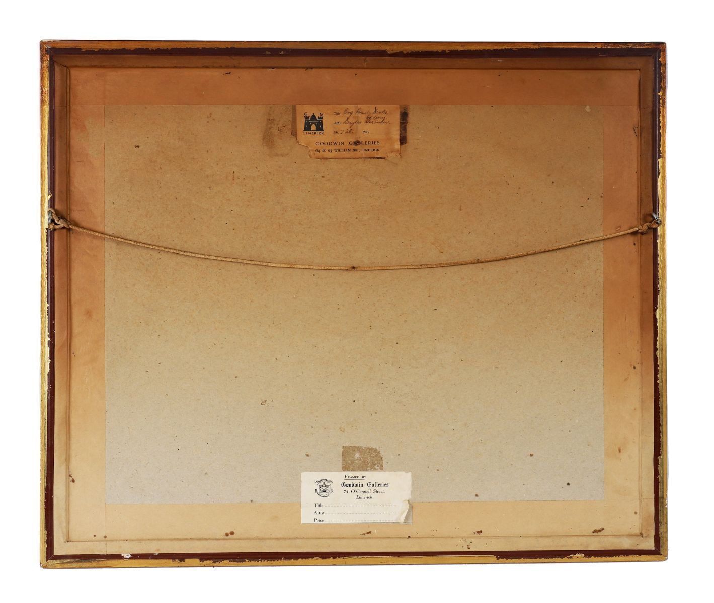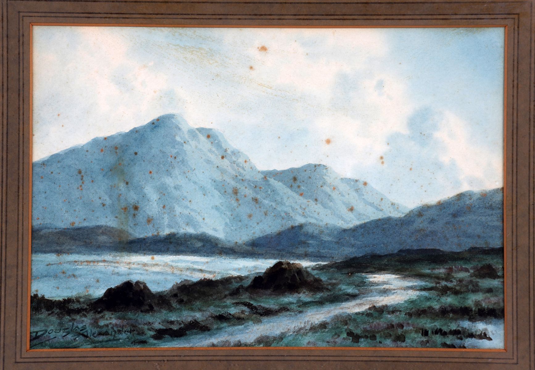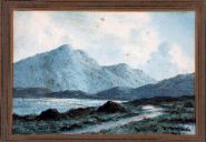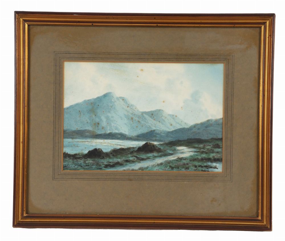 Watercolour depicting a mountainous Kerry landscape with a bog road in the foreground beneath a cloudy sky. Signed and presented in a glazed and gilt frame.