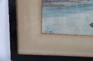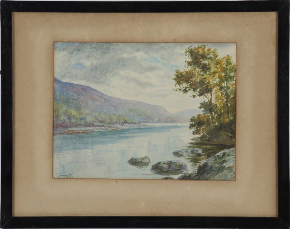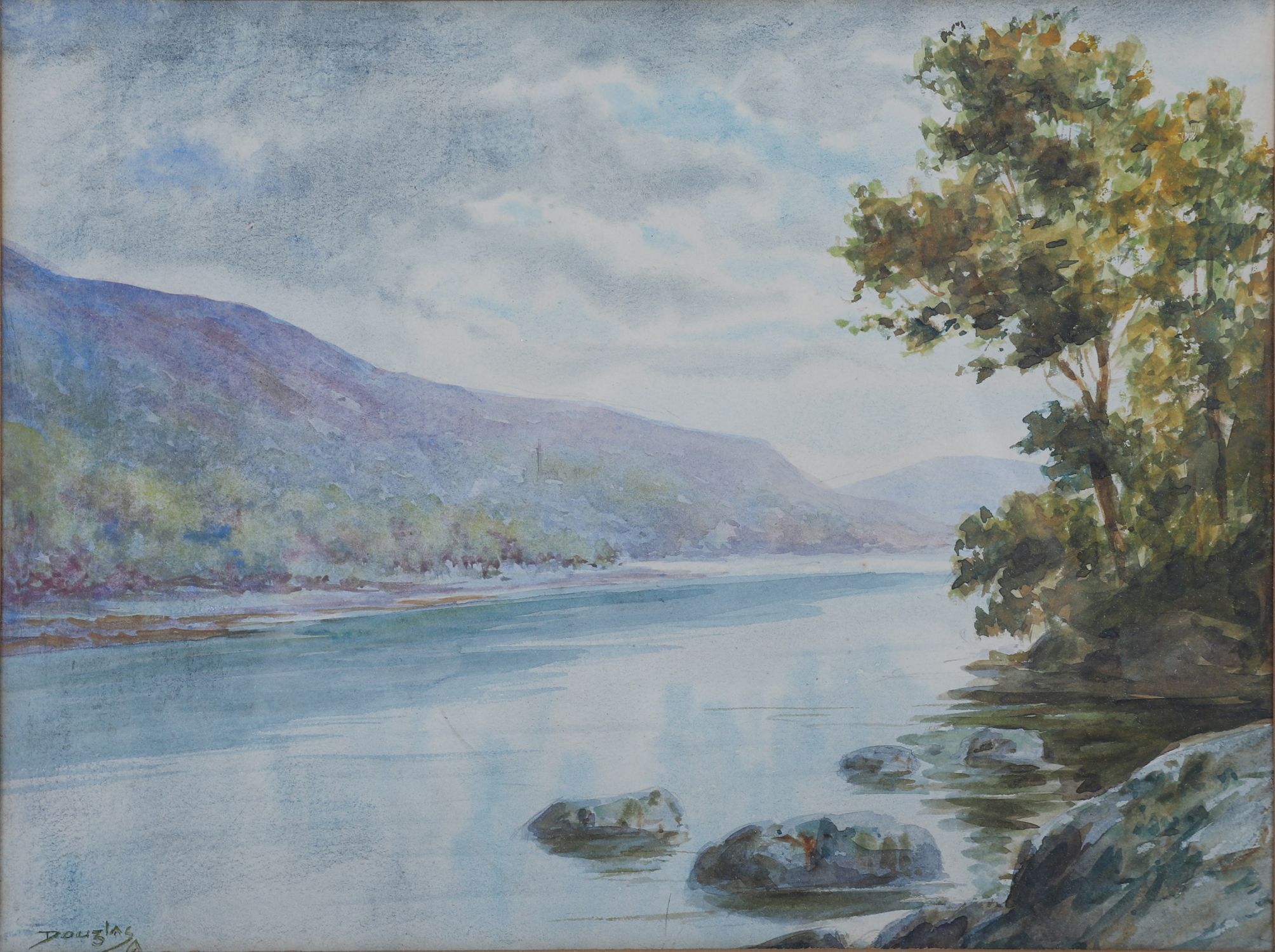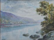 Description: A watercolour landscape showing a calm lake bordered by rocks and trees, with distant hills under soft sky tones. Signed lower left.