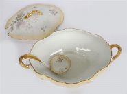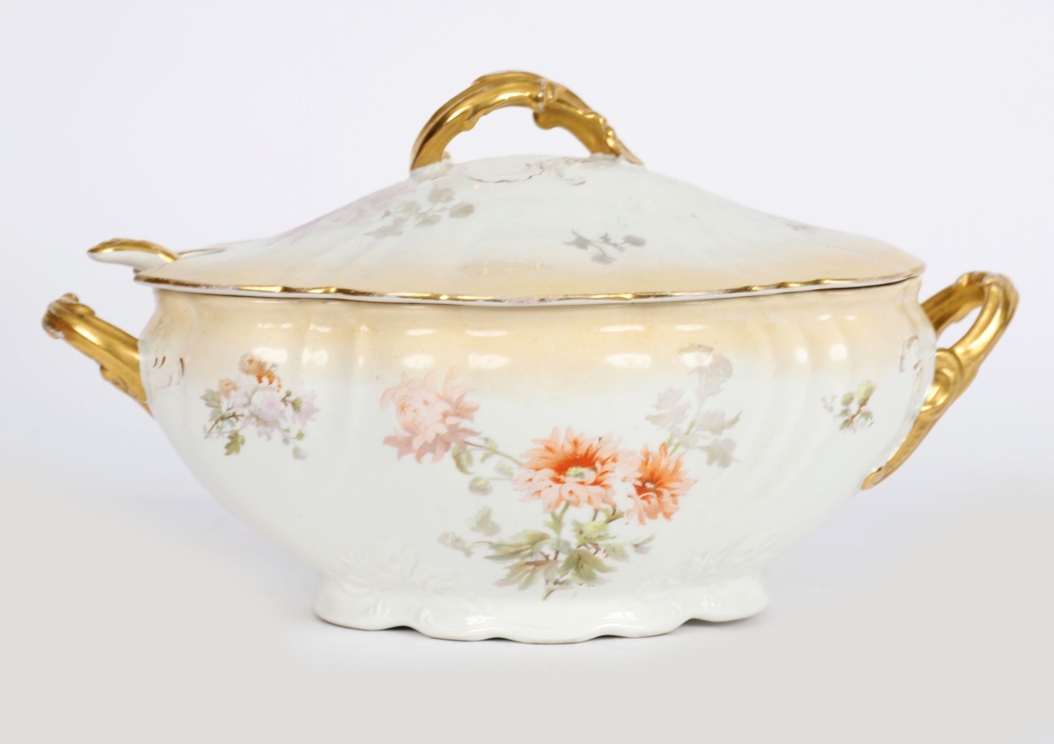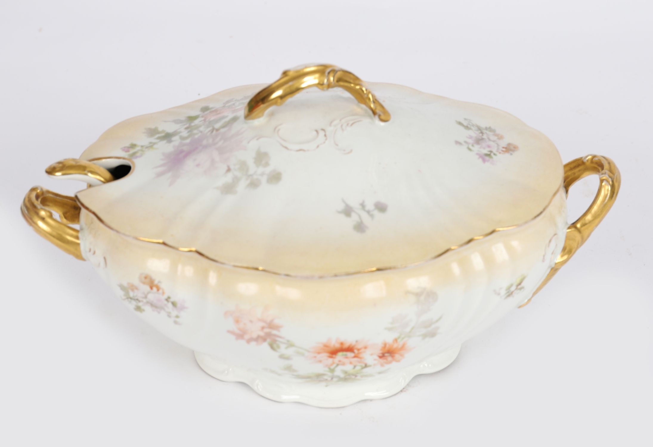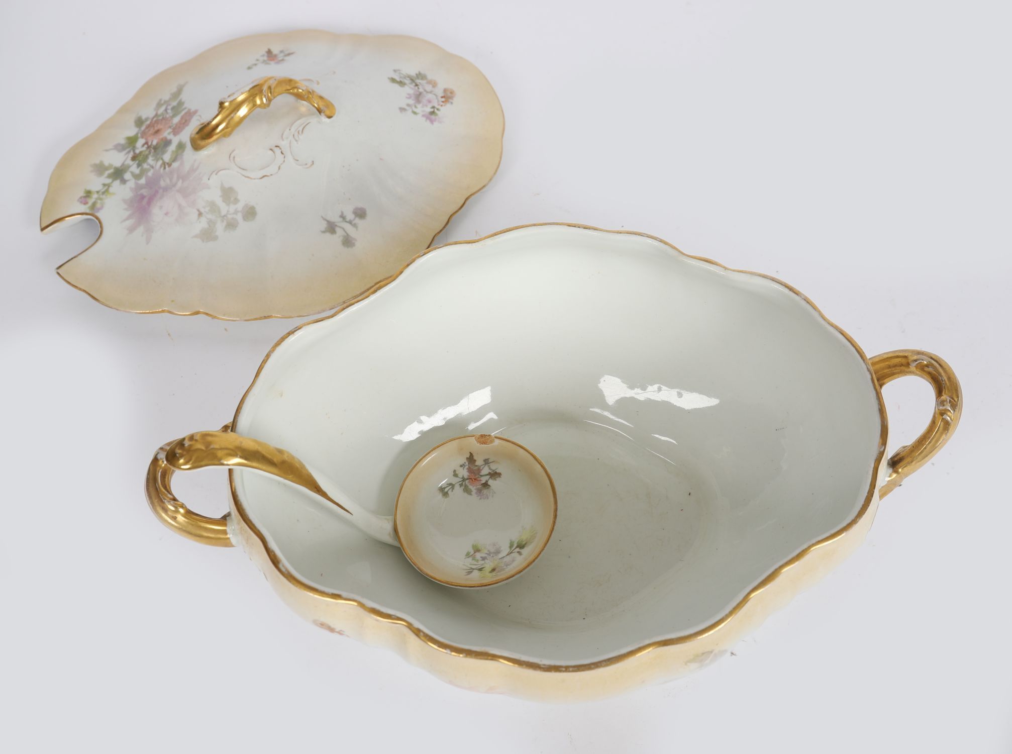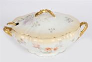 An oval covered porcelain tureen by Doulton, decorated with hand-painted floral sprays and gilt scroll handles, the domed cover with gilt finial.