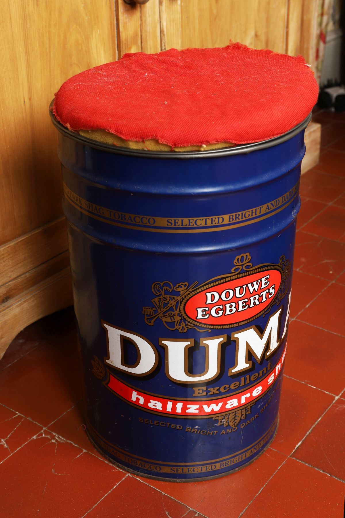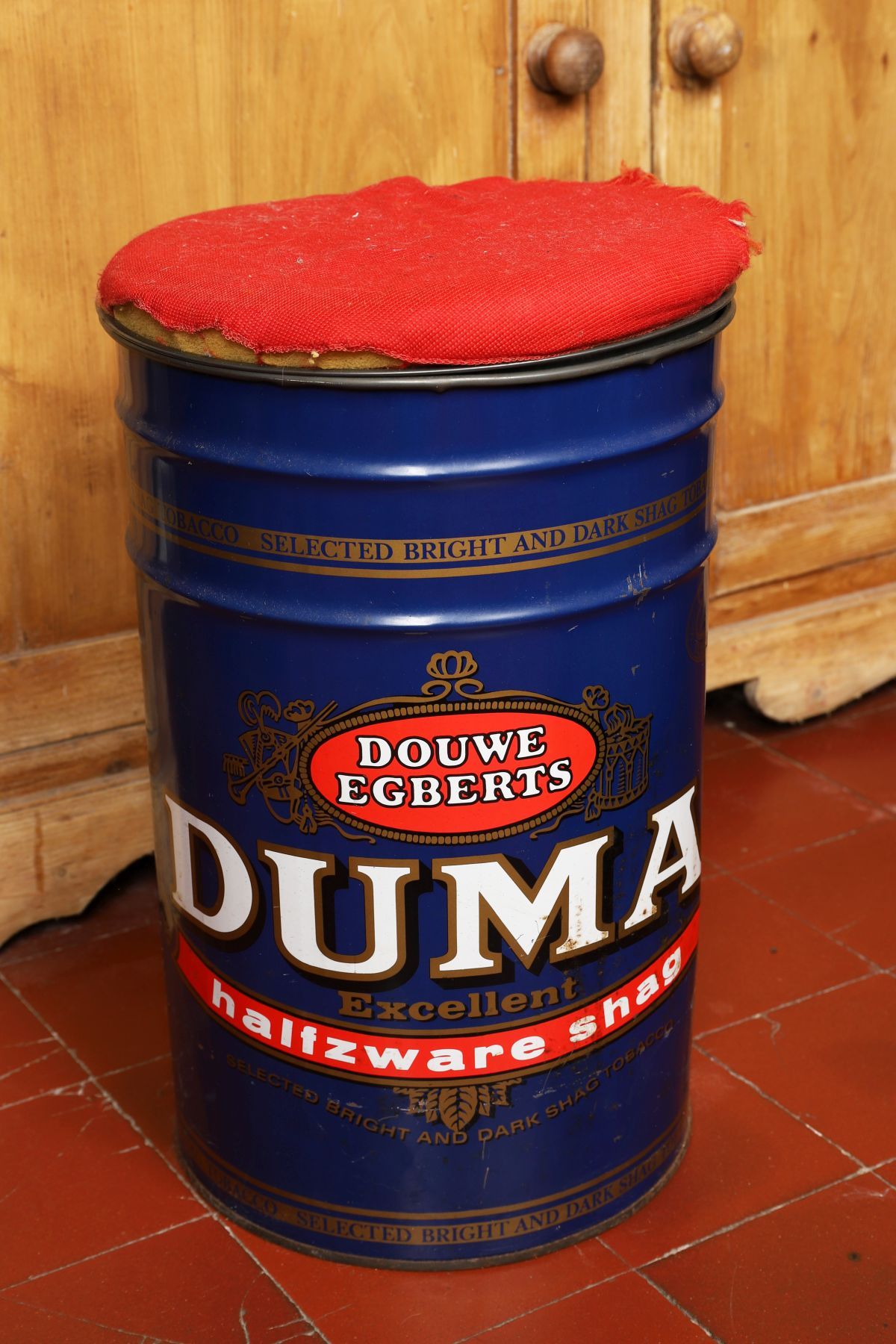 Formed from a branded metal barrel with upholstered seat.