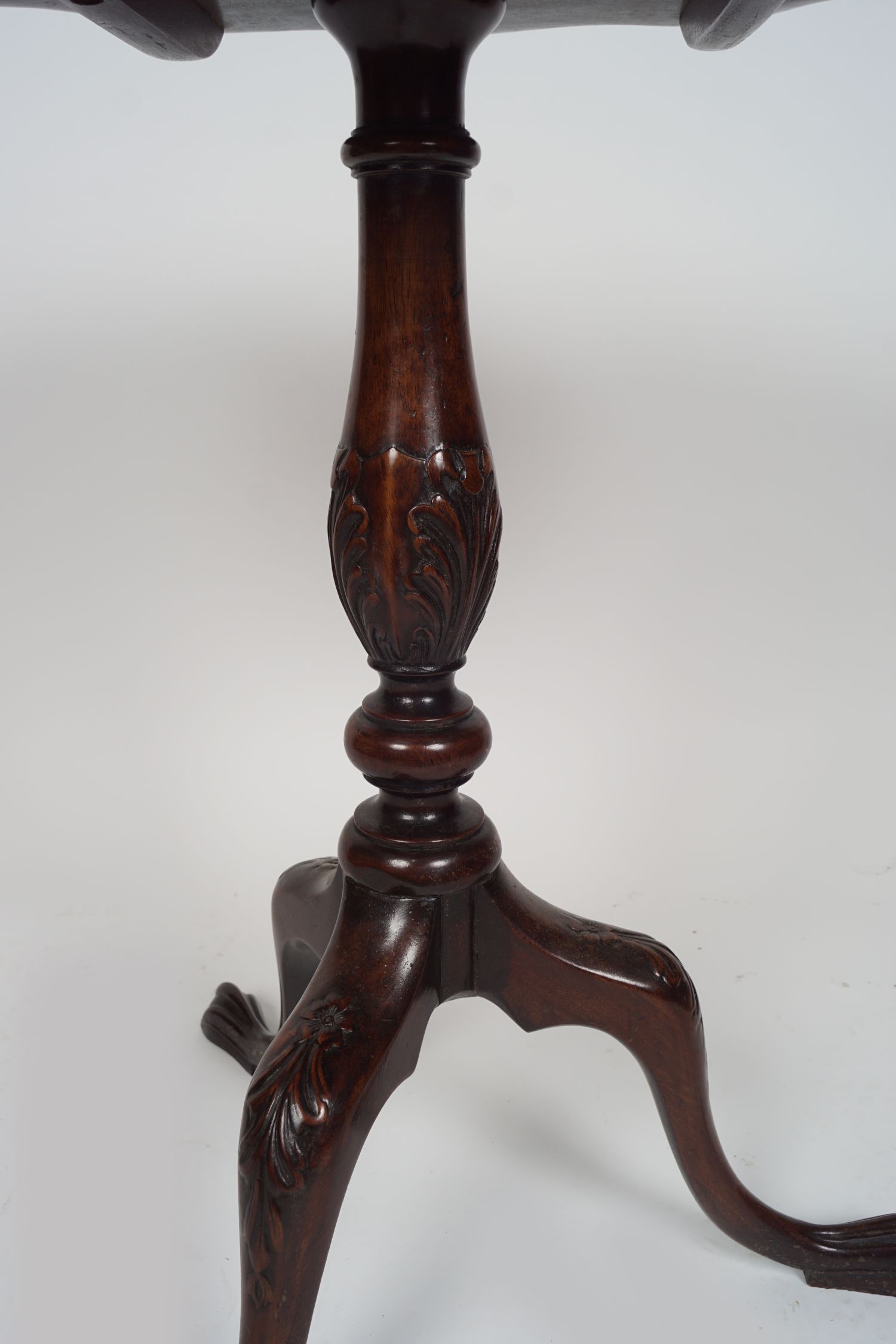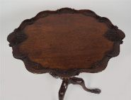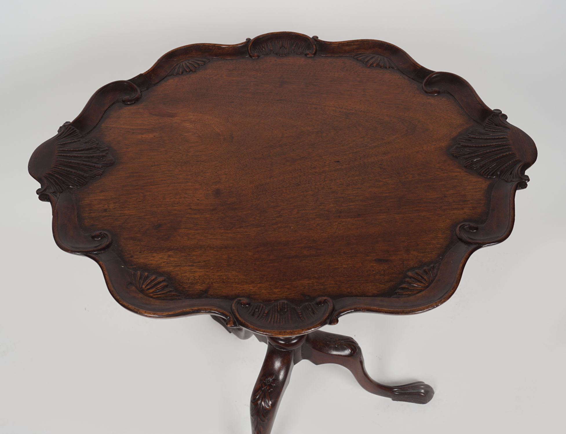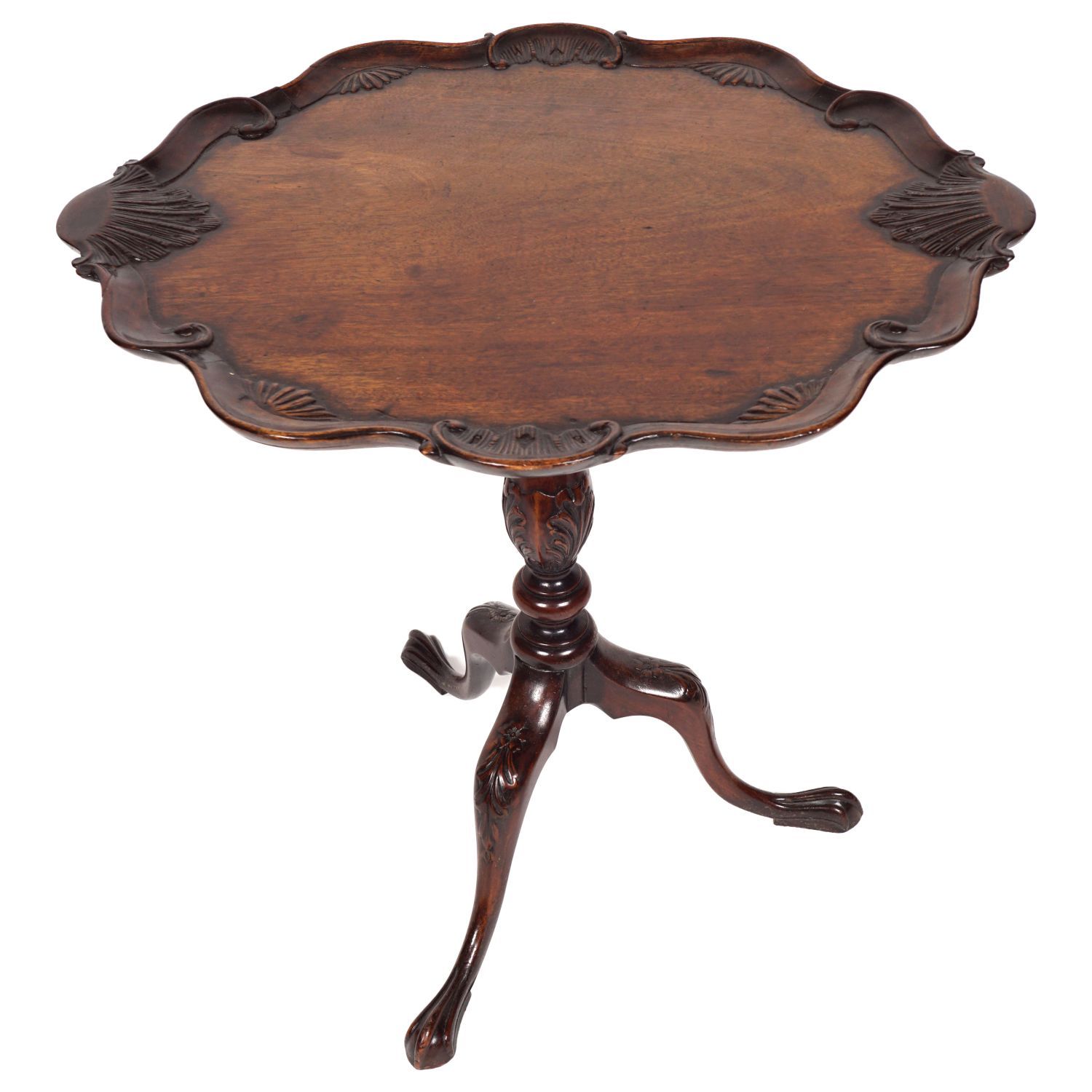 the oval pie crust and scallop shell bordered top, raised on a turned stem and scroll legged pod terminating on slippered feet.