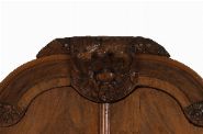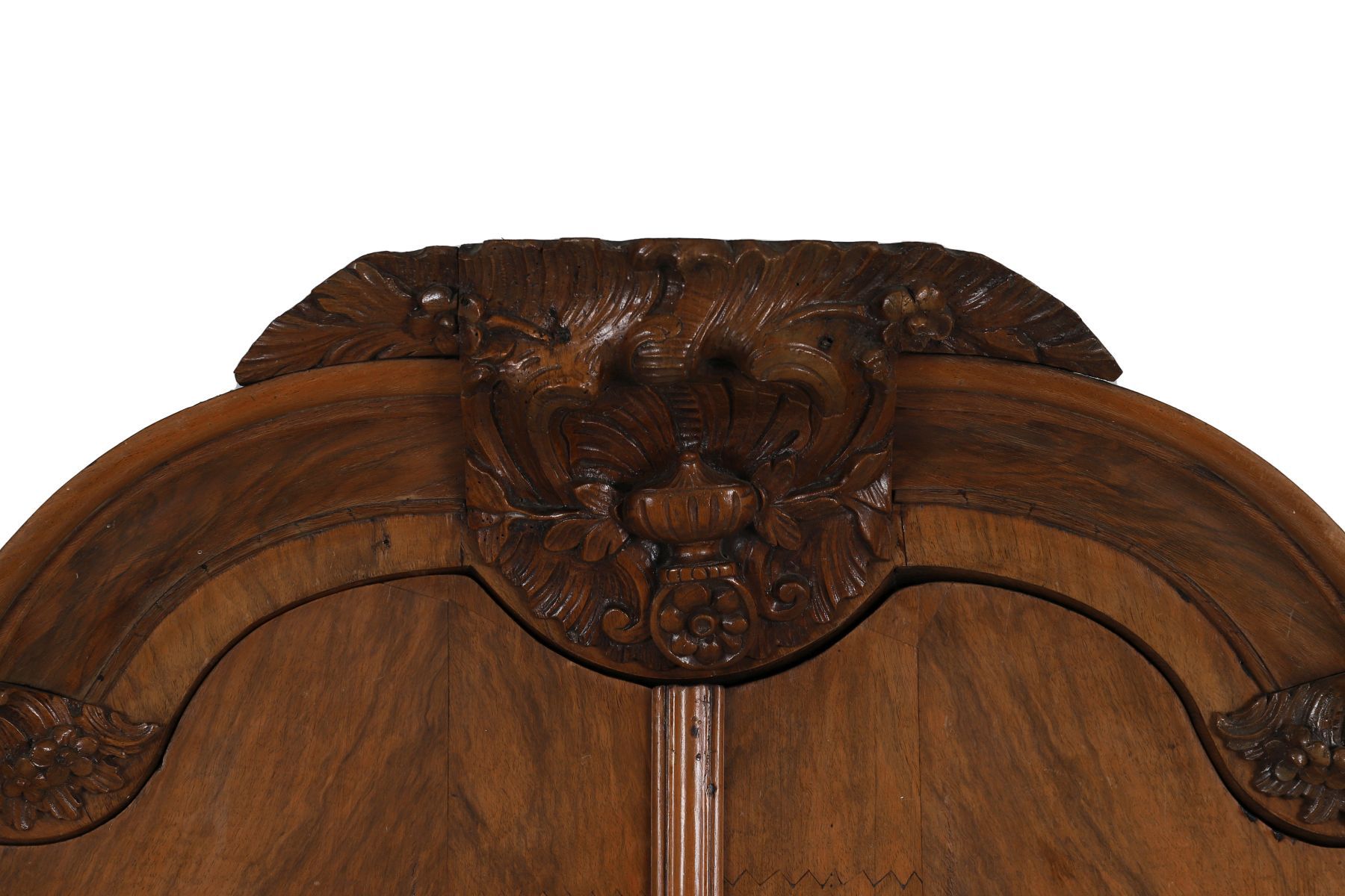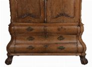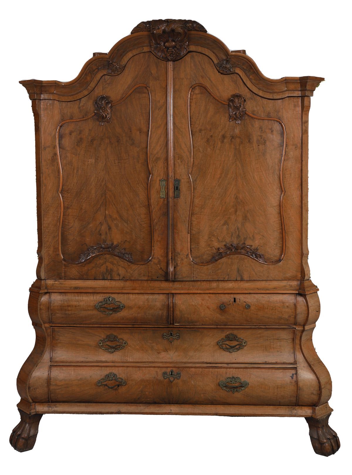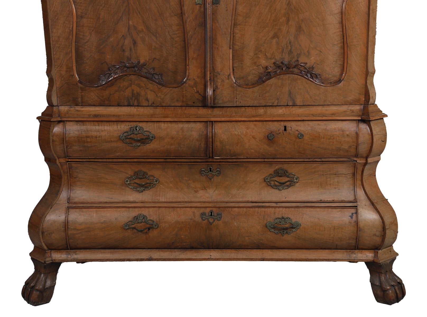the superstructure with a serpentine arched crown, above 2 well figured panelled doors enclosing shelves. The projecting bombe shaped base of 2 short and 2 long drawers furnished with ornate brass handles, raised on claw feet.