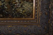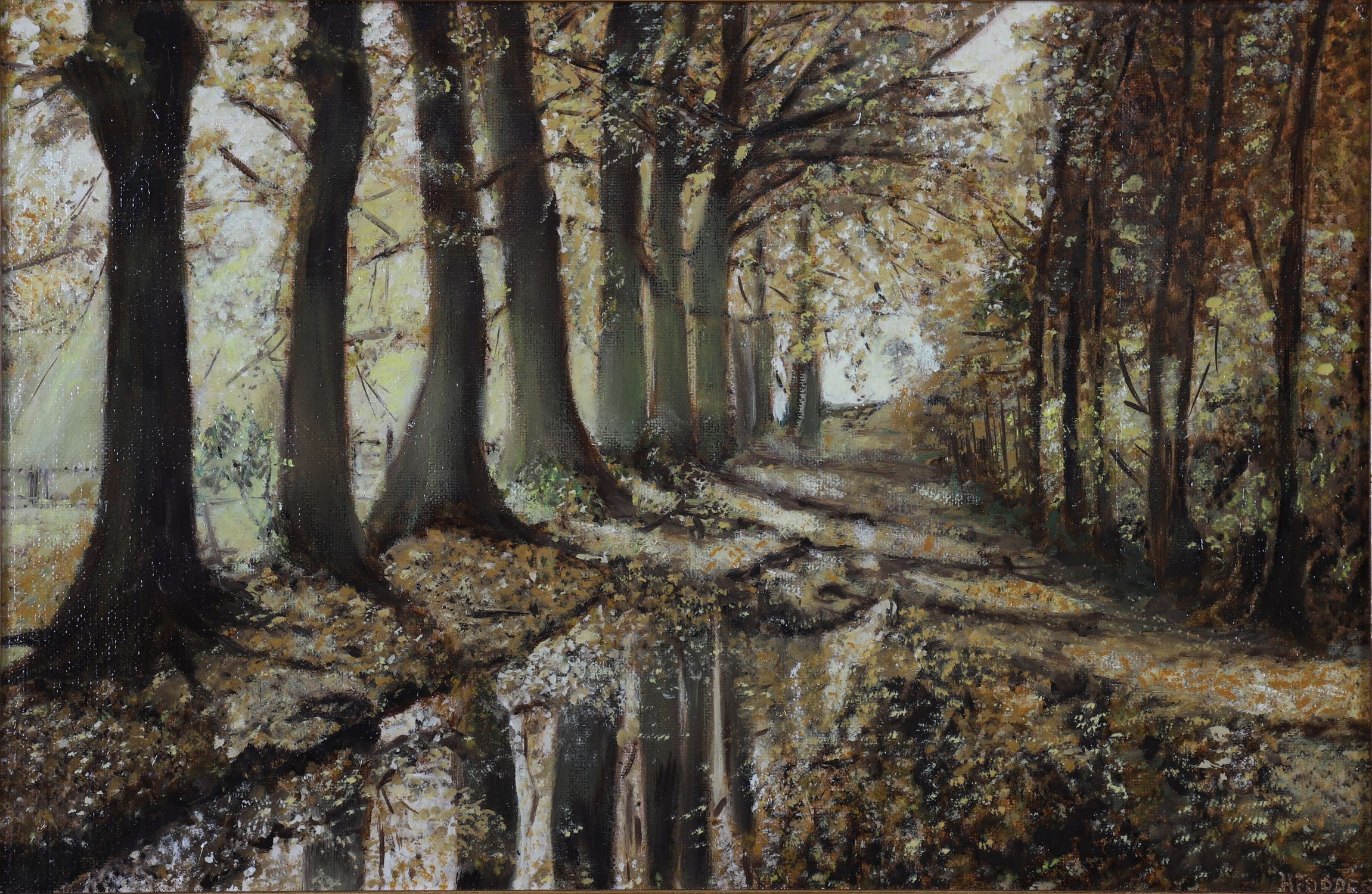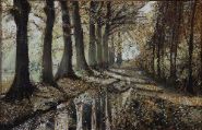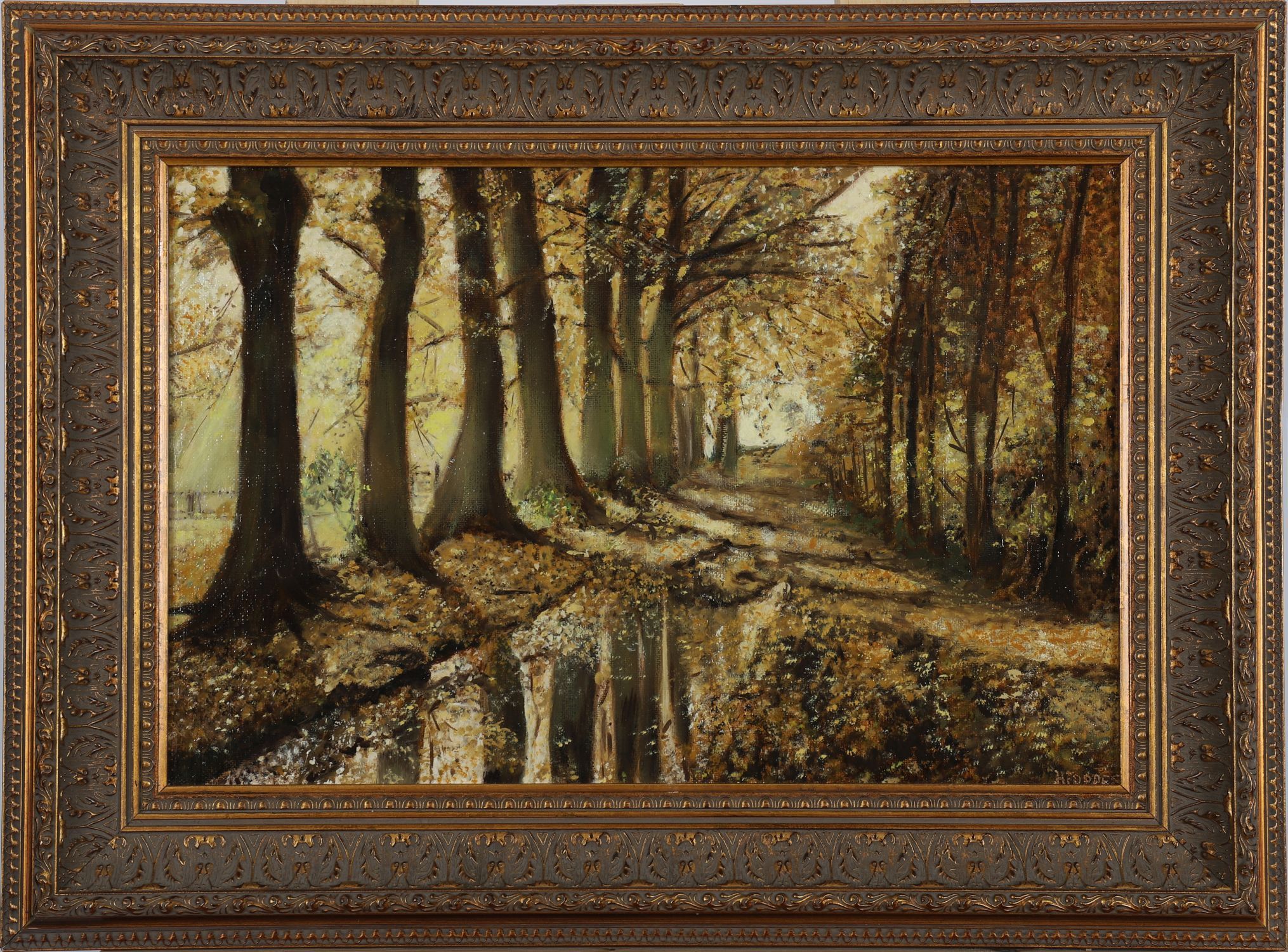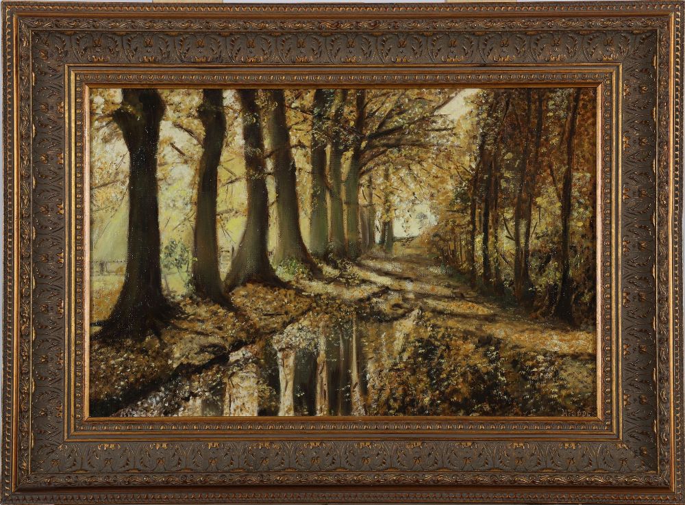 Oil on canvas, depicting a tree-lined woodland path with golden autumn tones and reflective water. Housed in a decorative gilt frame.