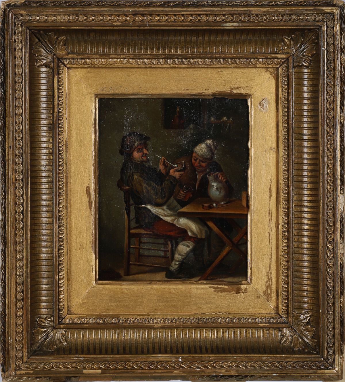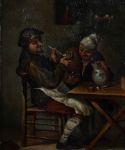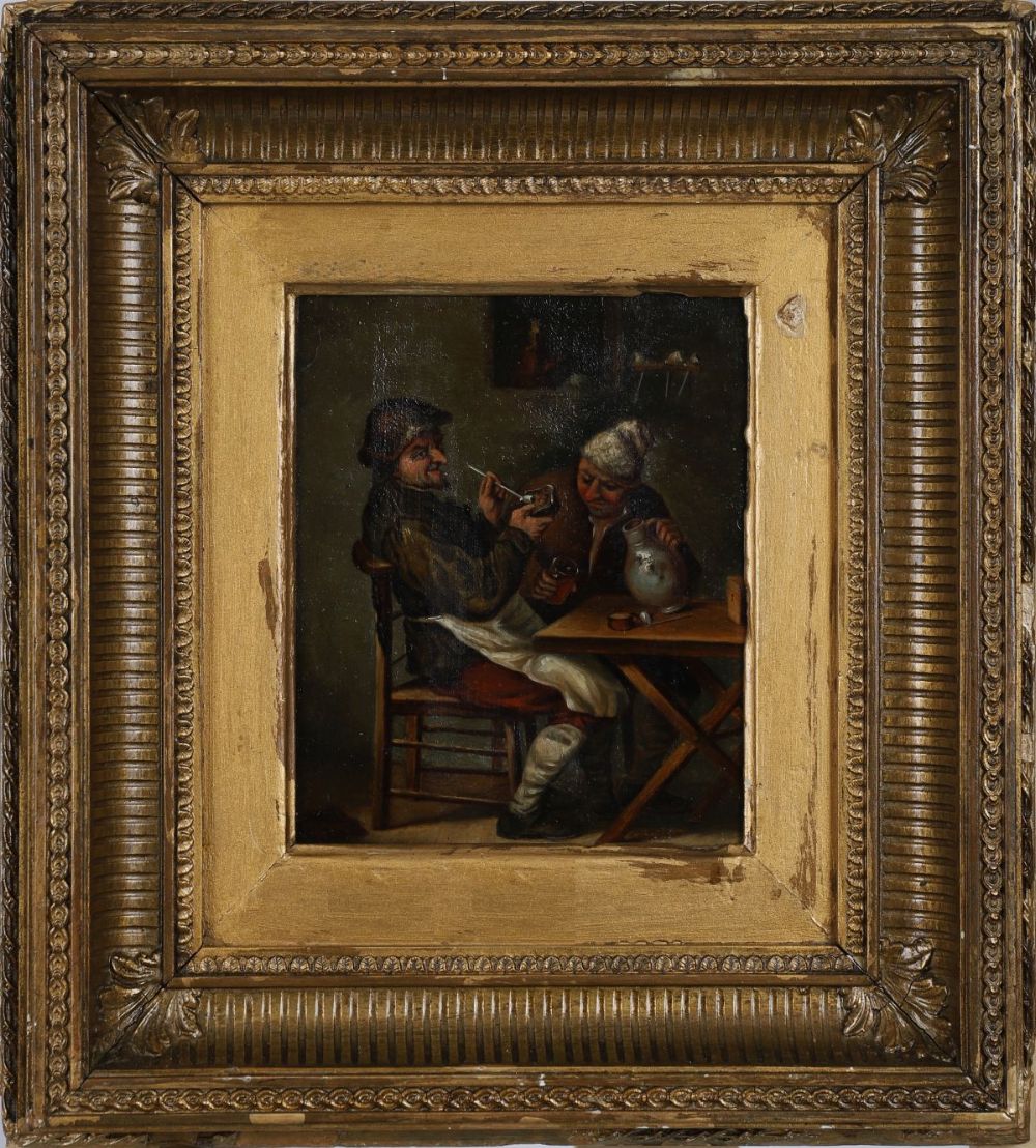 A Continental oil painting depicting two male figures in an interior, one smoking a pipe, the other drinking. Executed in a rustic tavern genre style. Framed in a moulded gilt frame. Oil on canvas.