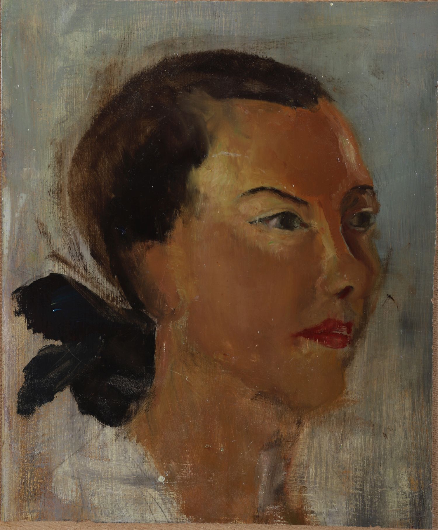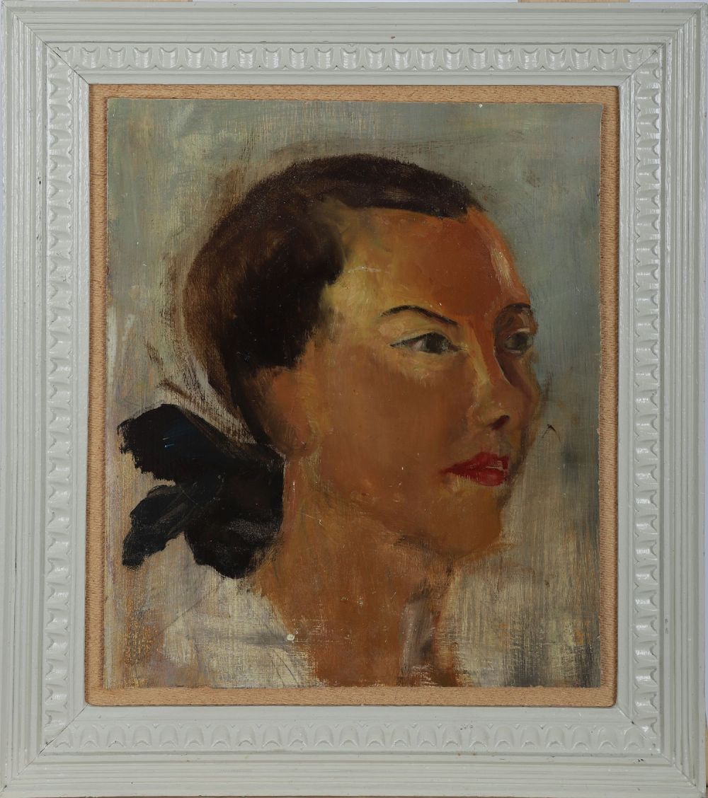 A head-and-shoulders oil study of a young woman with dark hair tied back, presented in a painted decorative frame. Oil on panel.