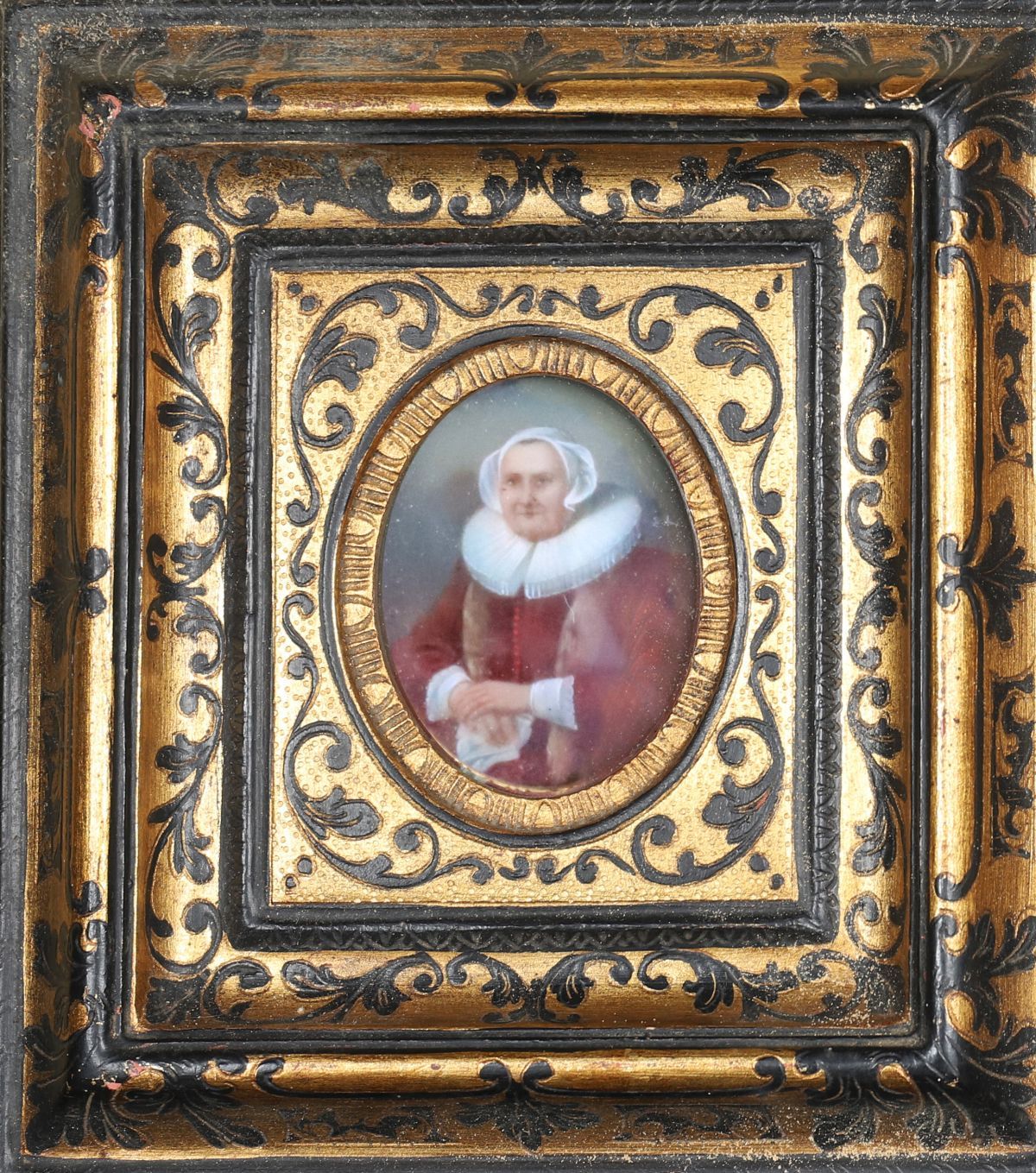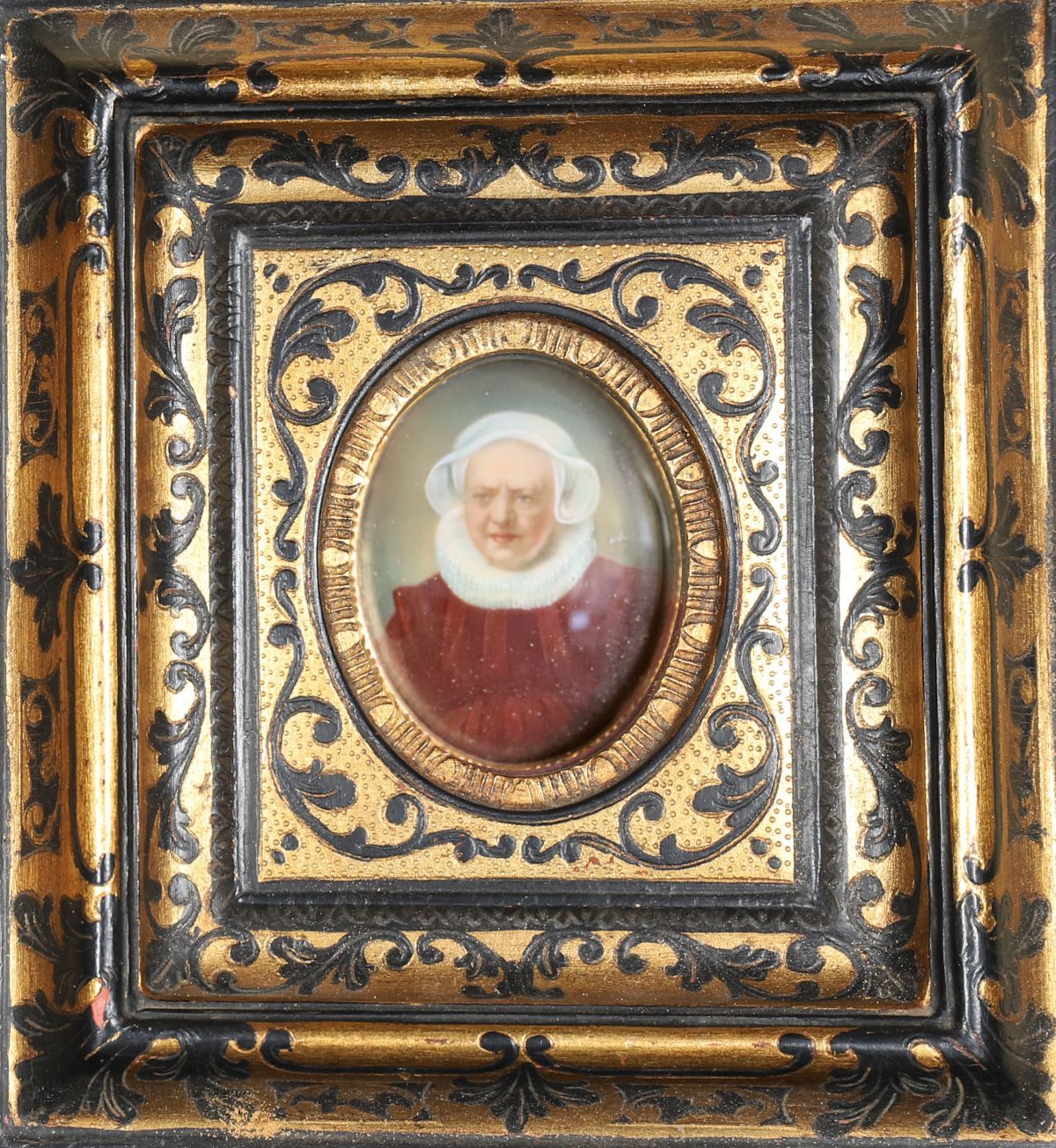 Pair of Dutch School miniature portraits, each depicting a bust-length figure, enclosed in parcel-gilt and ebonised frames. 18th / early 19th century.