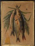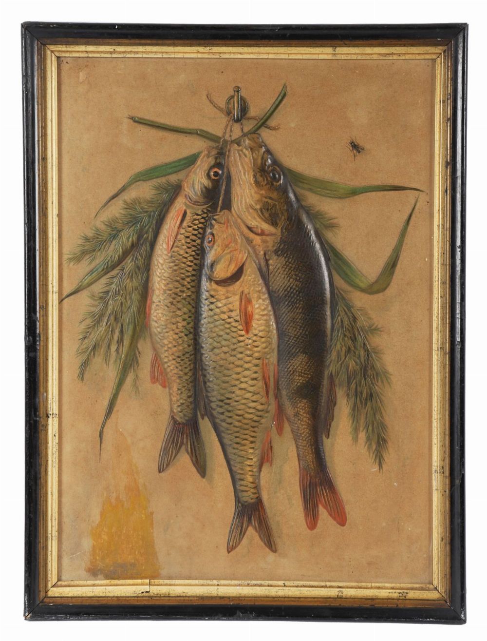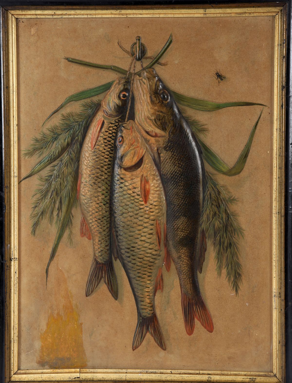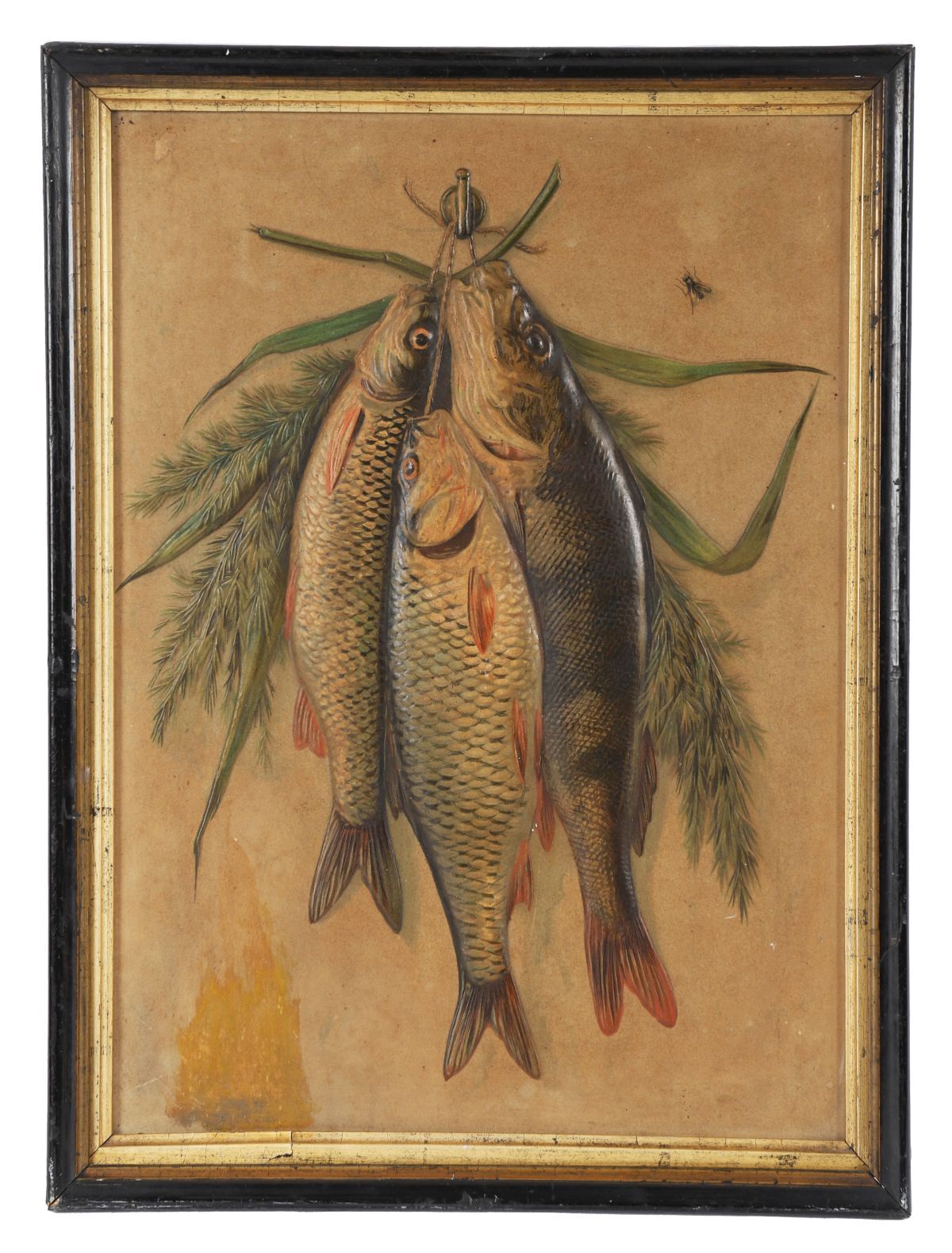 A Dutch school cameo-impressed card still life depicting three hanging fish with foliage, circa 1880, in period-style frame.