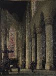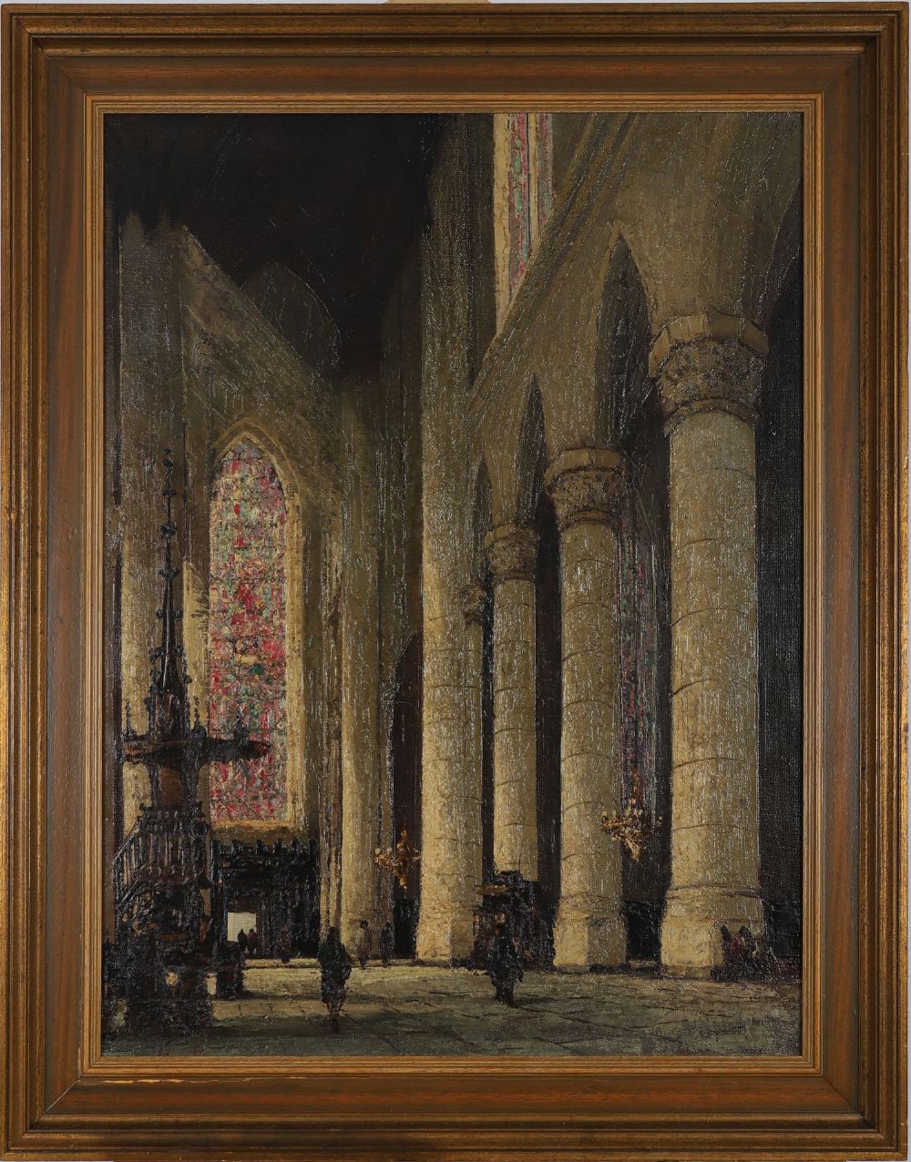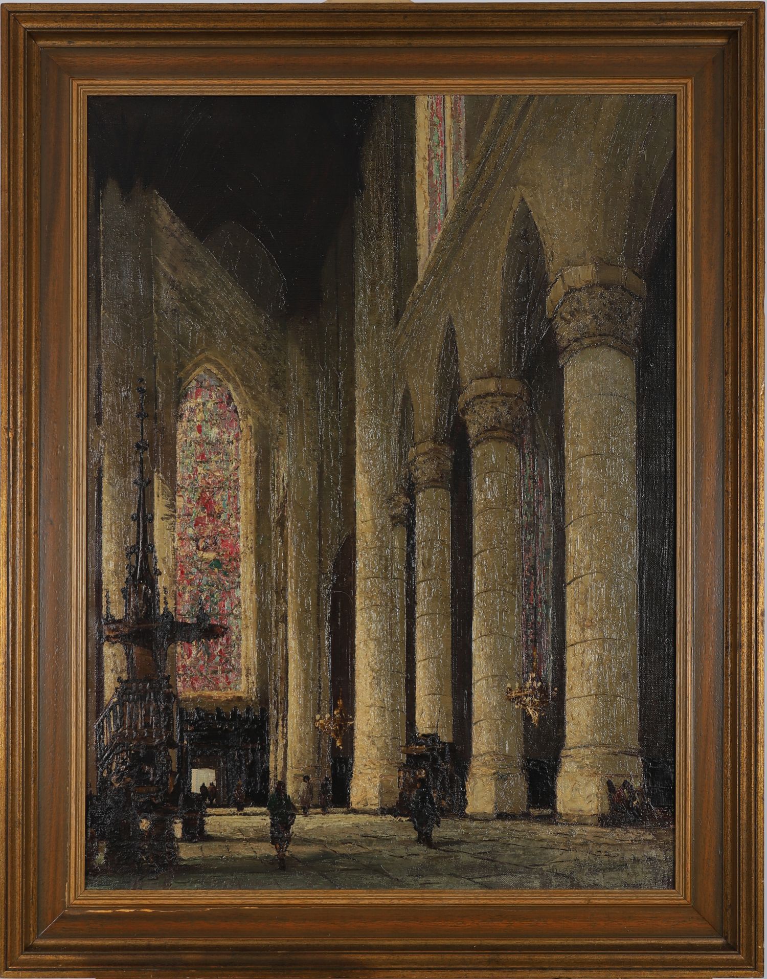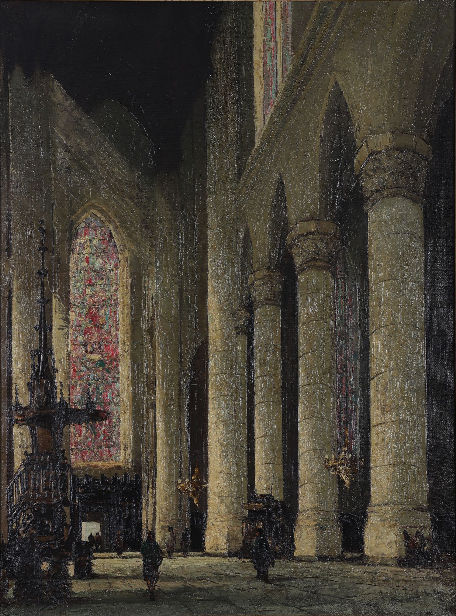 Oil on canvas depicting a Gothic cathedral interior with soaring pillars and stained-glass windows. Detailed execution with figures in the nave. Oil on canvas. Framed.