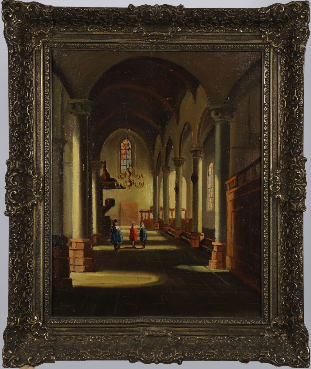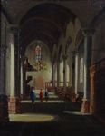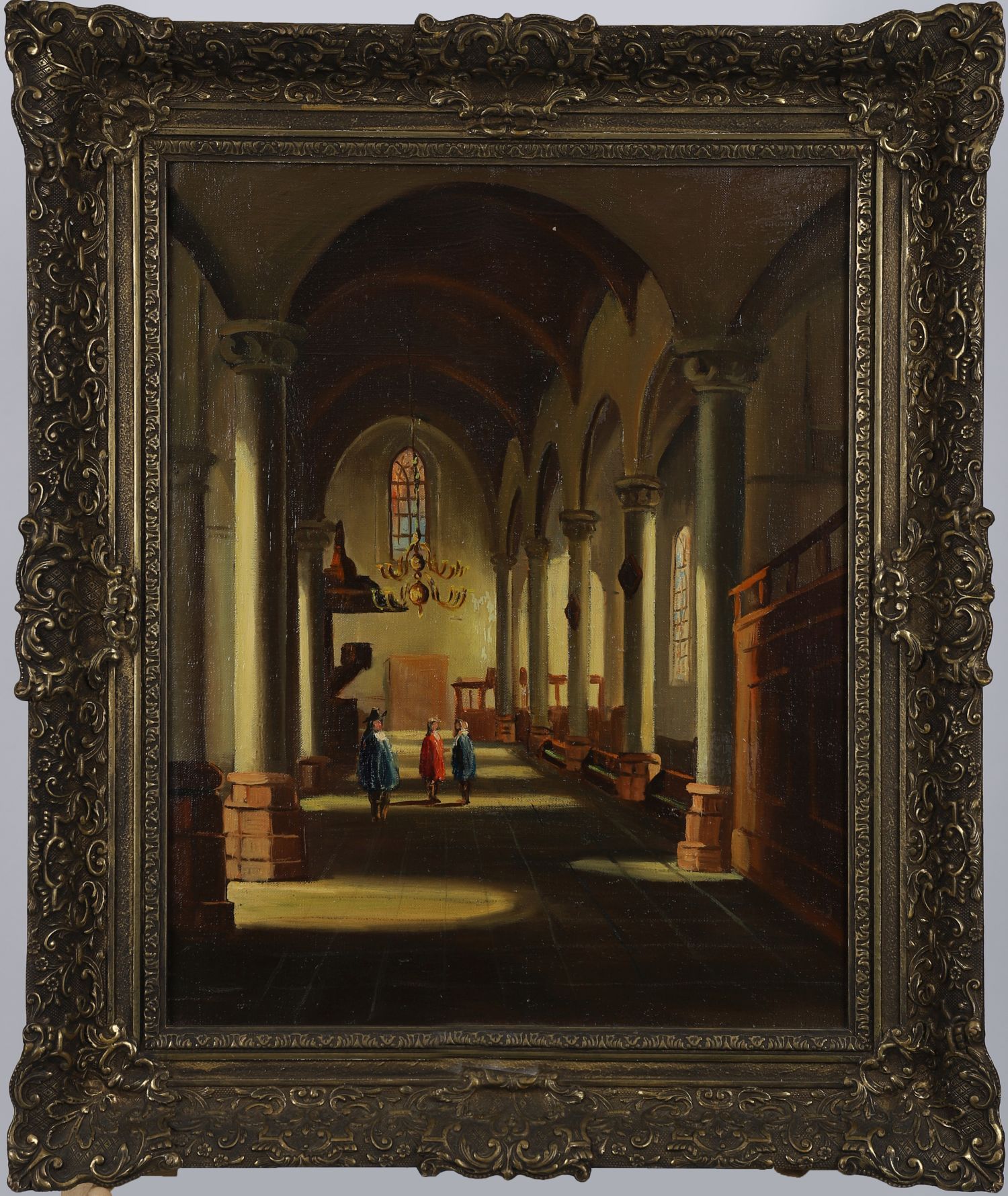 Atmospheric oil painting of a church interior with vaulted arches, columns, and chandeliers, showing three robed figures walking in the nave. Oil on canvas. Enclosed in a gilt frame.