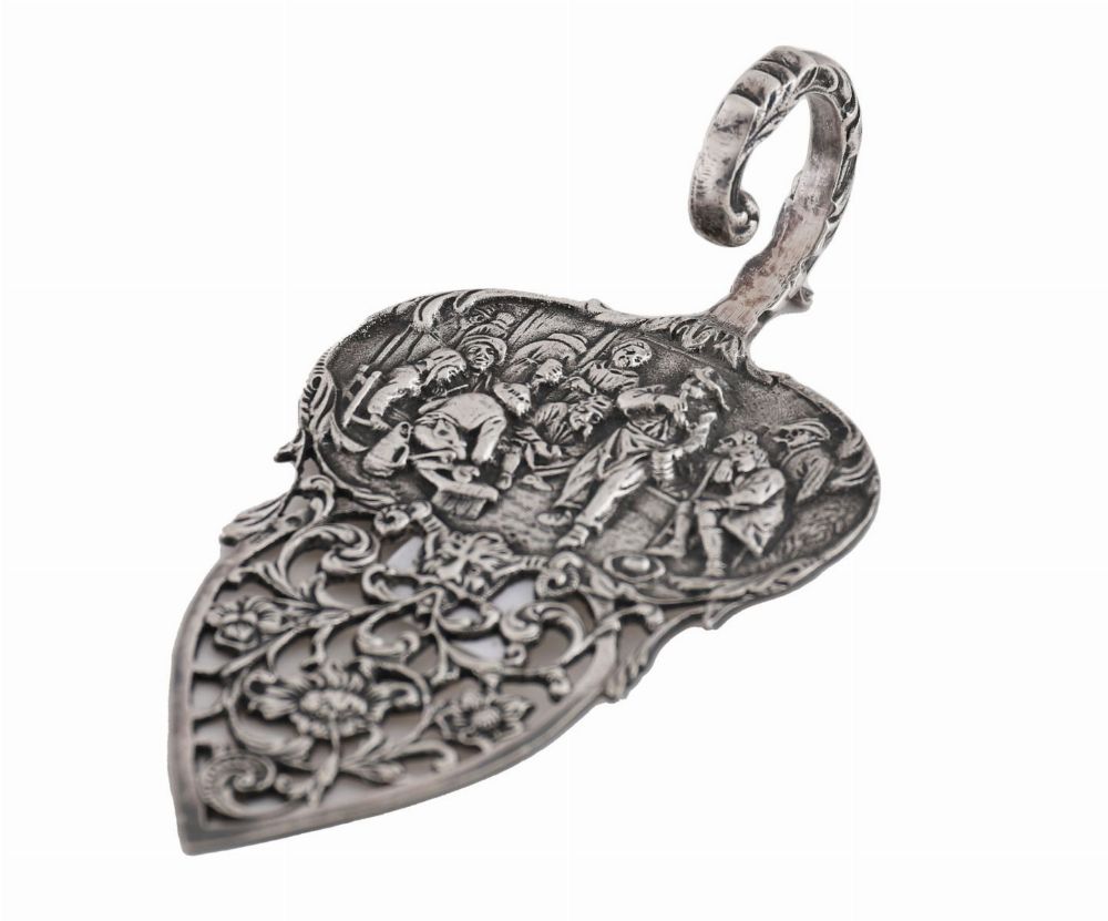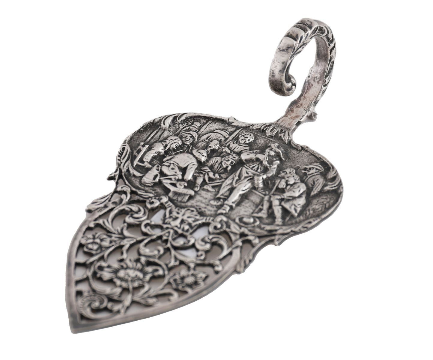 A Dutch silver cake server with pierced and repoussé decoration depicting figural and foliate scenes. 46 grams