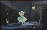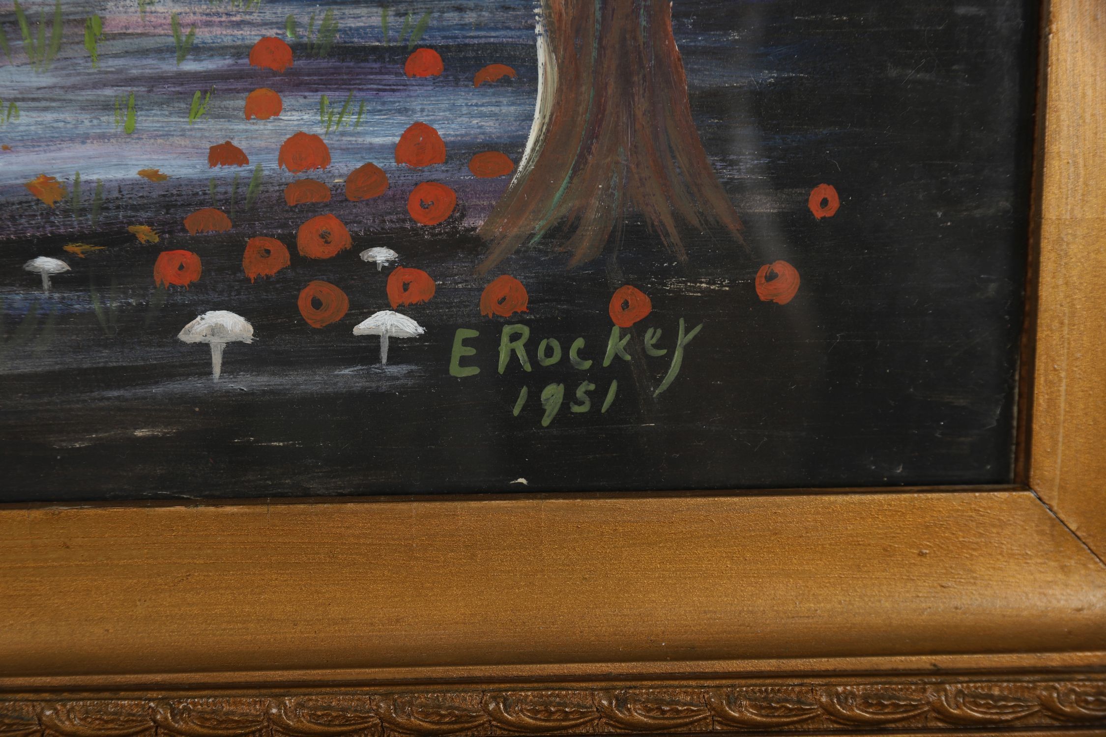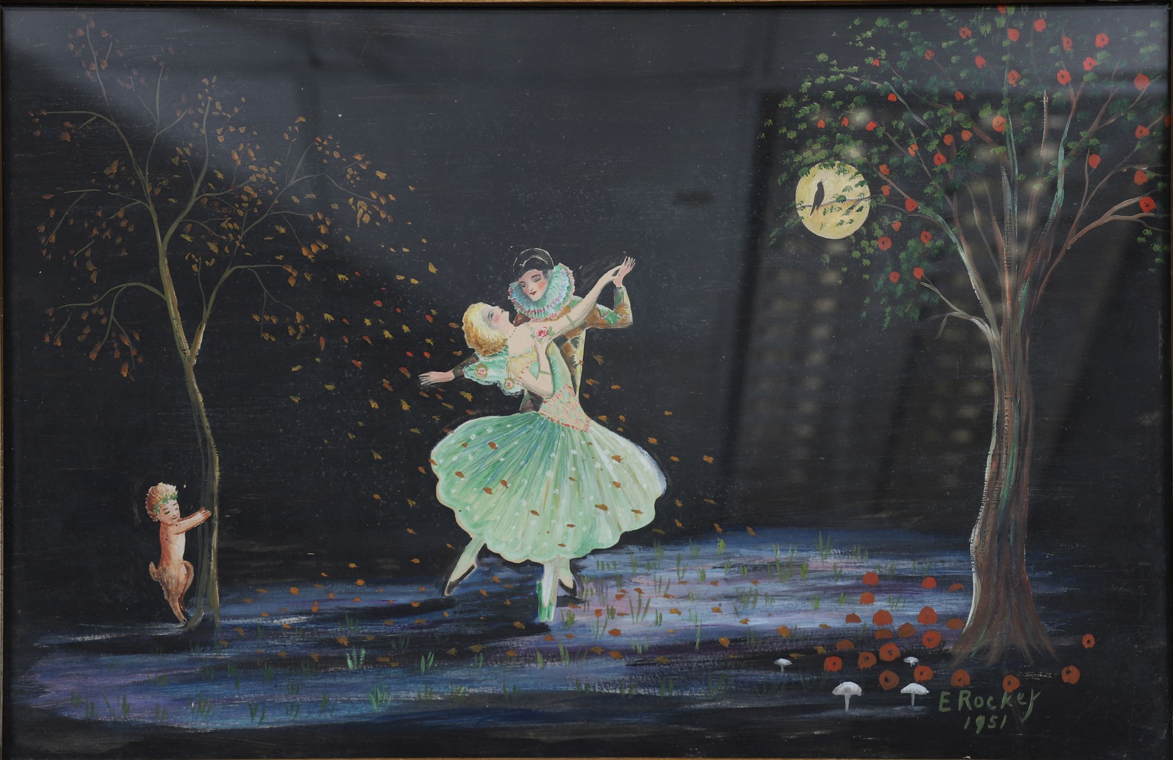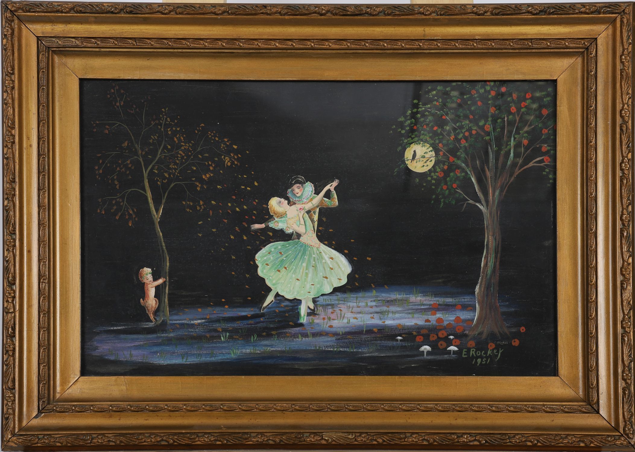 A whimsical painting of two ballet dancers in a moonlit woodland clearing, accompanied by a cherub and surrounded by stylised trees and flowers. Signed and dated lower right “E. Rockey, 1951â€. Dated 1951. Enclosed in a gilt frame. Oil on board.