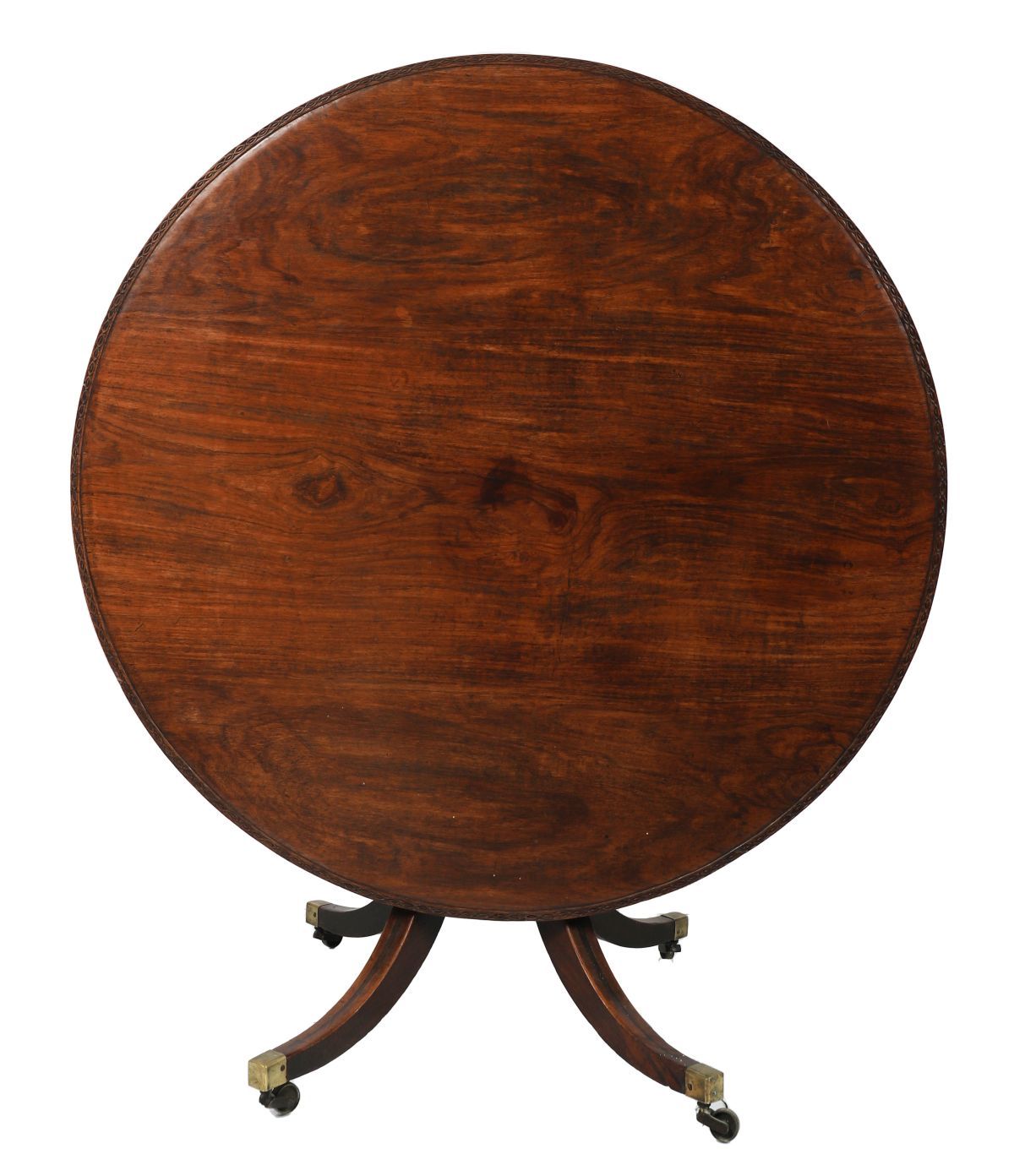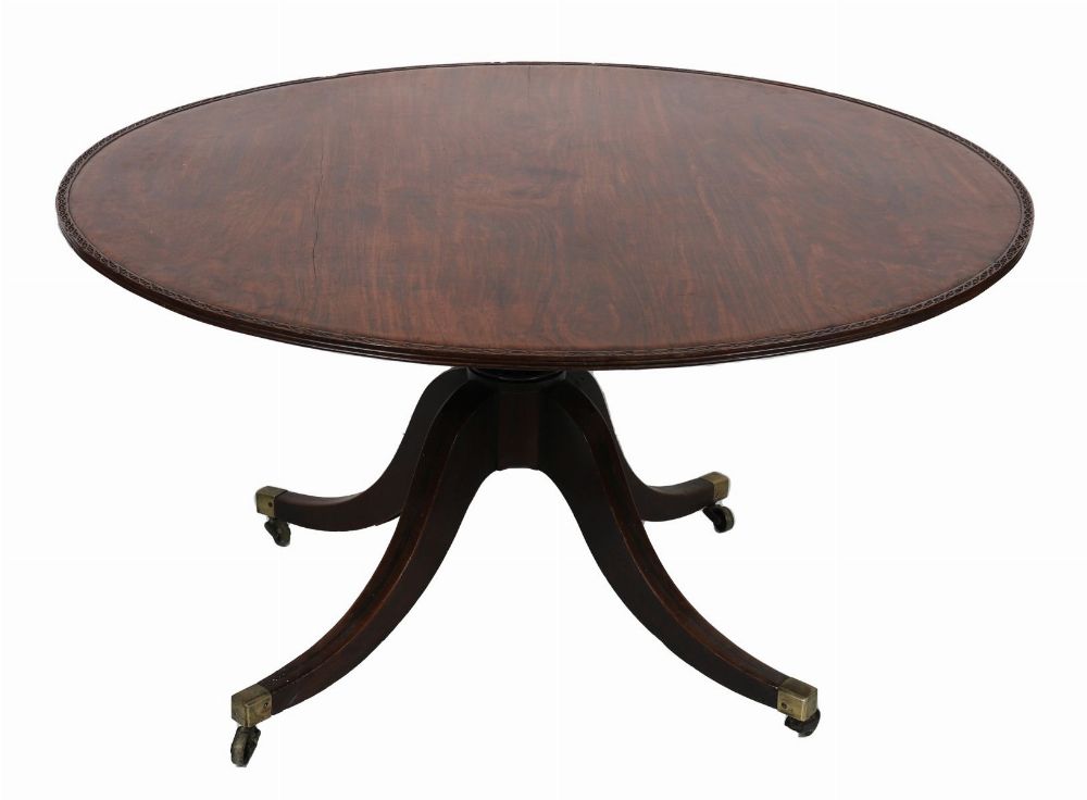 An early 19th-century Anglo-Indian circular hardwood dining table, the solid top with a moulded edge, raised on a baluster-turned central stem issuing four downswept legs terminating in brass caps and castors.