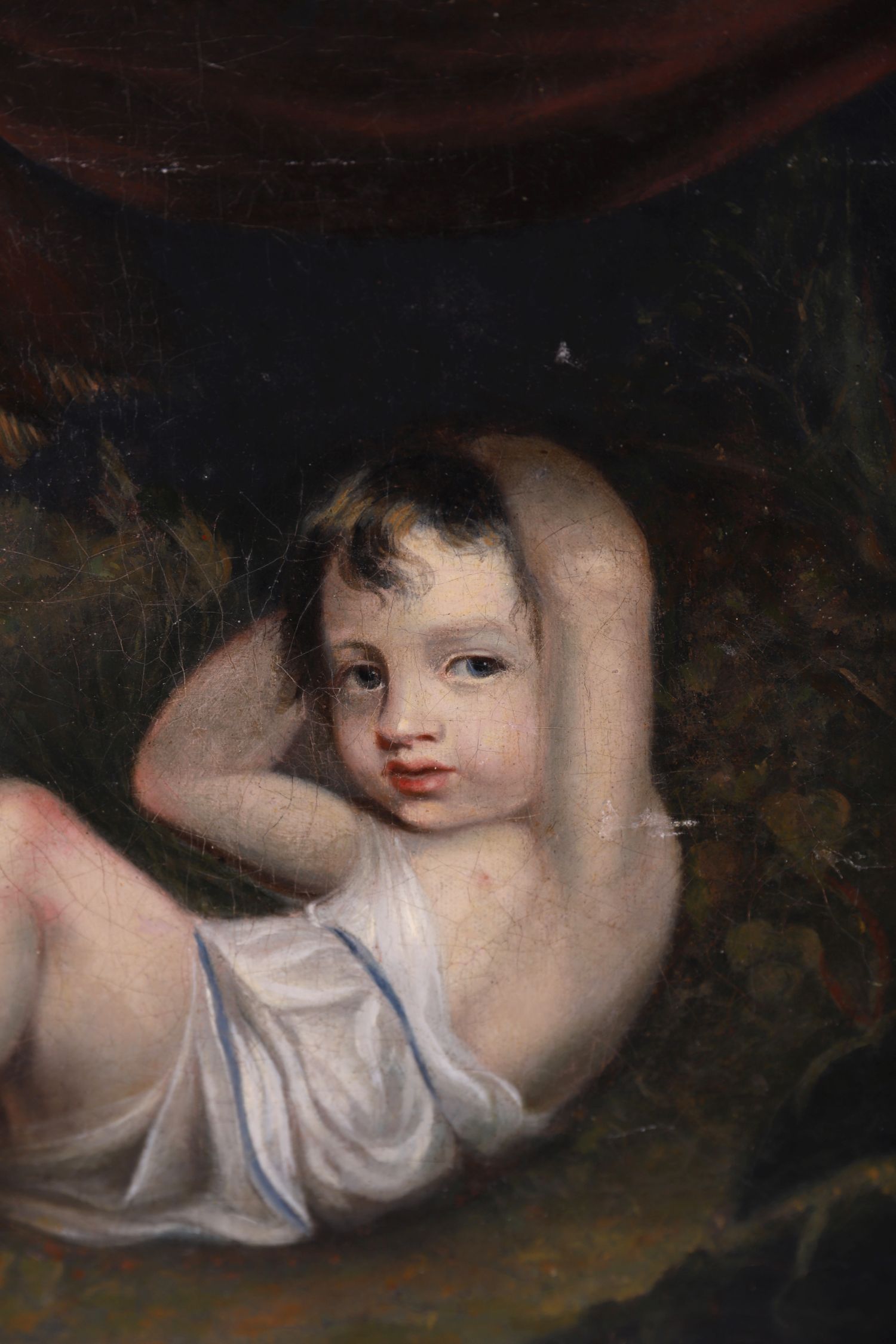 Charming neoclassical-style portrait of a child reclining in a draped setting. Attributed to Richard Westall, known for literary and classical subjects.