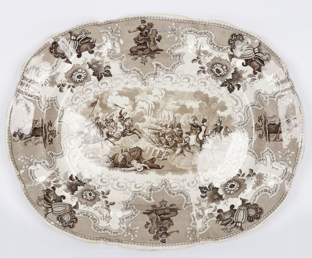 An early 19th century Staffordshire earthenware platter, printed in sepia with a central scene of “The Battle of the Pyramids,” Napoleon’s decisive 1798 victory in Egypt. Border decorated with floral reserves and cartouches of military trophies.